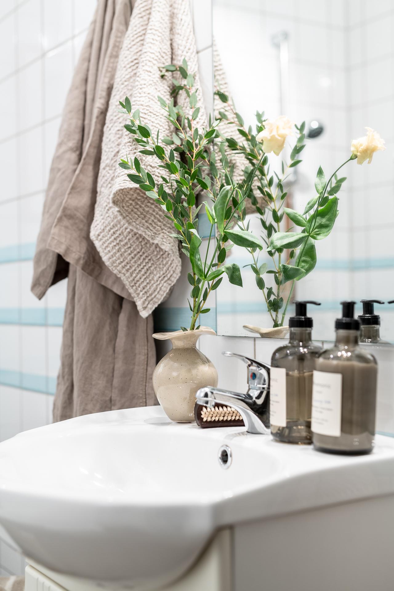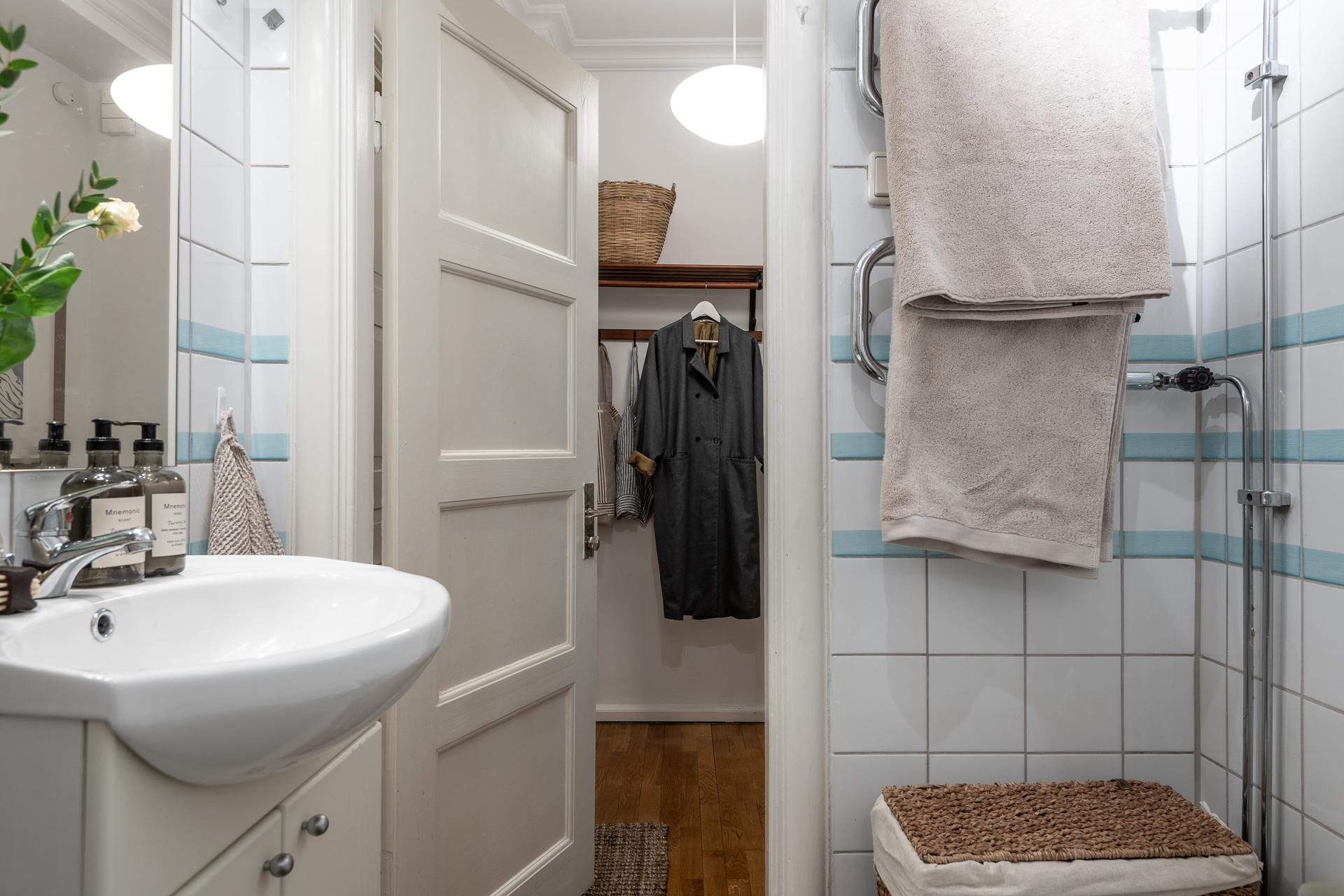 I anslutning till hallen ligger badrummet som är helkaklat och förhållandevis rymligt för en bostad av denna storlek. Här finns badkar för avkopplande bad under kalla vinterdagar samt en handdukstork som håller handdukarna torra och varma. Badrummet renoverades i samband med stambytet 1987 och har fräschats upp med wc-stol, handfat, belysning och blandare. Väggarna är kaklade i vitt och på golvet ligger ljusbeige klinker. För den som önskar finns möjlighet att byta badkaret mot duschväggar och installera tvättpelare.