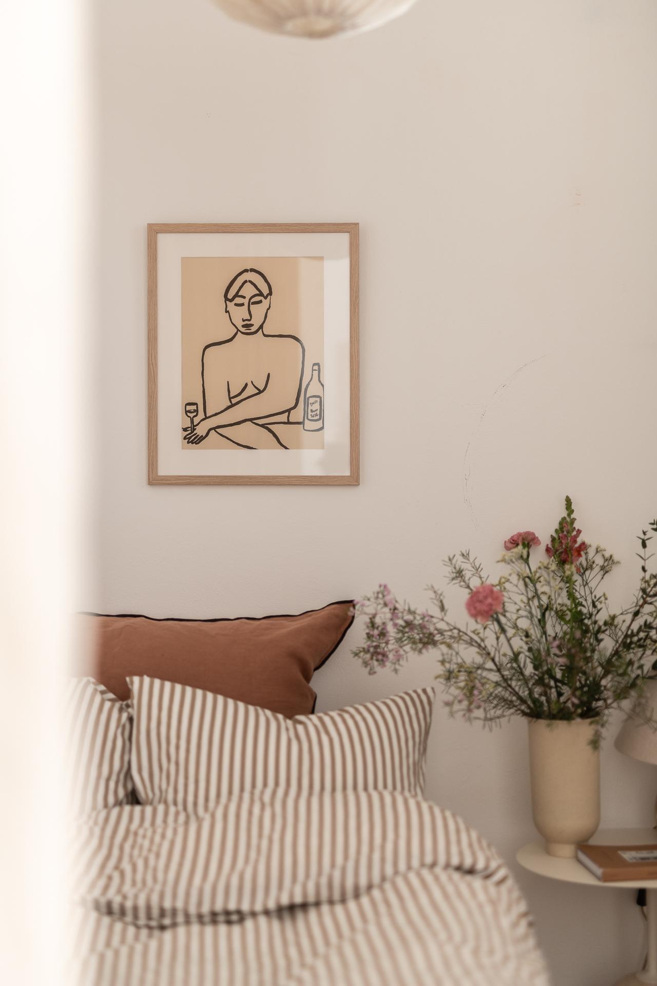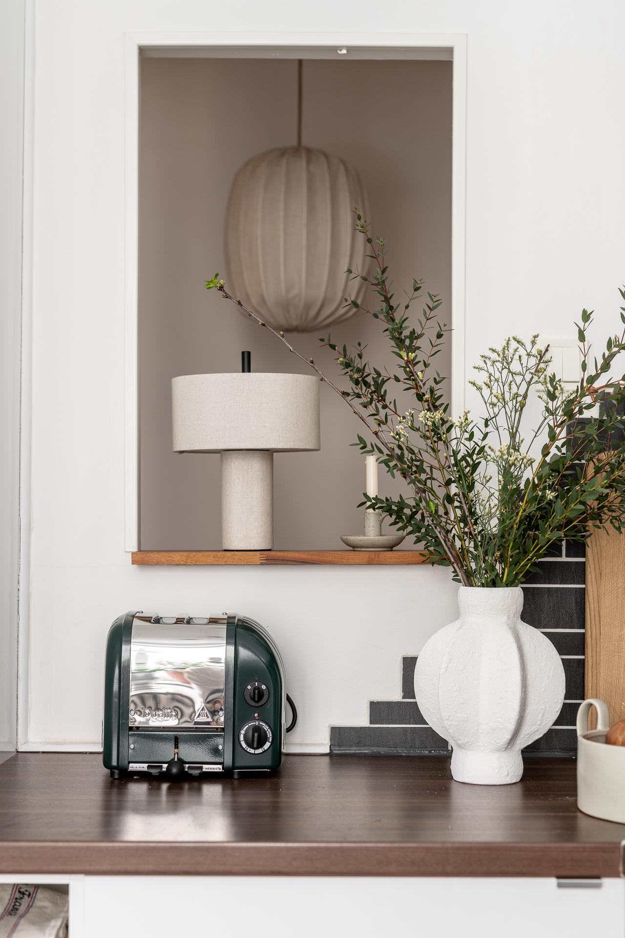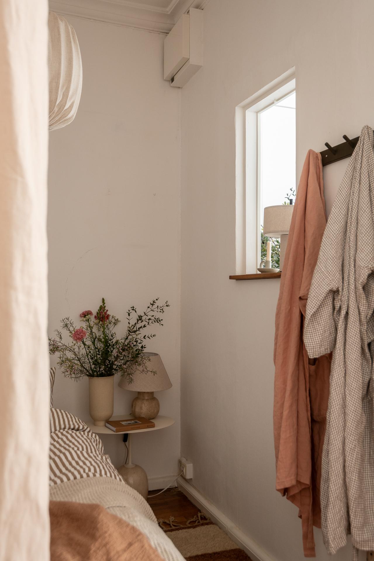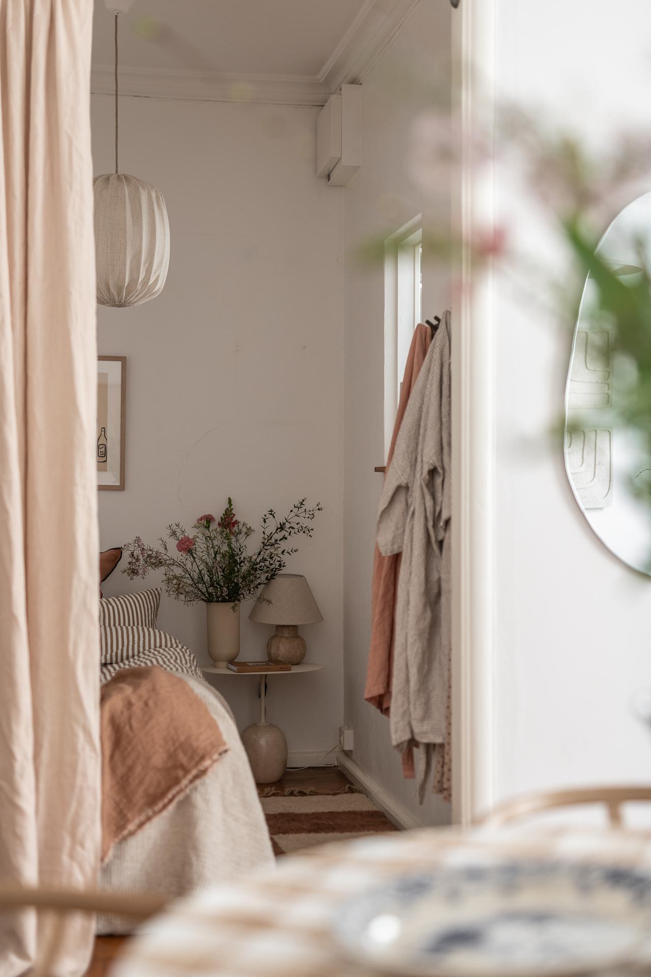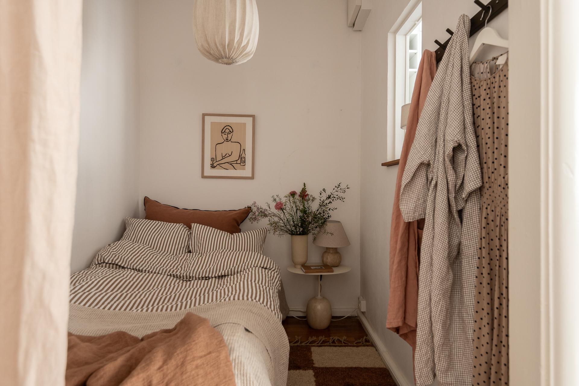 Bakom en diskret gardin finns en mycket trivsam sovalkov med plats för dubbelsäng och ett mindre sängbord. Väggarna är målade i en mjuk bruten vit nyans och golvet pryds av vacker stavparkett i ek. Alkoven bidrar till känslan av en smart planerad mini-tvåa. Mellan sovalkoven och köket finns dessutom en mindre öppning i väggen som släpper in ljus och skapar god luftcirkulation.
