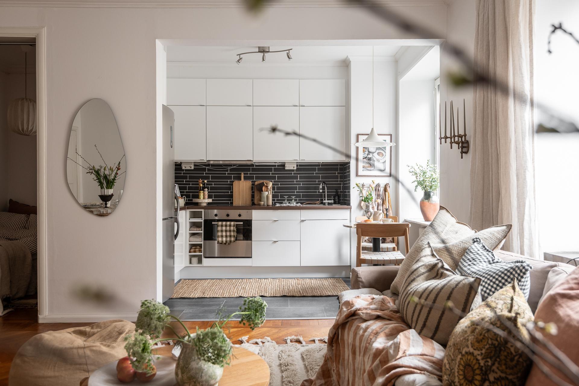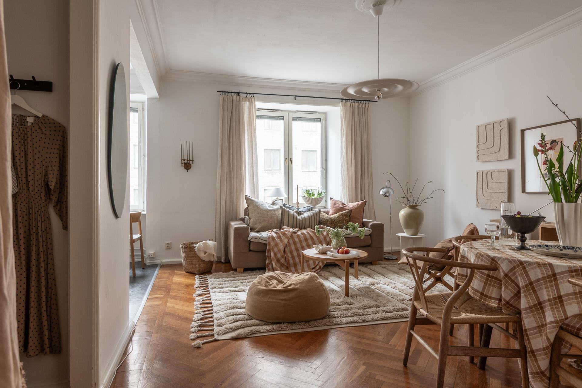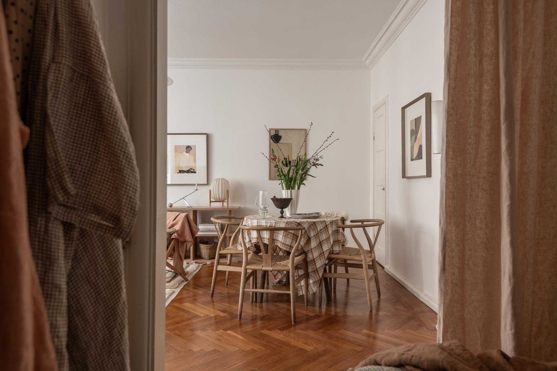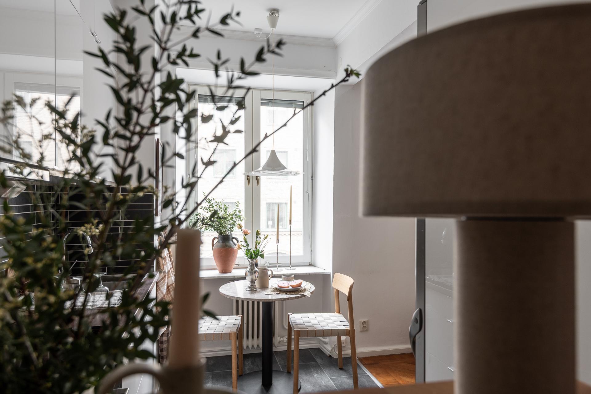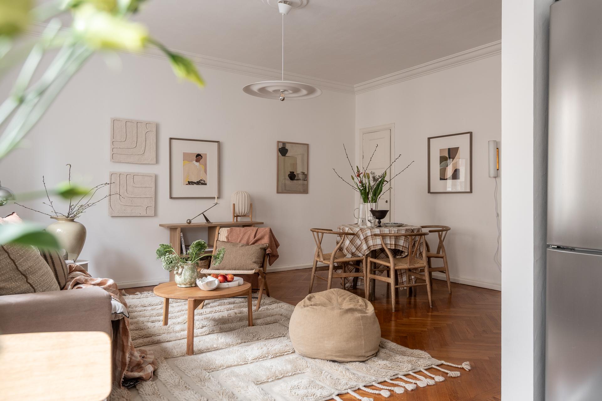 Allrummet är ljust och luftigt med fönster mot lugna Alfhemsgatan och en glimt av Rosengatan samt Slottsskogens grönska. Djupa fönsternischer med fönsterbänkar i massiv sten, elegant stuckatur, takrosett och oljad ekparkett i fiskbensmönster skapar en klassisk atmosfär – precis som man förväntar sig i en fastighet från 1930-talet. Tack vare sovalkoven finns gott om plats för både soffgrupp, läshörna och arbetsplats. Ägaren har även öppnat upp delar av väggen mellan vardagsrum och kök, vilket ger bostaden en luftig och social planlösning. I ett hörn finns dessutom en praktisk klädkammare bakom en vacker profilerad dörr.