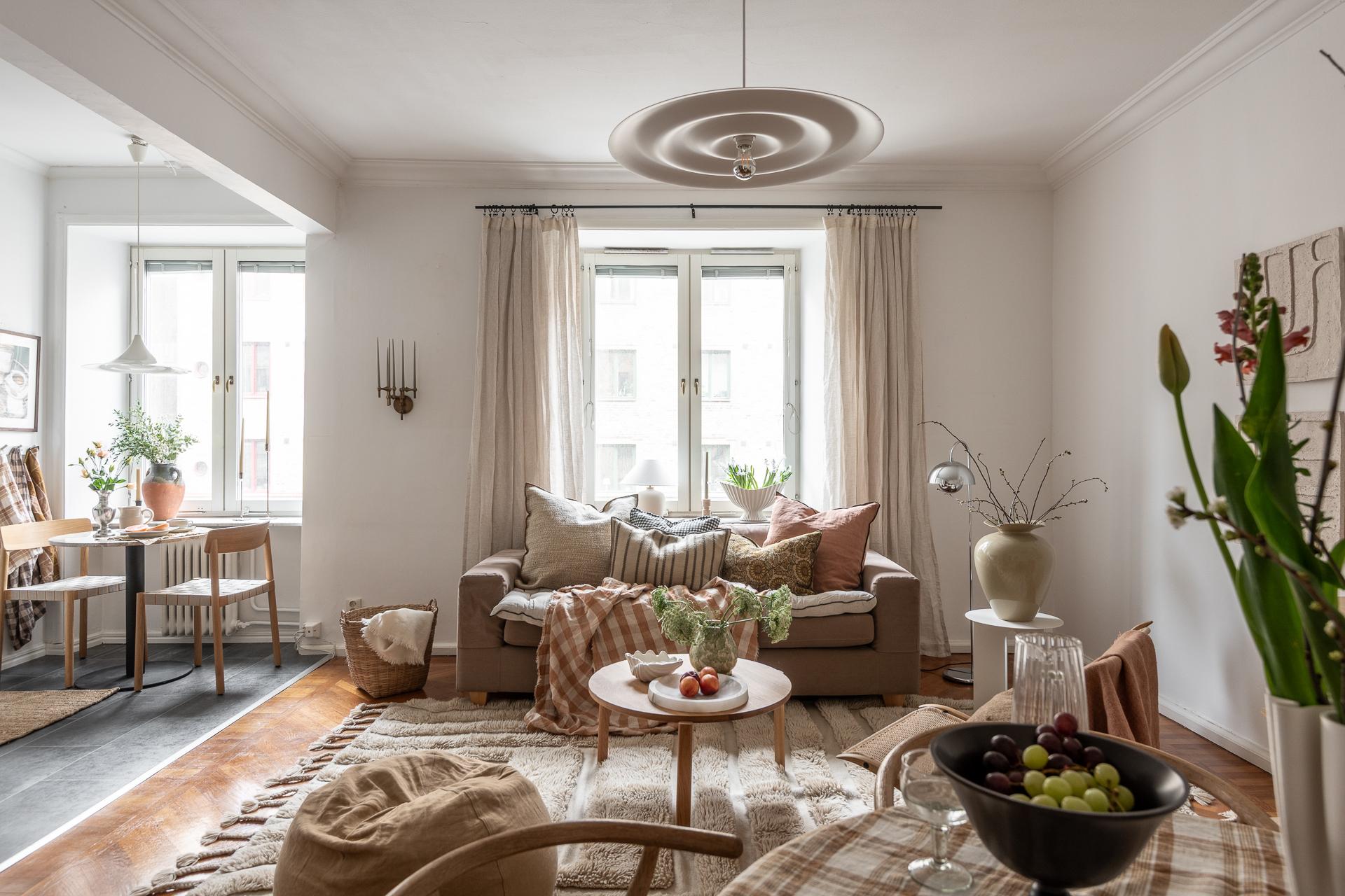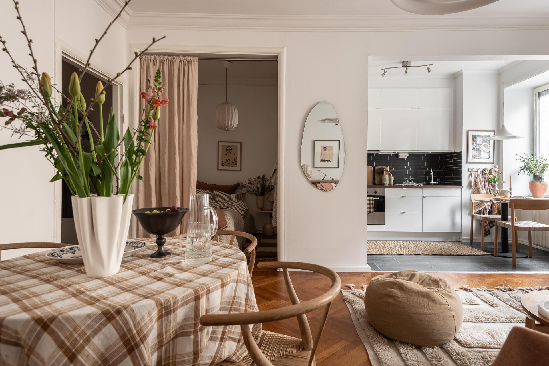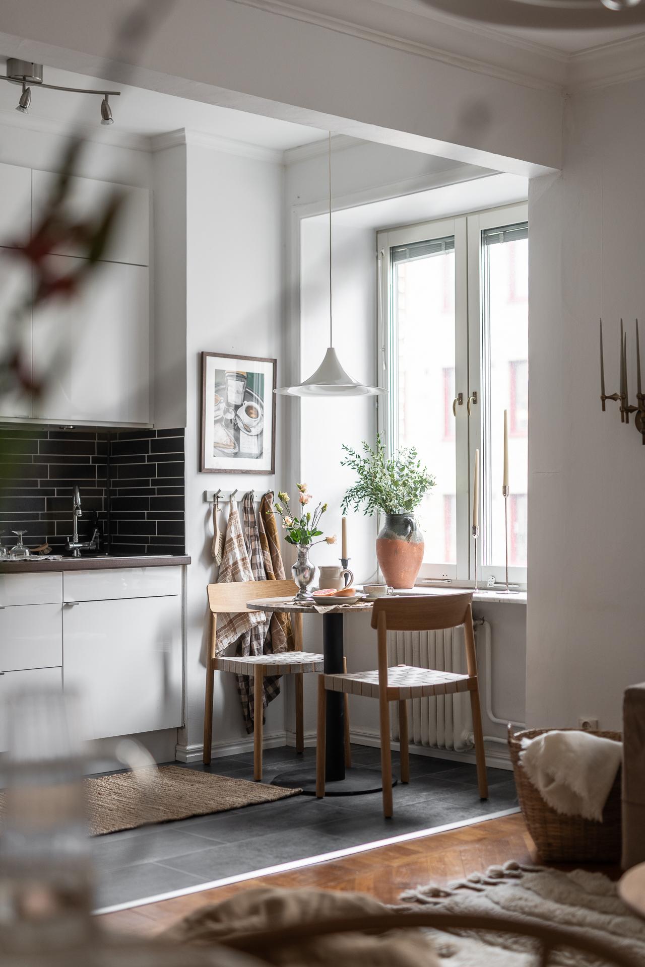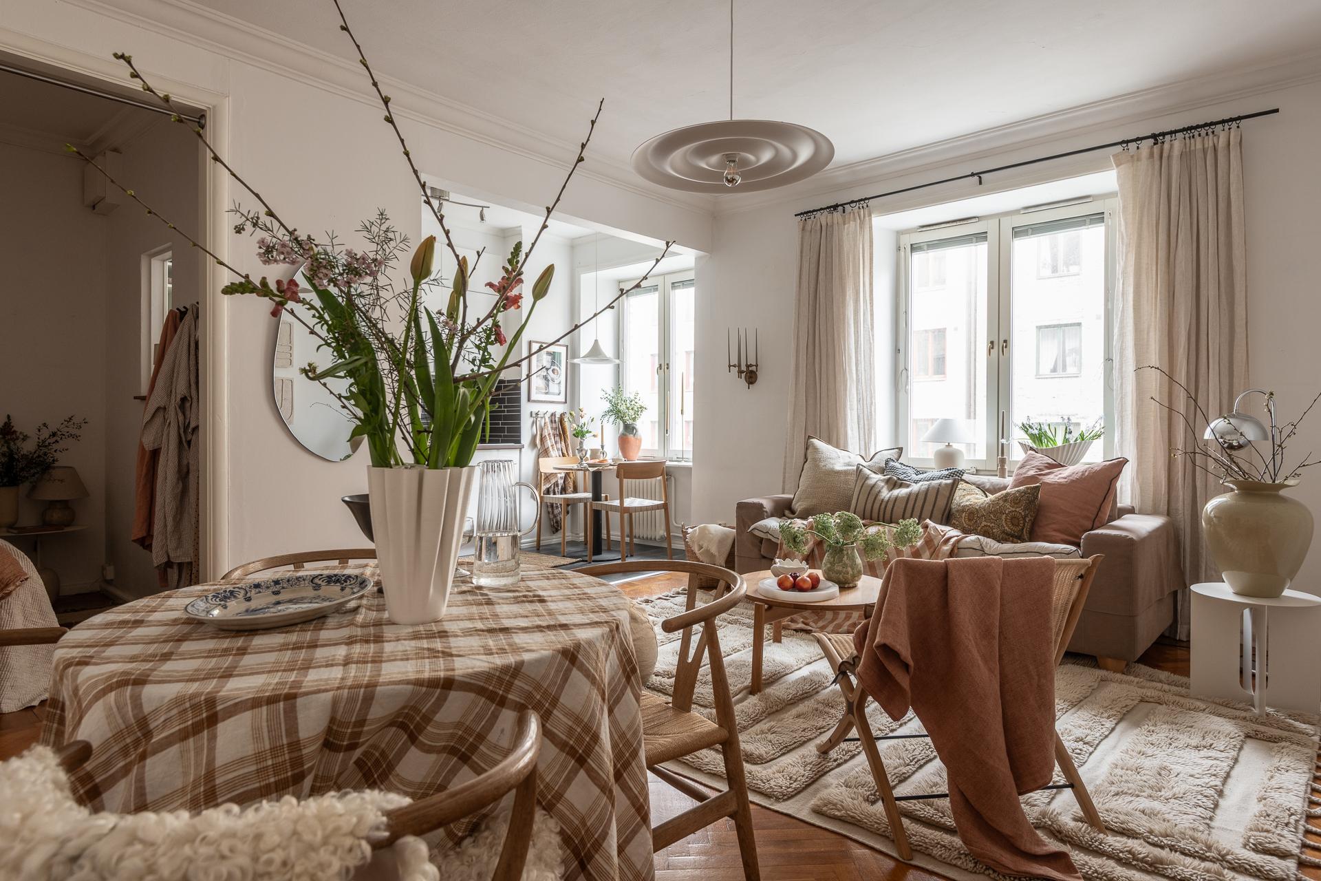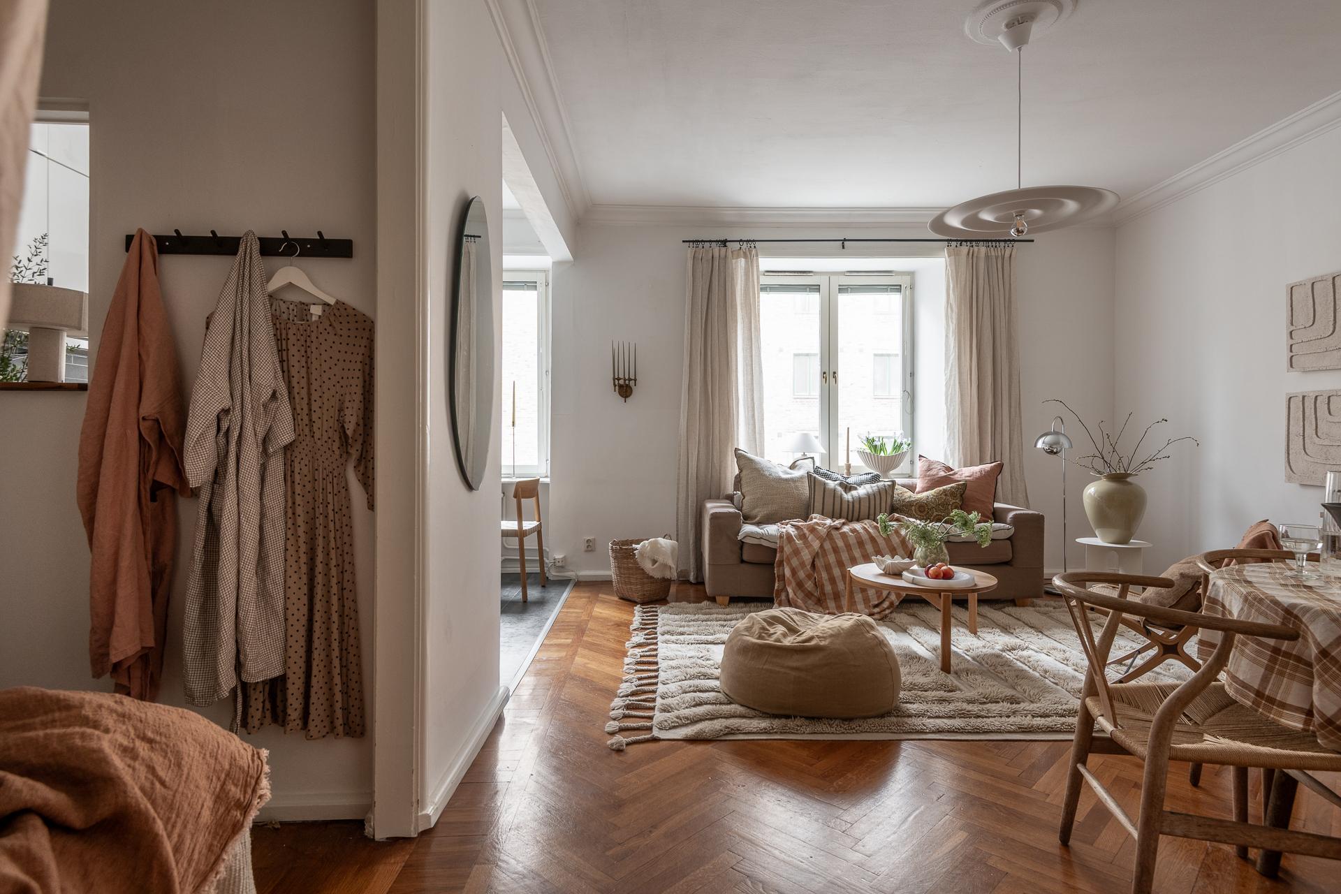 Allrummet är ljust och luftigt med fönster mot lugna Alfhemsgatan och en glimt av Rosengatan samt Slottsskogens grönska. Djupa fönsternischer med fönsterbänkar i massiv sten, elegant stuckatur, takrosett och oljad ekparkett i fiskbensmönster skapar en klassisk atmosfär – precis som man förväntar sig i en fastighet från 1930-talet. Tack vare sovalkoven finns gott om plats för både soffgrupp, läshörna och arbetsplats. Ägaren har även öppnat upp delar av väggen mellan vardagsrum och kök, vilket ger bostaden en luftig och social planlösning. I ett hörn finns dessutom en praktisk klädkammare bakom en vacker profilerad dörr.