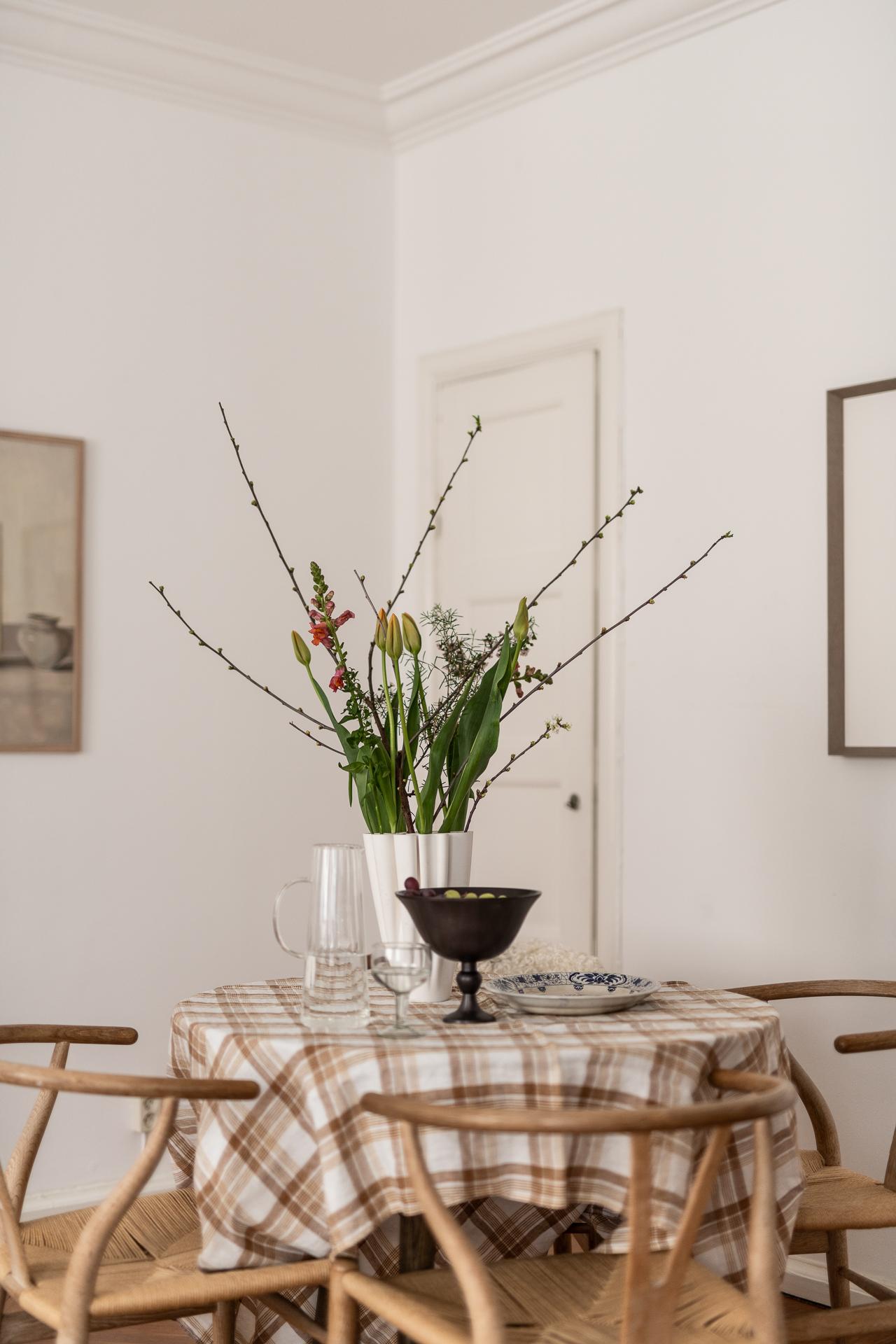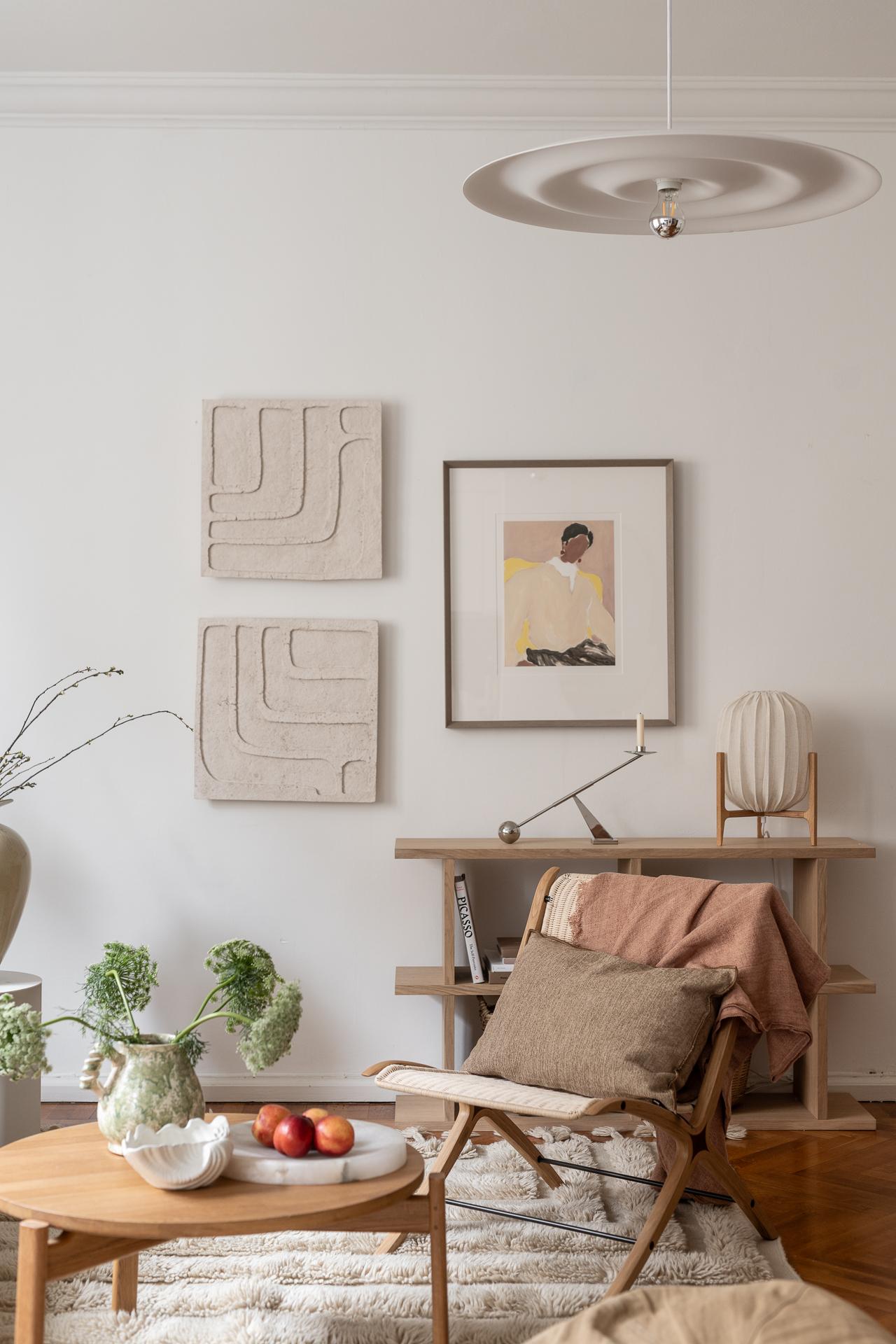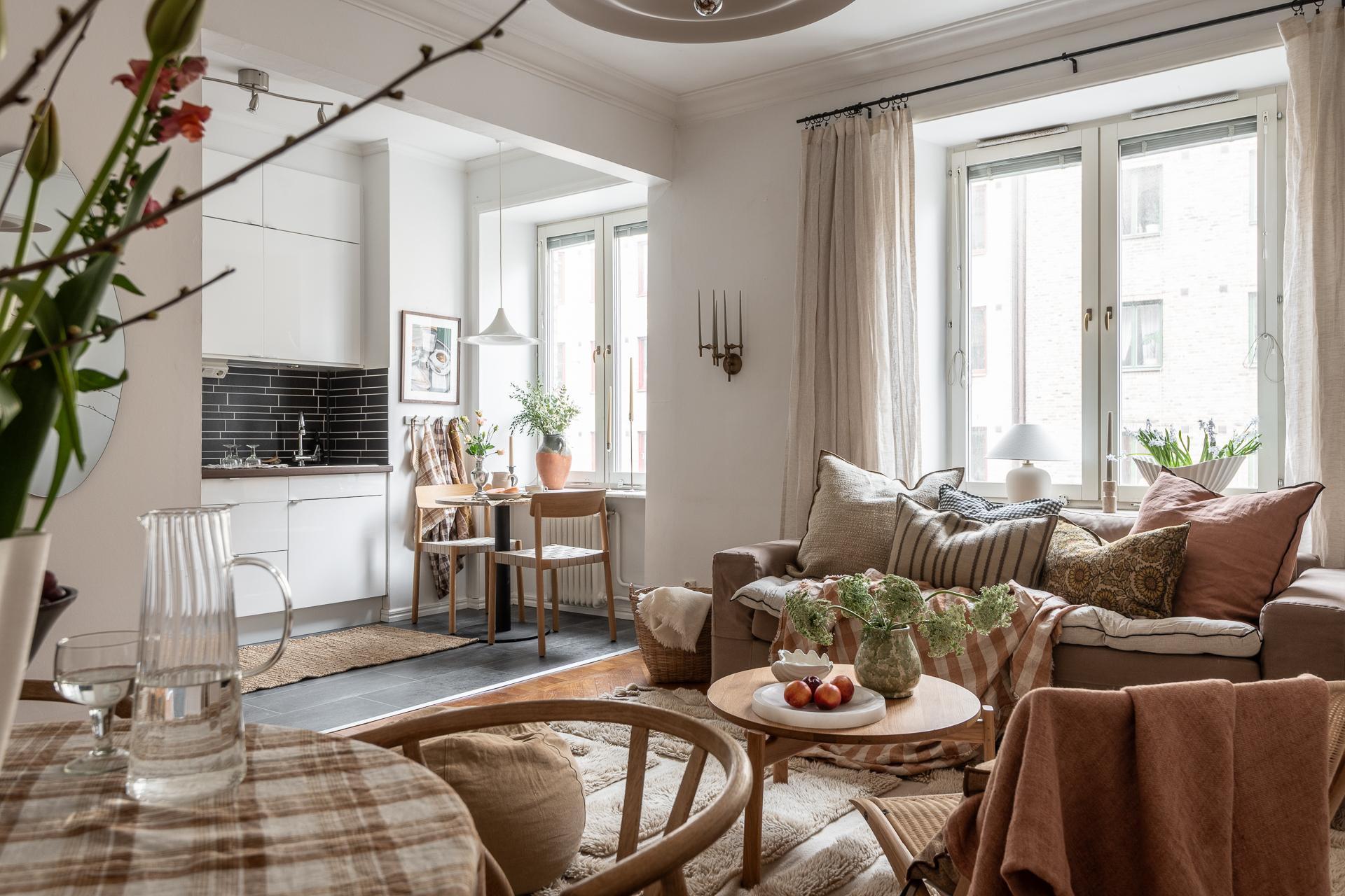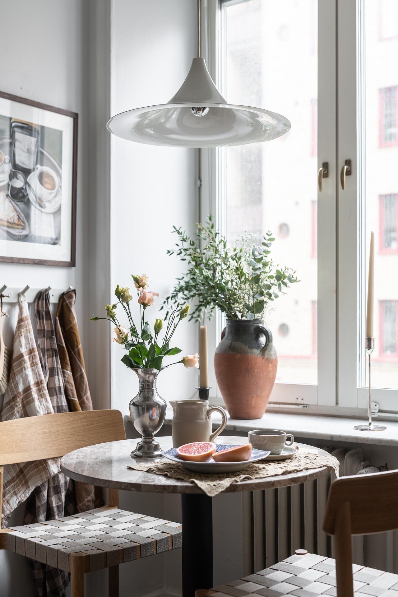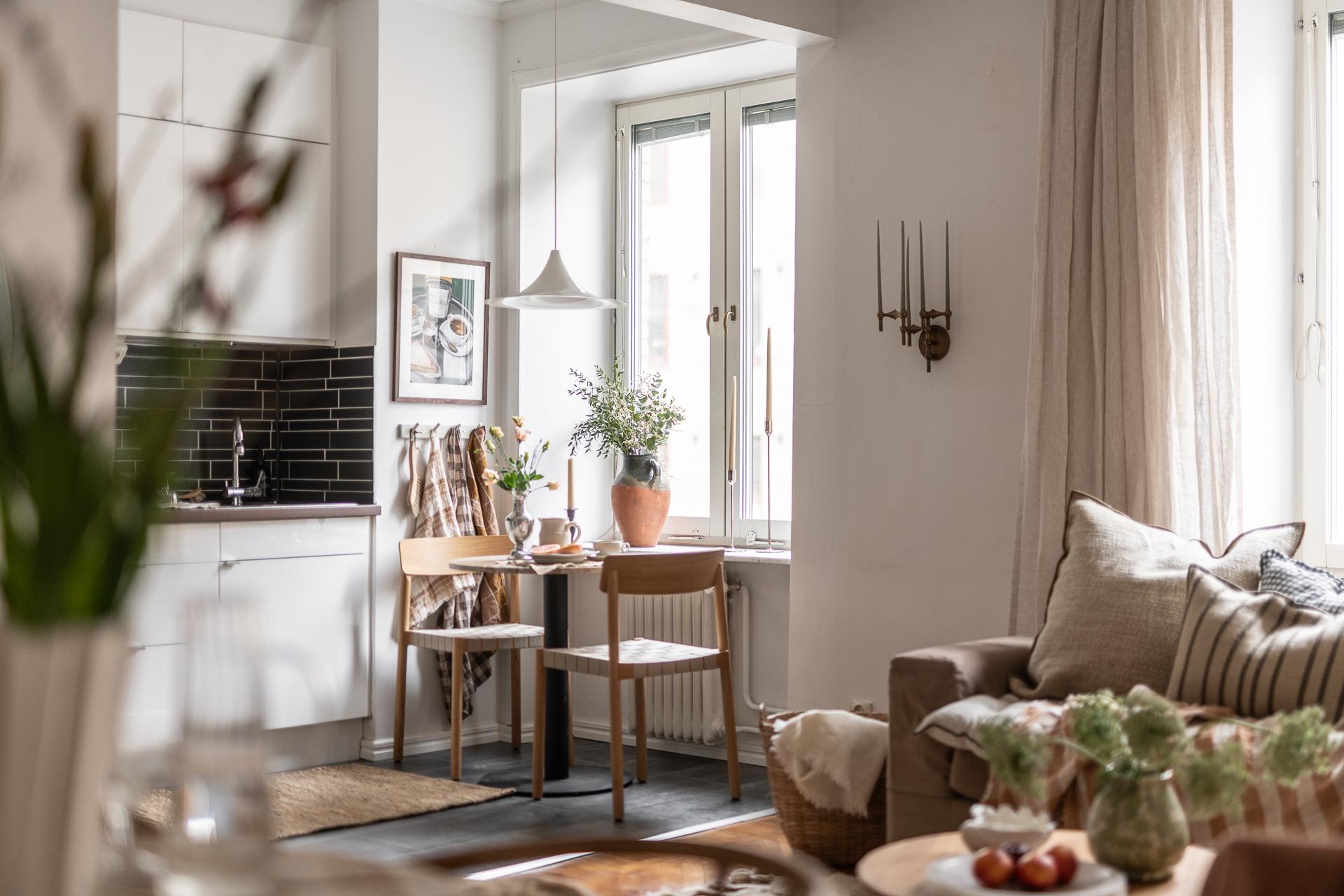 Allrummet är ljust och luftigt med fönster mot lugna Alfhemsgatan och en glimt av Rosengatan samt Slottsskogens grönska. Djupa fönsternischer med fönsterbänkar i massiv sten, elegant stuckatur, takrosett och oljad ekparkett i fiskbensmönster skapar en klassisk atmosfär – precis som man förväntar sig i en fastighet från 1930-talet. Tack vare sovalkoven finns gott om plats för både soffgrupp, läshörna och arbetsplats. Ägaren har även öppnat upp delar av väggen mellan vardagsrum och kök, vilket ger bostaden en luftig och social planlösning. I ett hörn finns dessutom en praktisk klädkammare bakom en vacker profilerad dörr.