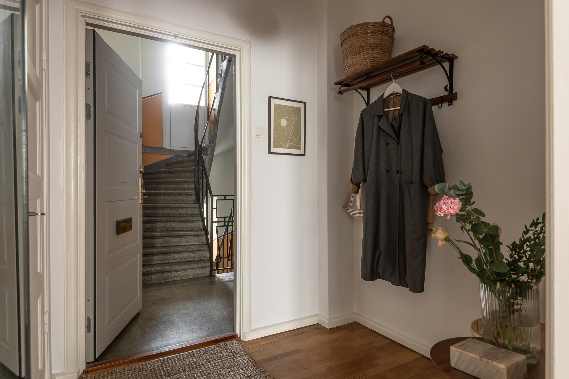 Redan i trapphuset möts man av en välbevarad fastighet där mycket renoverats varsamt i tidstypisk stil. Ta trapporna eller den charmiga originalhissen upp till våning två. En gedigen säkerhetsdörr i klassisk stil öppnar upp till ett trivsamt hem. Hallen är rymlig och erbjuder goda förvaringsmöjligheter med plats för flera garderober längs ena väggen samt avhängning för ytterkläder. Här finns även utrymme för exempelvis ett skrivbord om man vill skapa en liten arbetsplats. På golvet ligger vacker stavparkett i ek som kontrasterar fint mot de ljusa väggarna och de profilerade listerna.