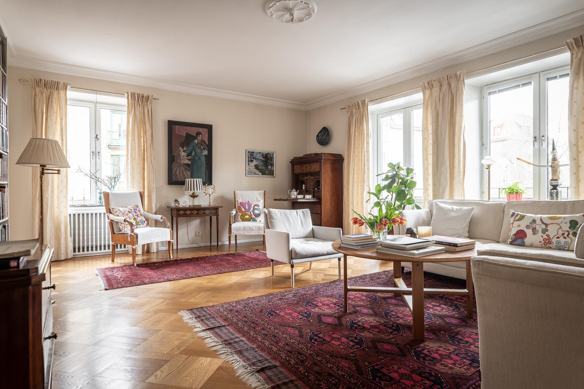 Den 8 maj 1923 invigdes Jubileumsutställningen i Göteborg av dåvarande kung Gustaf V för att fira att staden fyllde 300 år. Visserligen inträffade födelsedagen två år tidigare, 1921, men även för 100 år sedan kunde saker och ting bli uppskjutna på framtiden… Hörnlägenheten är helt underbar och vår lägenhet ligger två och en halv trappa upp i vacker fastighet från 1929, då nyklassicismen hade börjat maka på sig och funktionalismens idéer börjat få genomslag. När 20-talet gick över i 30-tal kunde man minsann blåsa stora fönsterrutor, vilket gjorde att spröjs blev överflödigt. Raka linjer går igen i trapphus, lister och stramare stuckatur. Byggkvalitén är dock fortfarande den allra högsta - det är ju ett hus på prestigeadress vi har att göra med.