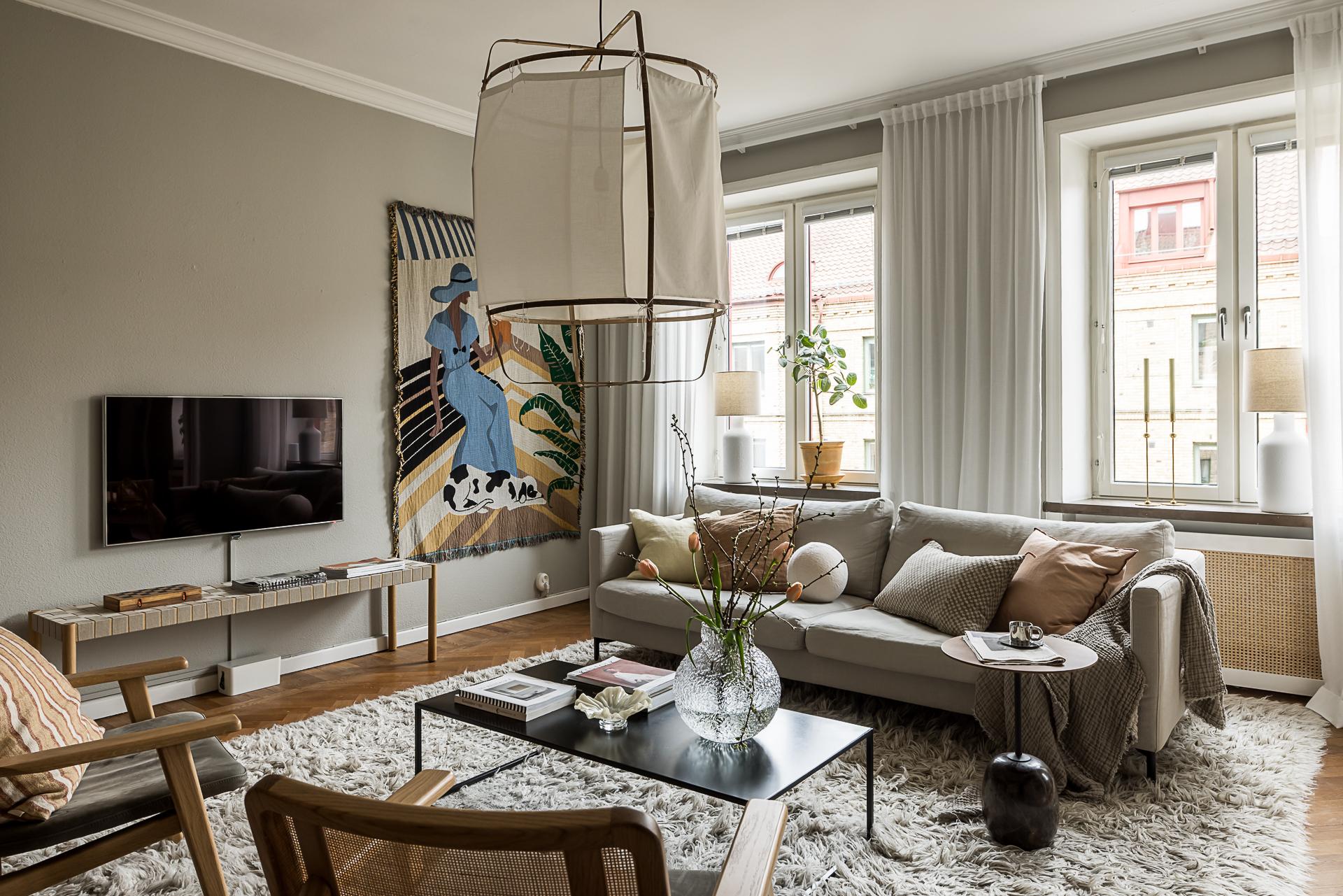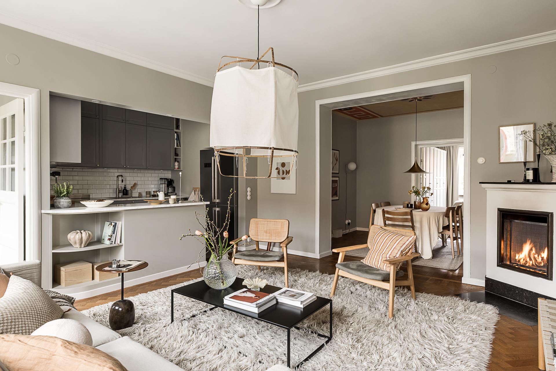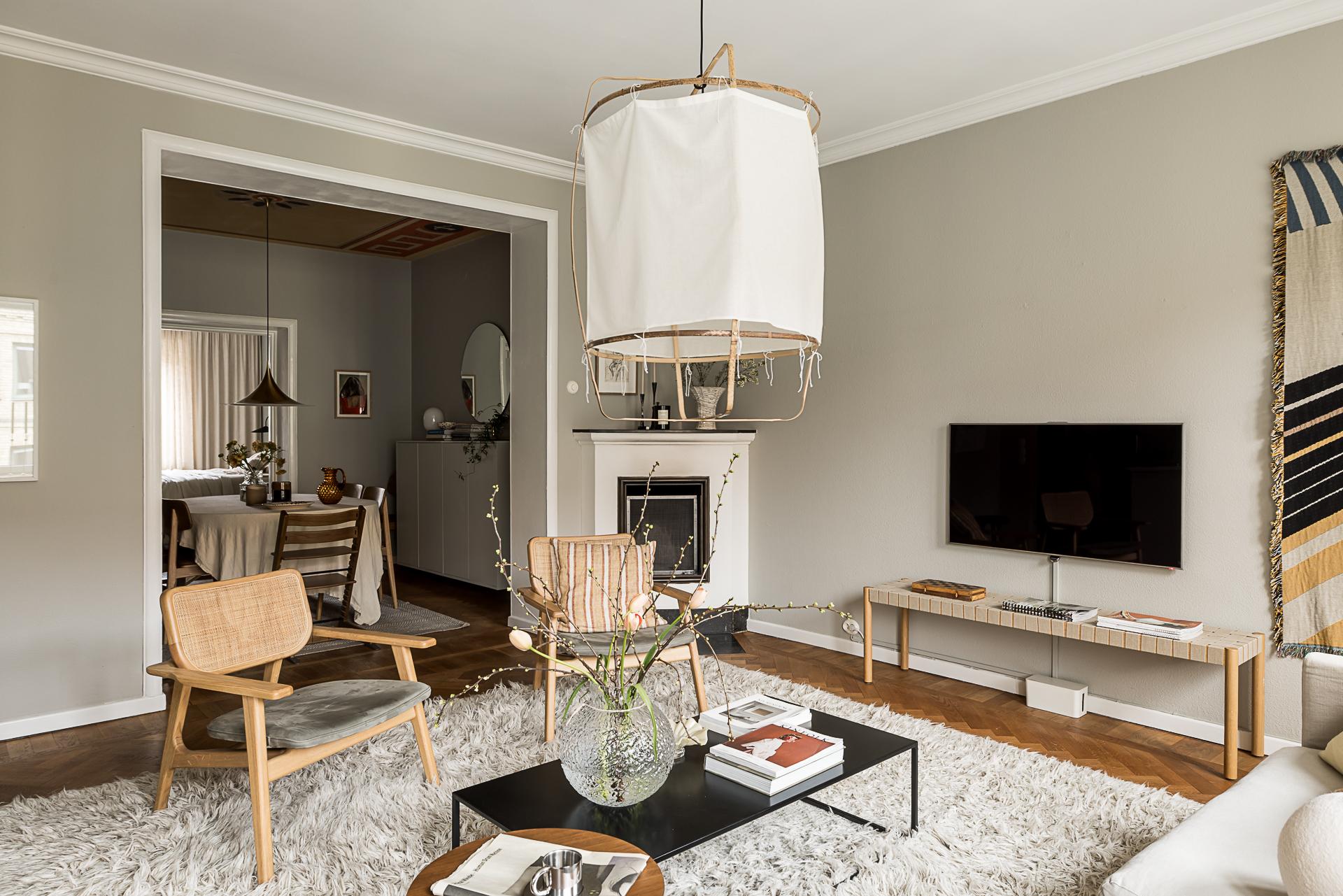 Med fönster ut mot Alfhemsgatan ligger det luftiga vardagsrummet. Detta är ett ovanligt stort sällskapsrum vilket ger många möbleringsmöjligheter. Två rejäla fönster i djupa nischer mot öster bjuder in ljuset i rummet. Här finns en fungerande öppen spis som höjer stämningen och sprider värme under vinterhalvåret. Väggarna är vackert målade i en grå ton som bryter fint mot den den öppna spisens slätputsade vita ytor samt mot listverk och stuckaturer. Också här finns flera bevarade tidstypiska detaljer i form av djupa fönsternischer med tjocka stenskivor, fiskbensparkett i ek (oljad) stram stuckatur och takrosett.