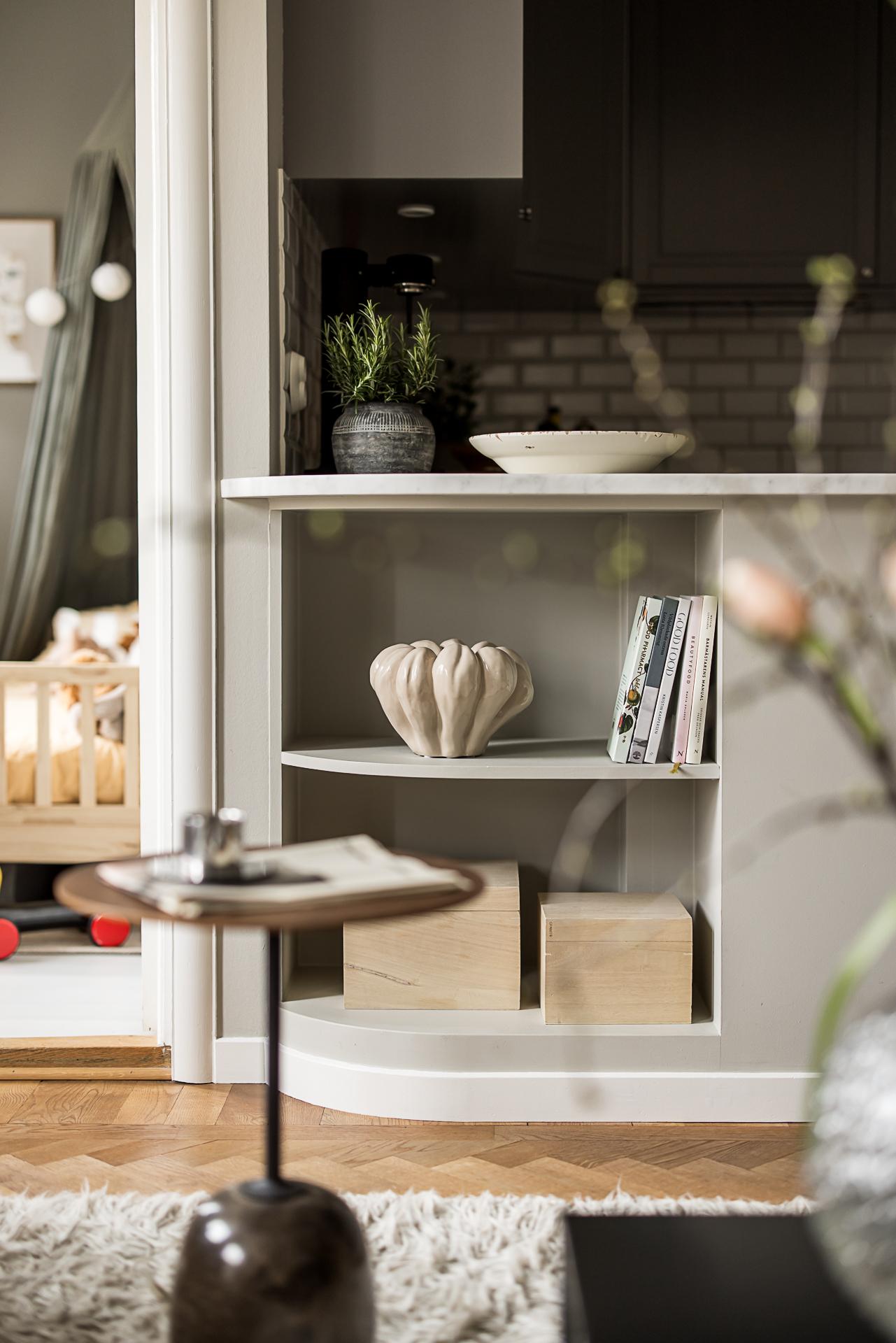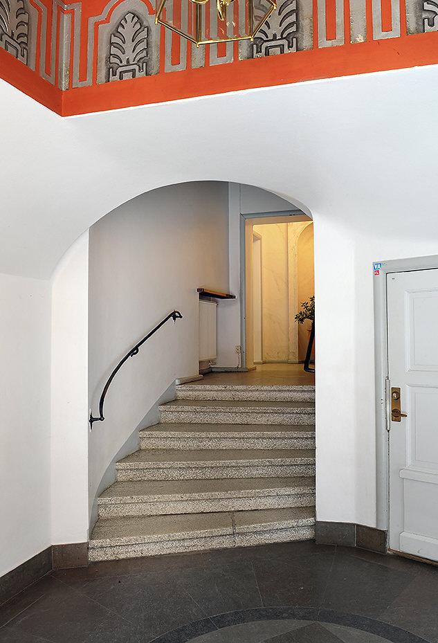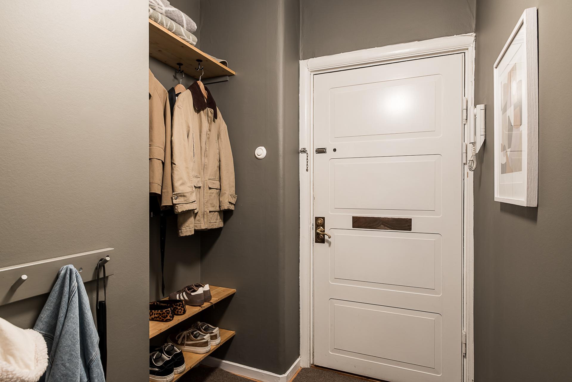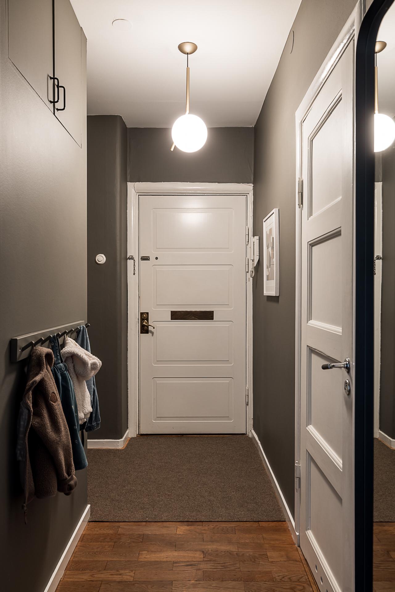 Redan i trapphuset slås man av hur välbehållen fastigheten är. Det är varsamt och tidstypiskt renoverat. När du stiger innanför den rustika dörren i lägenheten välkomnas du av en rymlig hall. Här finns det avhängningsmöjligheter och plats för hatthylla i nischen direkt till höger. Väggarna är målade i en grå ton som fint framhäver den oljade ekparketten och snickerierna i original.