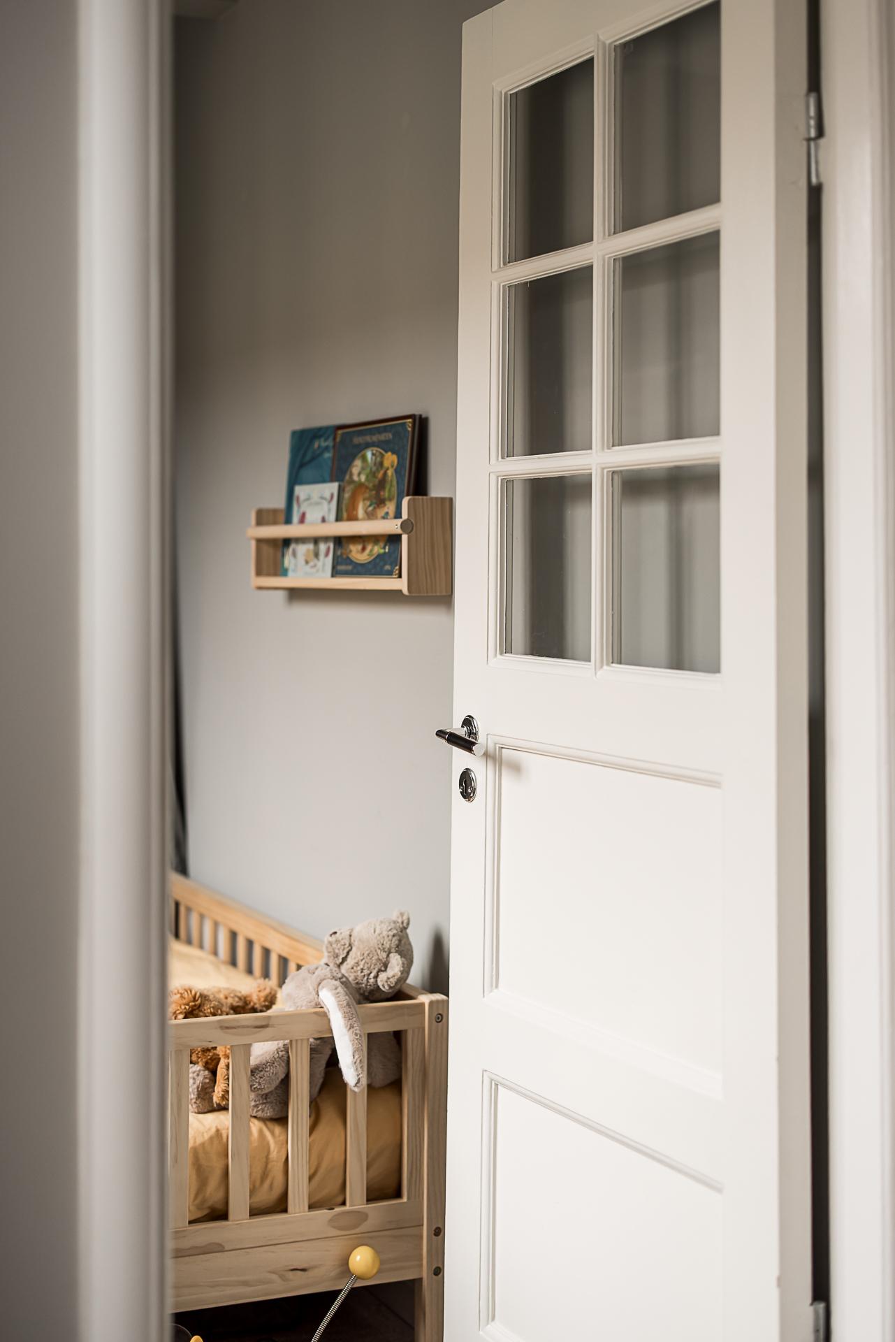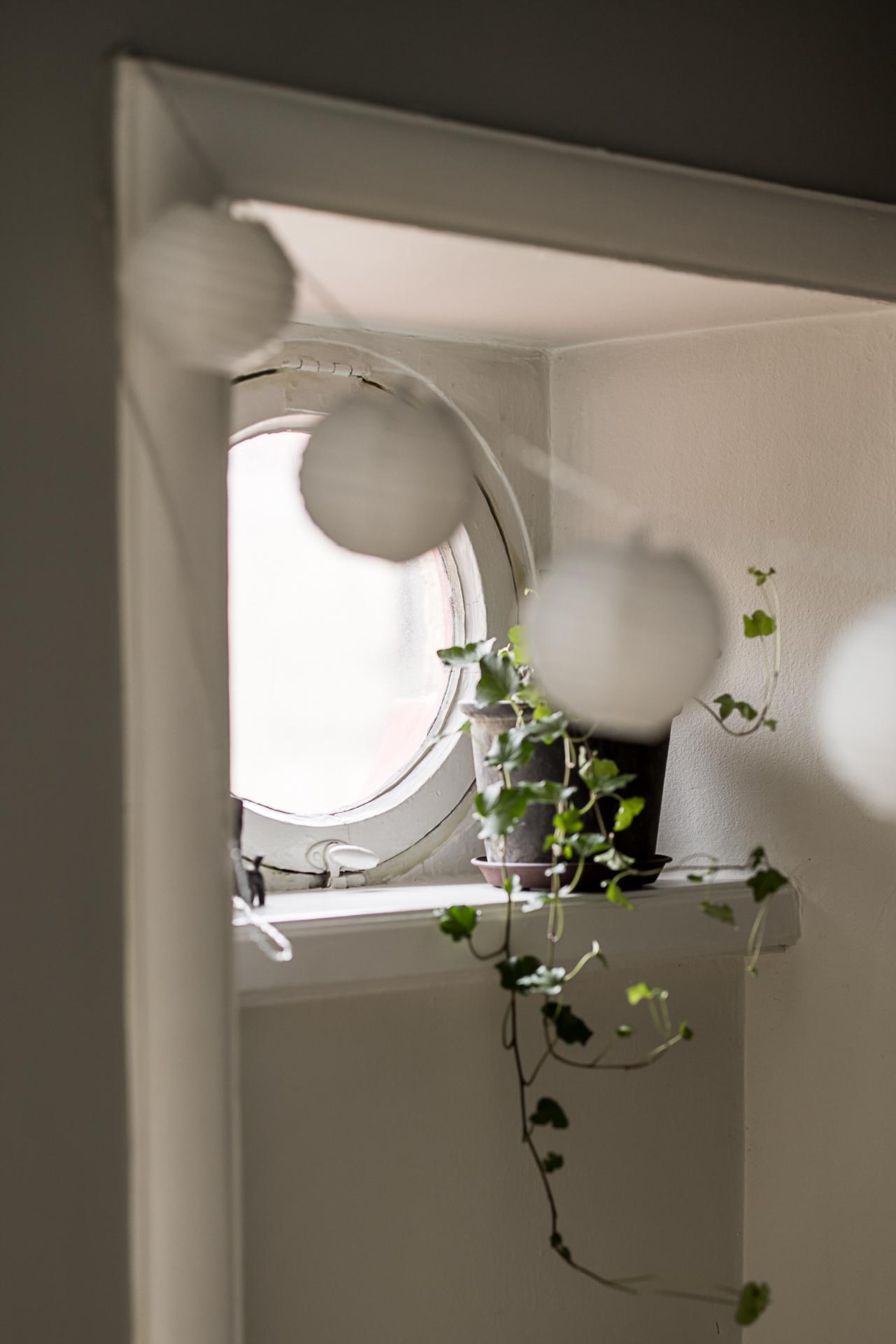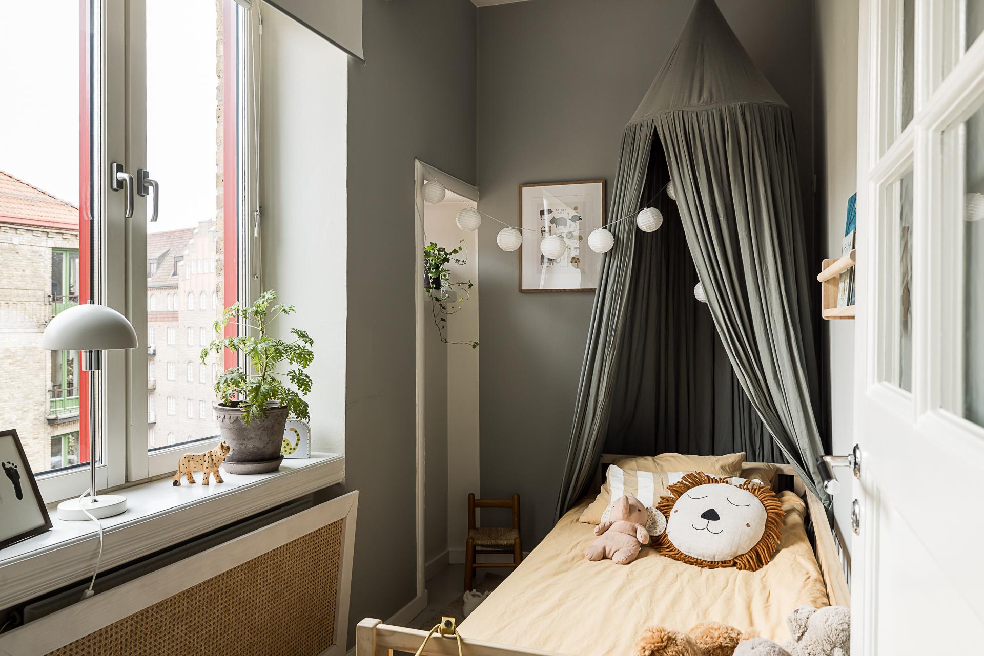 Det mindre sovrummet rymmer plats för en liten säng och massa lek, eller skulle fungera perfekt som arbetsrum kombinerat med gästrum. Även detta rum har fönster mot den lugna gatan och likadan djup nisch med kalkstenskiva som fönsterbräde. Det runda fönstret sätter en extra charmig prägel på rummet och påminner om tiden innan ombyggnationen då detta var en del av köket.