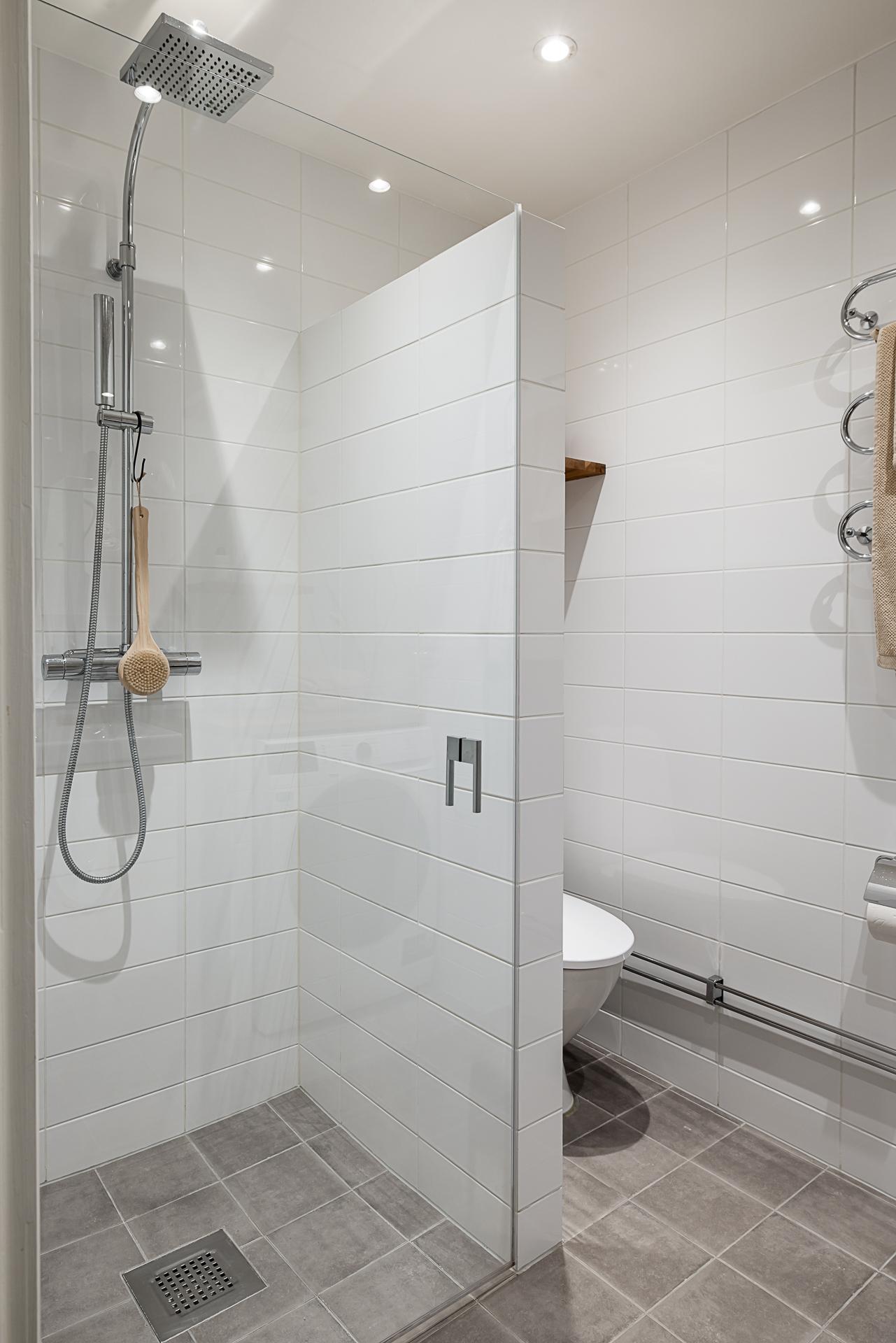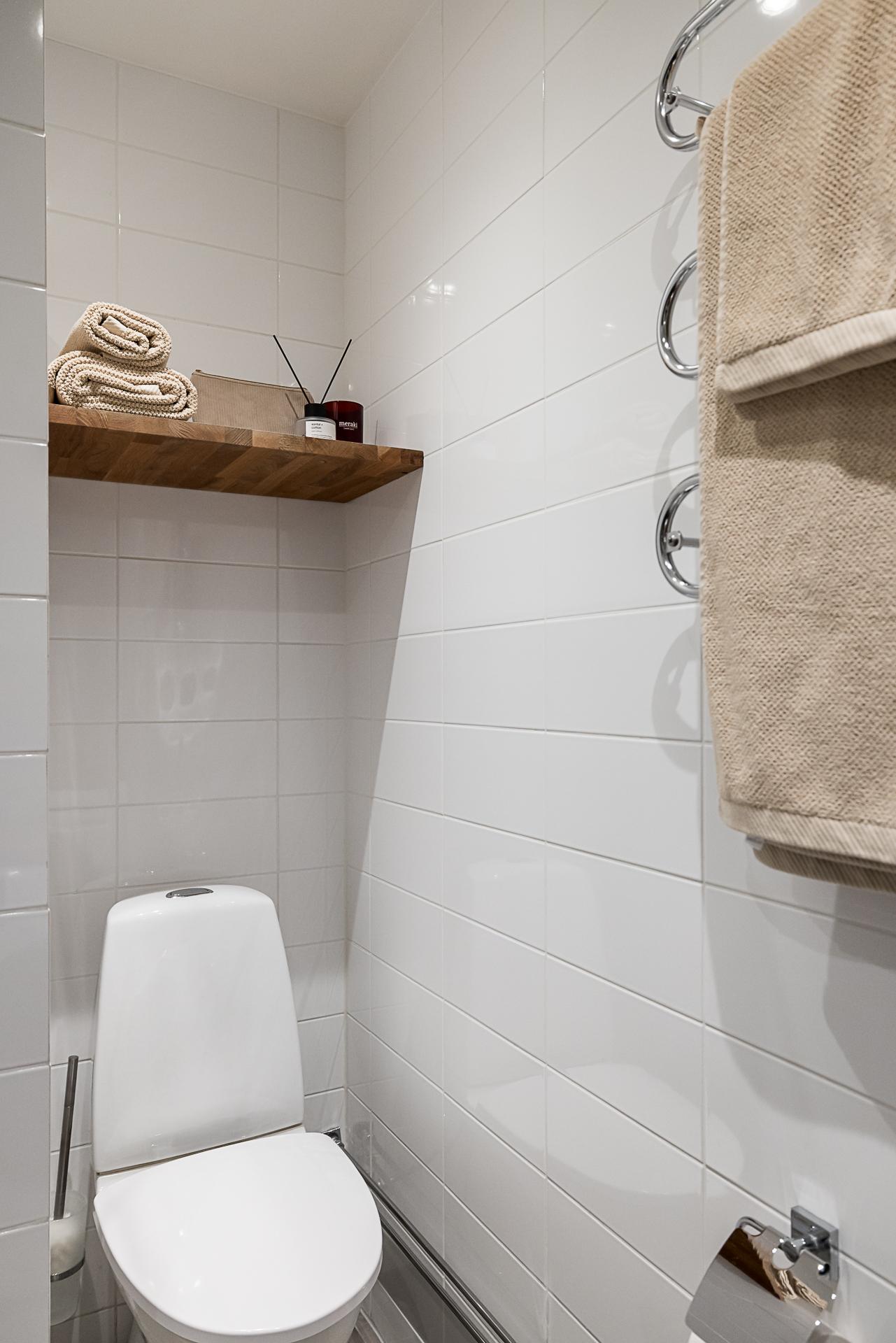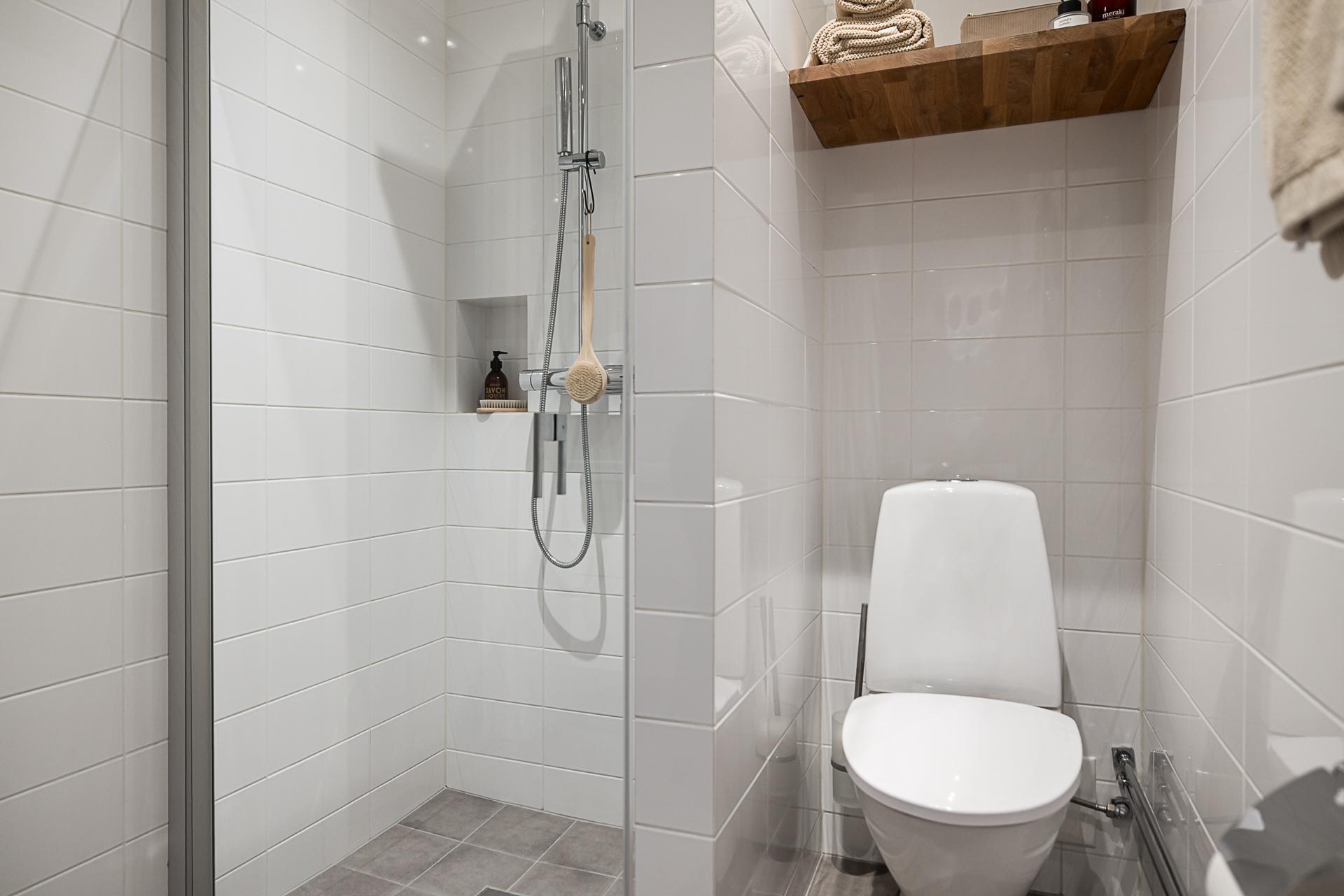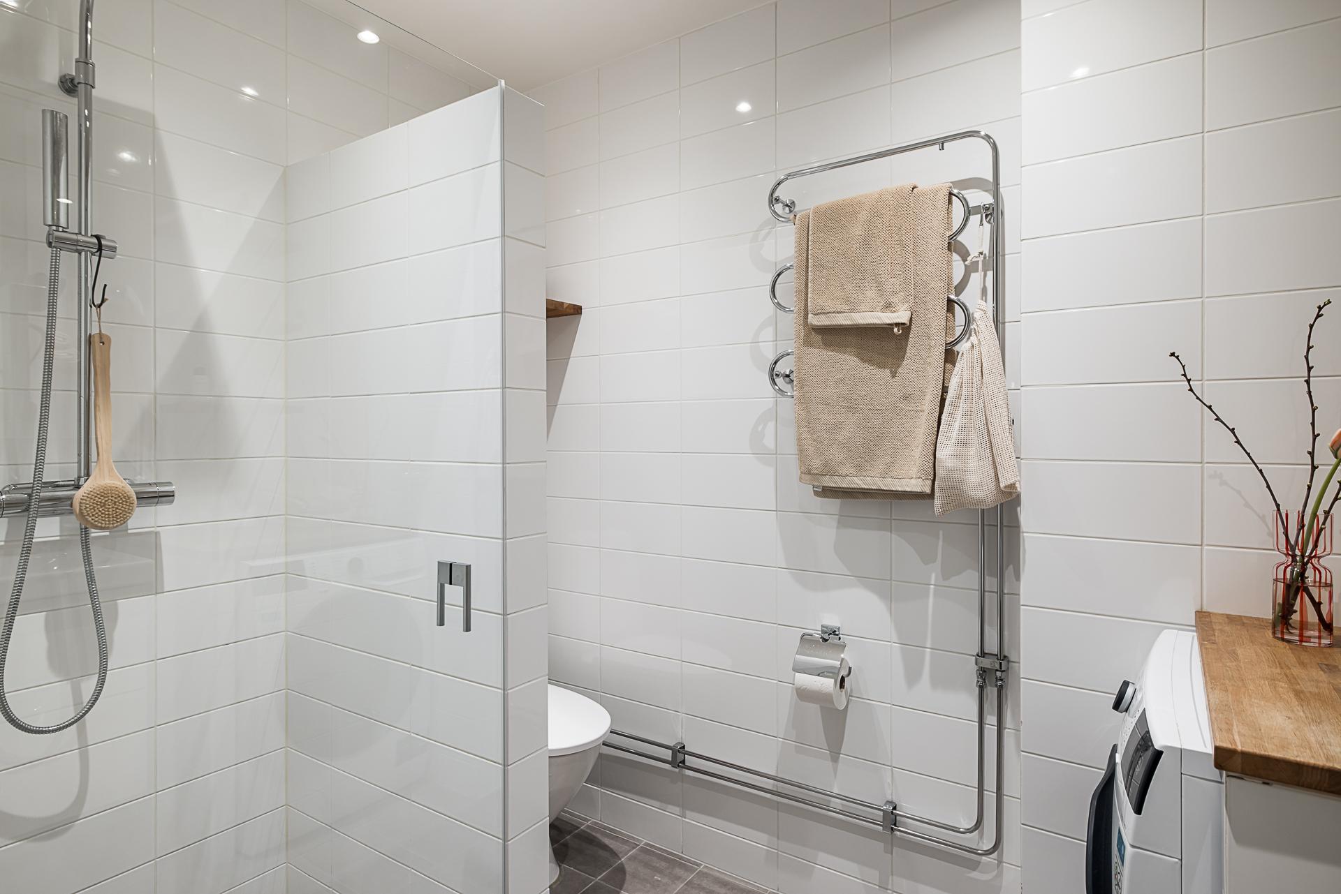 Badrummet är mycket fint och rymligt med helkaklade vita väggar och ljusgrå klinker på golvet. Rymlig dusch, golvvärme, tvättmaskin och handdukstork. Bekvämt och fortfarande i skick som nytt sedan renoveringen 2014. Påkostat med detaljer som takdusch, inbyggd tvättmaskin och fasta vägghyllor i ek. Tvättställ med kommod under och ett badrumsskåp rymmer den mesta förvaring man behöver.