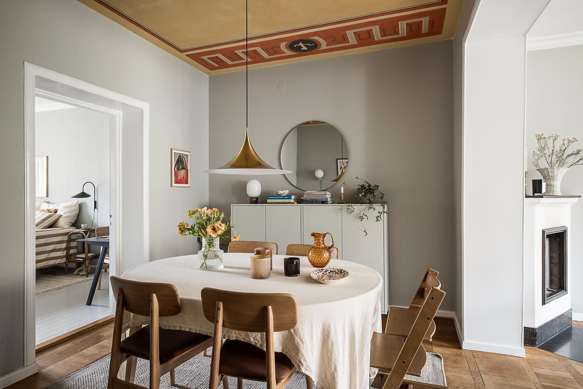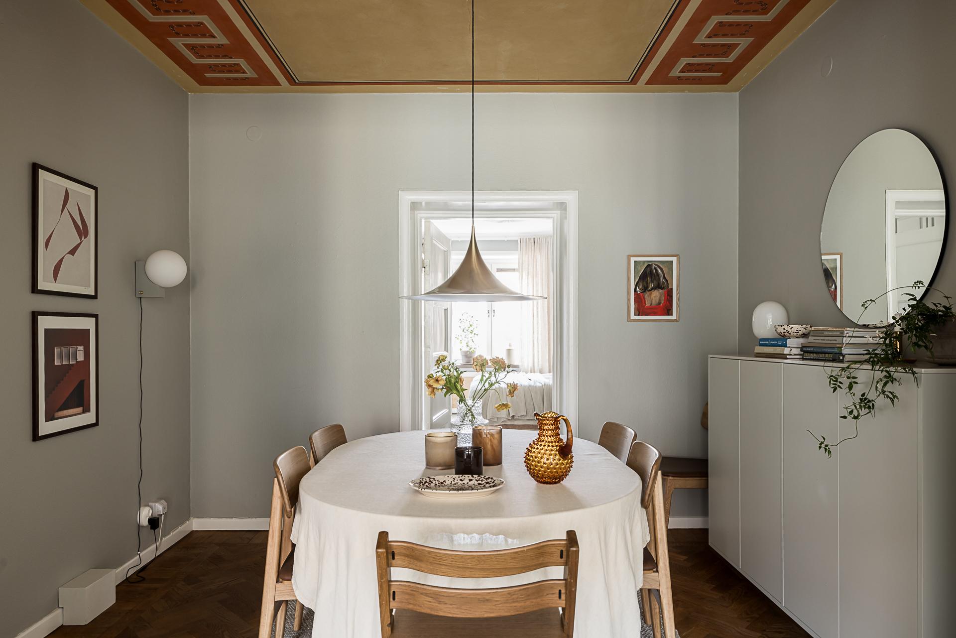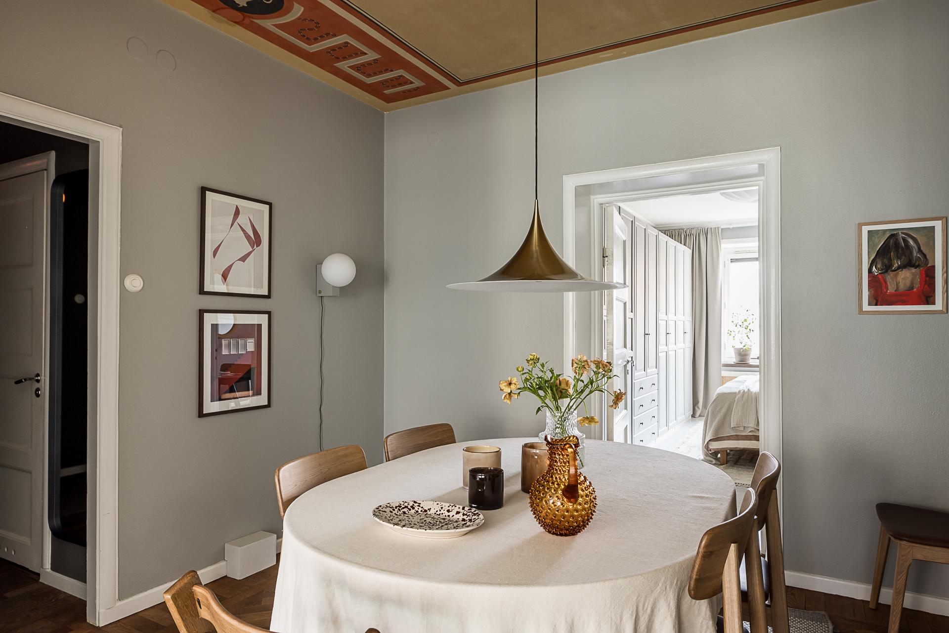Mitt i bostaden finner du detta nav som idag fungerar som matsal. Här finns plats för många gäster runt middagsbordet och en tidstypisk takmålning att stoltsera med. Även gott om plats för bokhyllor eller förvaring och vackra stilleben längs med väggarna. Samma fina oljade ekparkett på golvet som i hallen, fast här i fiskbensläggning med fris. Mot vardagsrummet finns ett klassiskt 20-talsvalv som knyter ihop rummen på ett fint sätt.