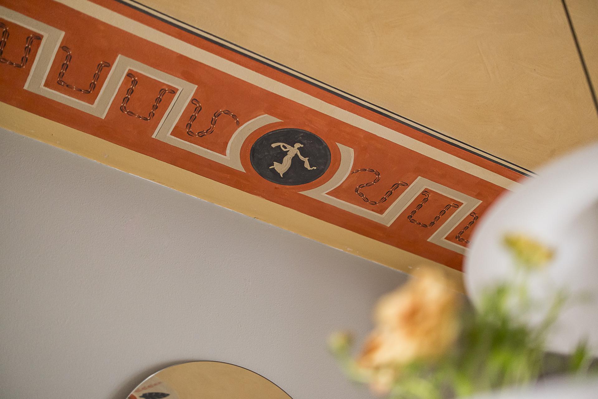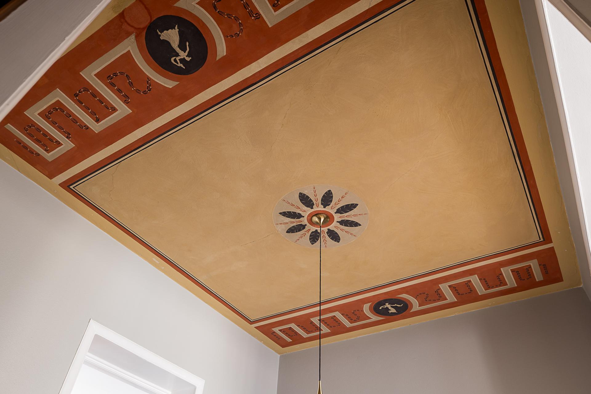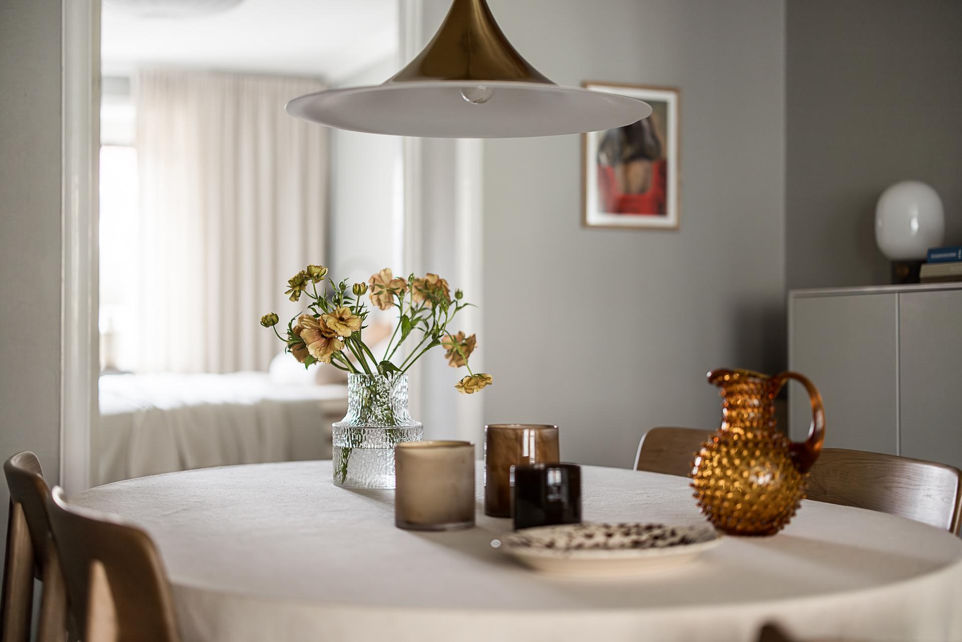 Mitt i bostaden finner du detta nav som idag fungerar som matsal. Här finns plats för många gäster runt middagsbordet och en tidstypisk takmålning att stoltsera med. Även gott om plats för bokhyllor eller förvaring och vackra stilleben längs med väggarna. Samma fina oljade ekparkett på golvet som i hallen, fast här i fiskbensläggning med fris. Mot vardagsrummet finns ett klassiskt 20-talsvalv som knyter ihop rummen på ett fint sätt.