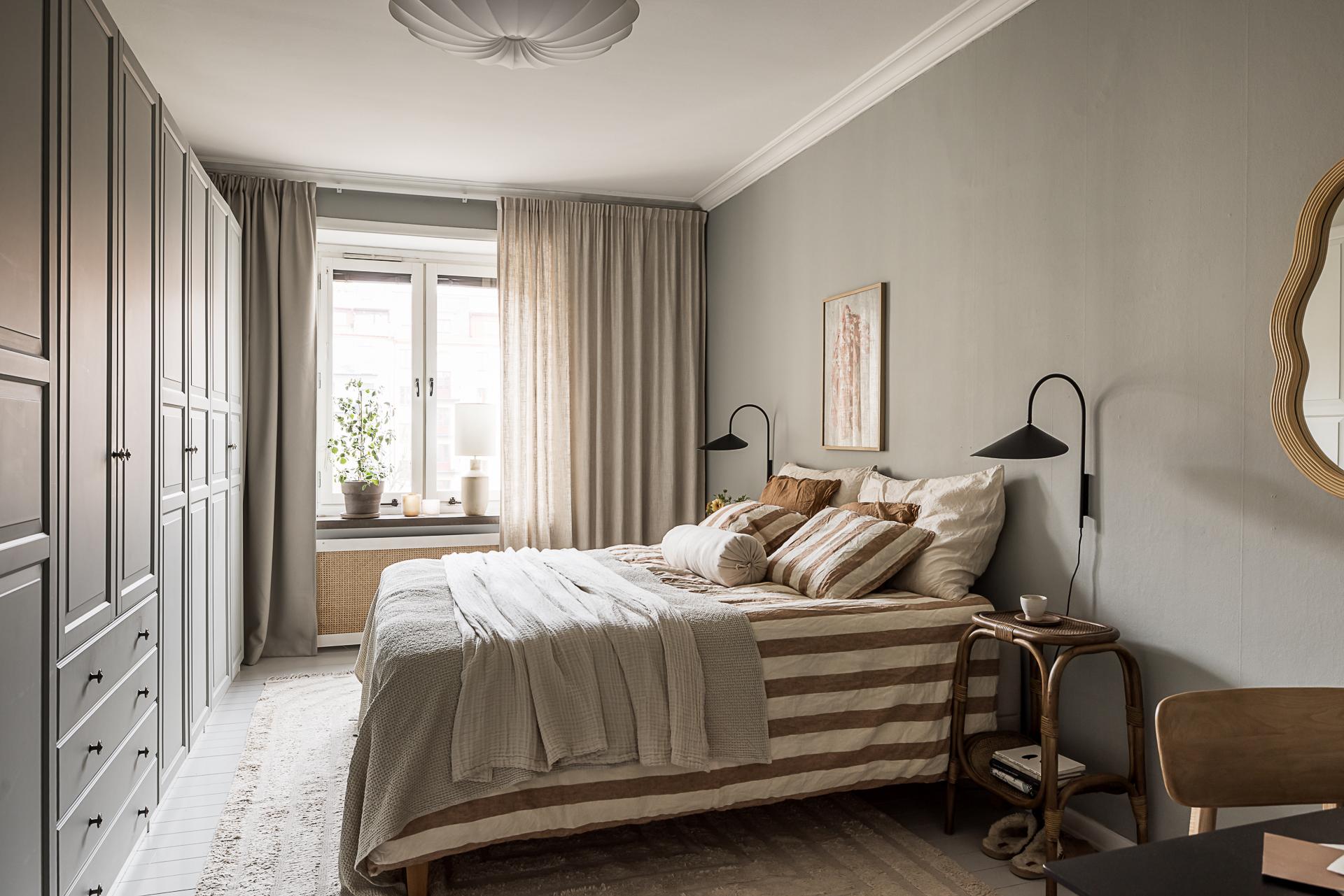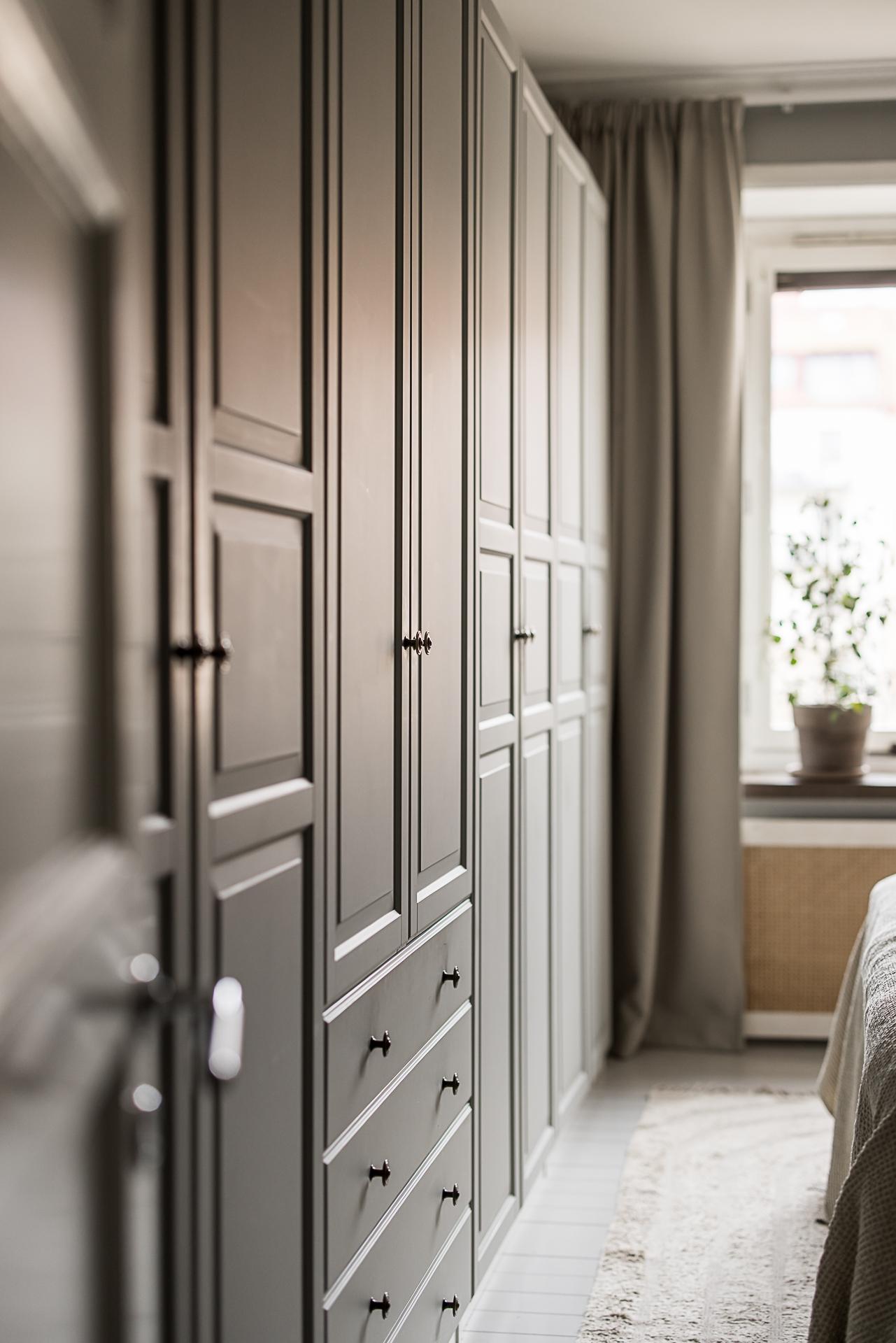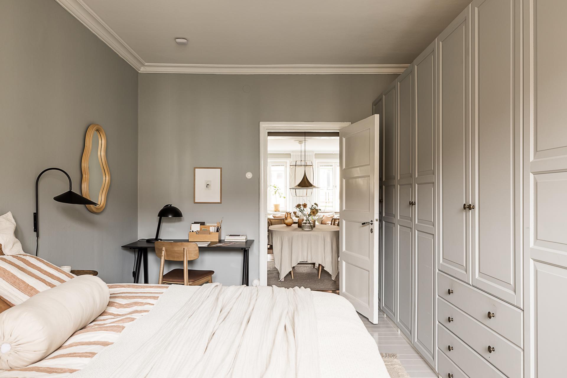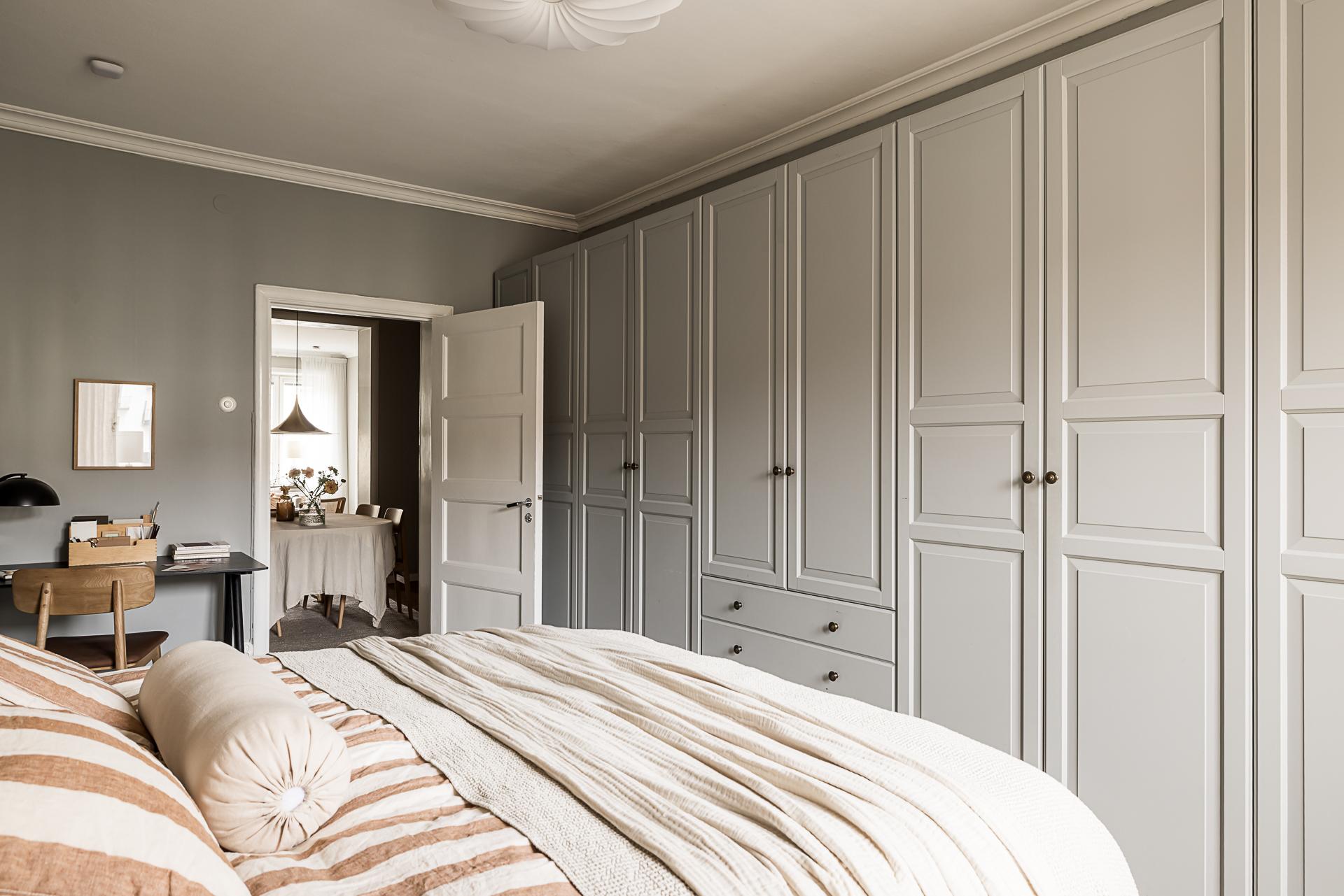 Mot gården ligger det stora sovrummet. Stämningen är vilsam, precis som sig bör i ett sovrum. Det höga västerläget gör att eftermiddags- och kvällssolen trillar in och ger fint ljus. Det vackra gråmålade brädgolvet är både skönt att gå på och en fröjd för ögat. Här finns plats för en stor dubbelsäng med tillhörande sängbord. Fem dubbelgarderober ger gott om förvaring. Garderoberna är målade i samma grå kulör som väggarna, vilket gör att de smälter in bra och känslan är att de inte tar upp särskilt stor golvyta.
