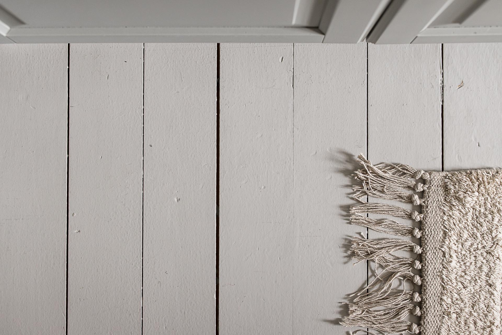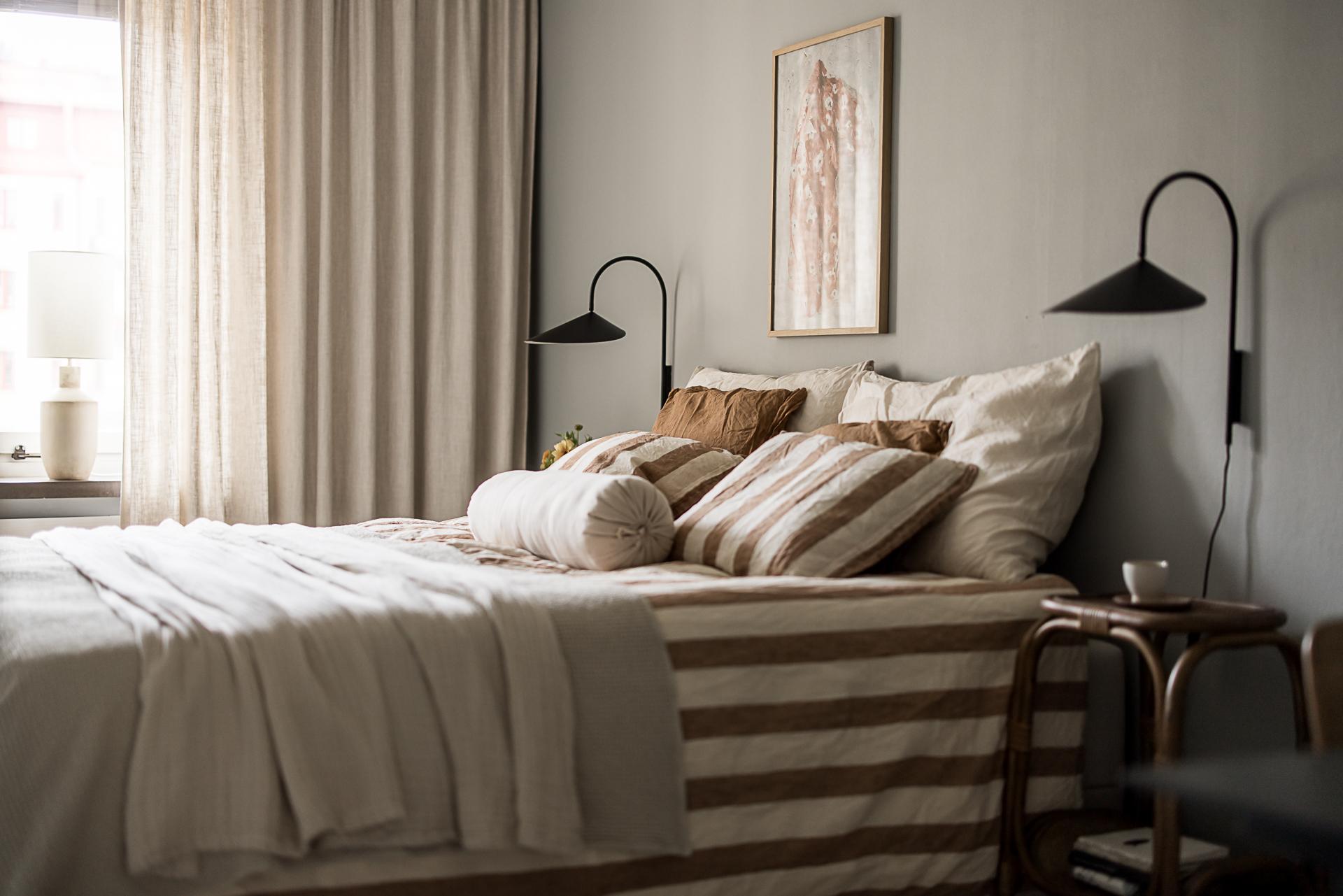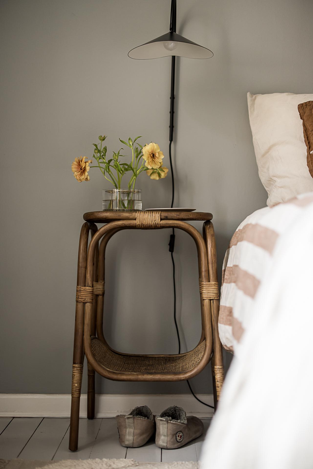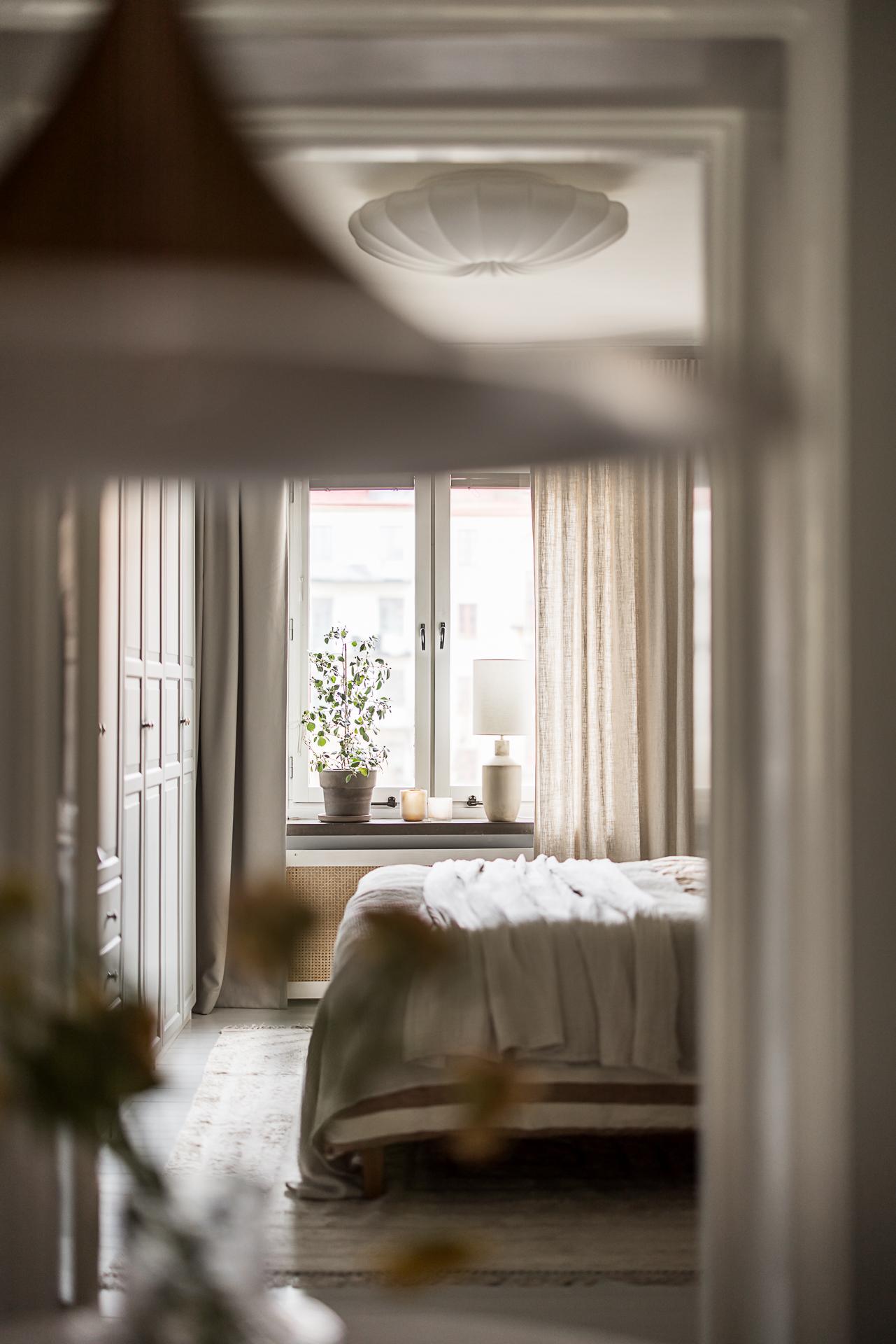 Mot gården ligger det stora sovrummet. Stämningen är vilsam, precis som sig bör i ett sovrum. Det höga västerläget gör att eftermiddags- och kvällssolen trillar in och ger fint ljus. Det vackra gråmålade brädgolvet är både skönt att gå på och en fröjd för ögat. Här finns plats för en stor dubbelsäng med tillhörande sängbord. Fem dubbelgarderober ger gott om förvaring. Garderoberna är målade i samma grå kulör som väggarna, vilket gör att de smälter in bra och känslan är att de inte tar upp särskilt stor golvyta.
