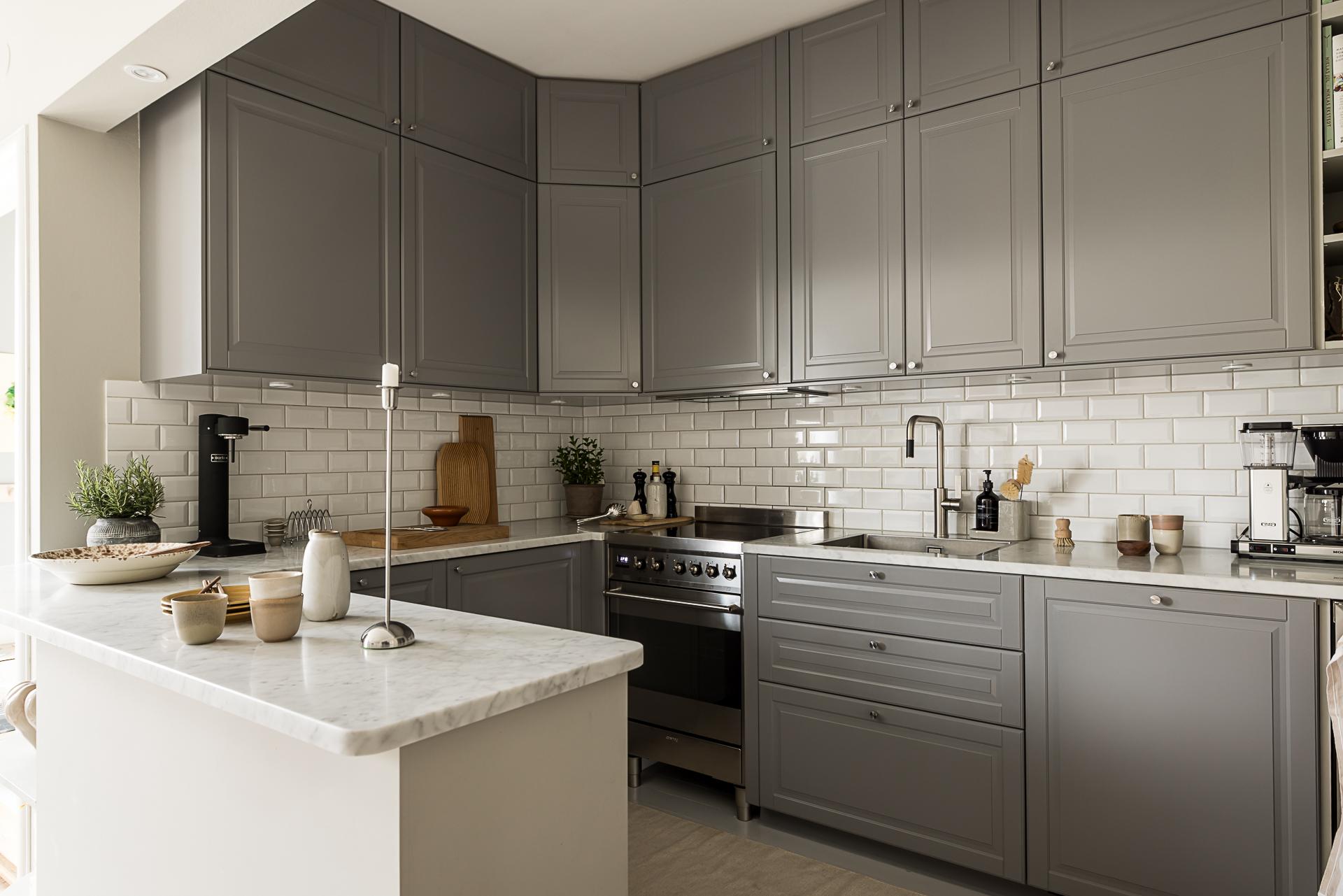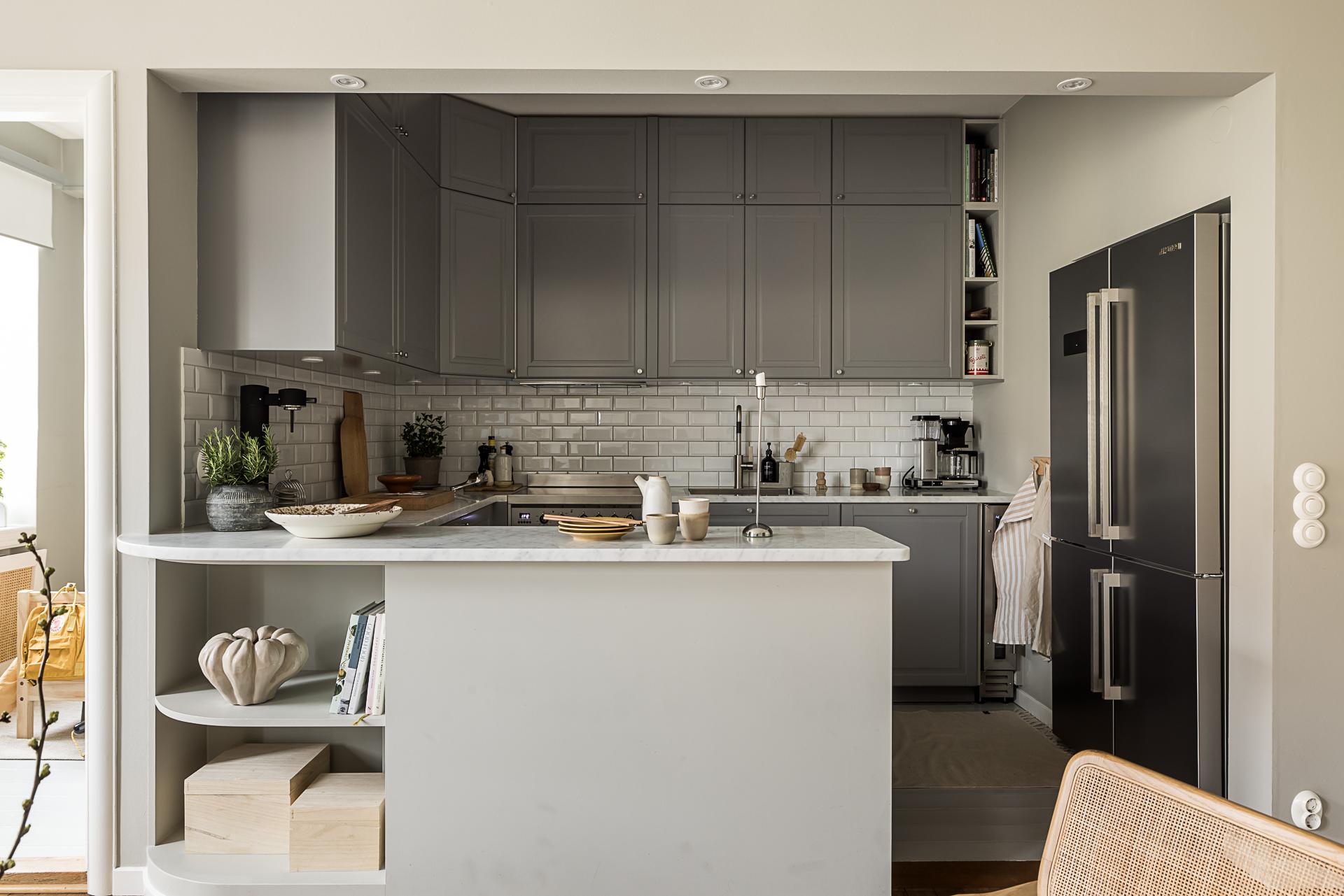 Öppet mot vardagsrummet ligger det stilfulla köket. Här är det lätt att trivas i sin matlagning, med bra utrustning och goda arbetsytor. Grå snickerier, bänkskivor i ljus carraramarmor och vitt rektangulärt kakel med fasade kanter, satt i halvt förband. Kombinationen är en klassiker som man aldrig tröttnar på. Spis och extra stort kombinerat kylskåp och frys från Smeg. Integrerad diskmaskin från Asko och fläkt från Fjäråskupan. Nuvarande ägare har också låtit installera en vinkyl. På golvet ligger ett plankgolv i original, målat i em heltäckande, ljust grå. Köket renoverades 2016.