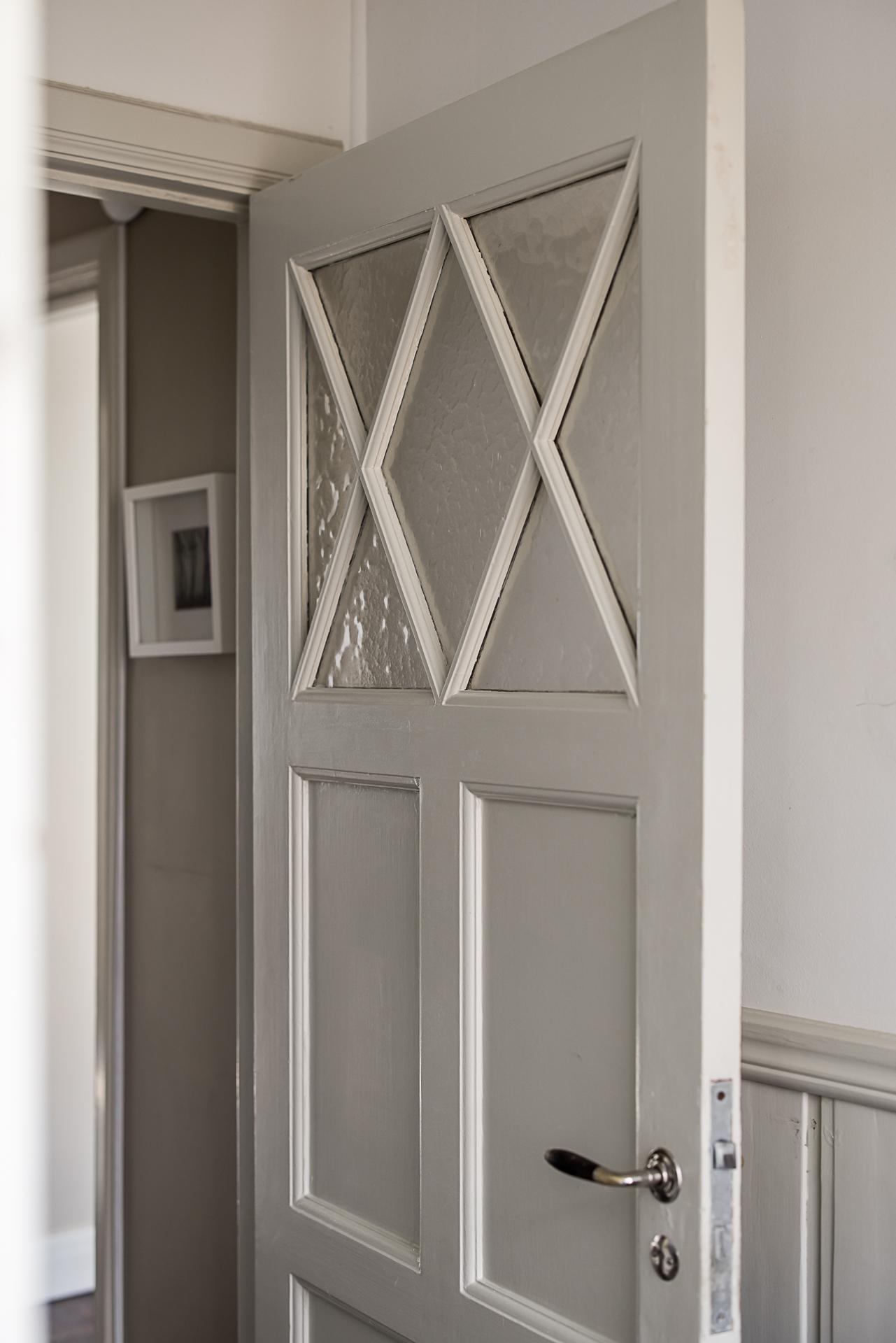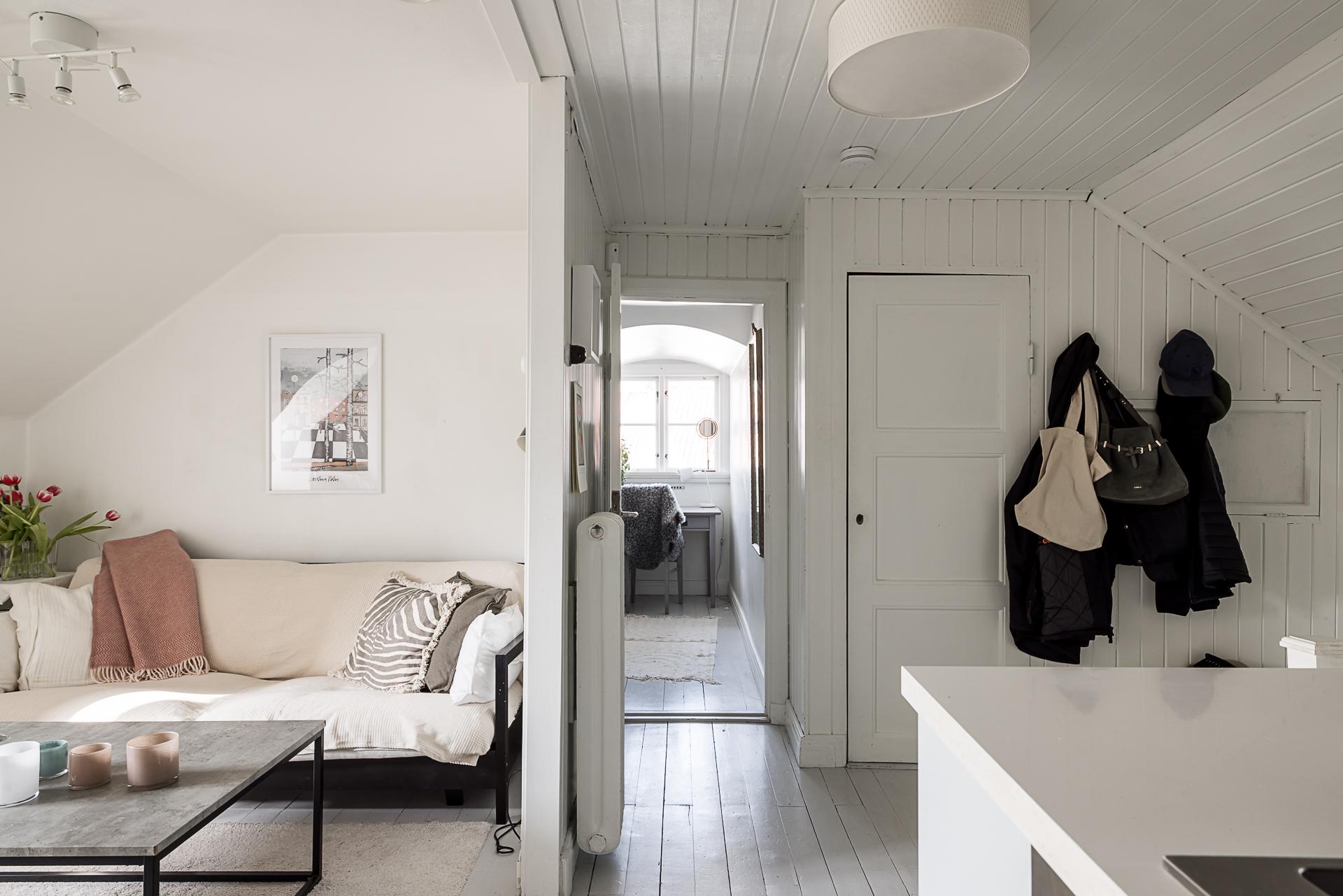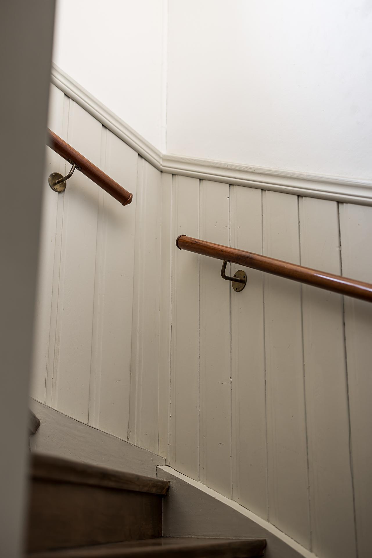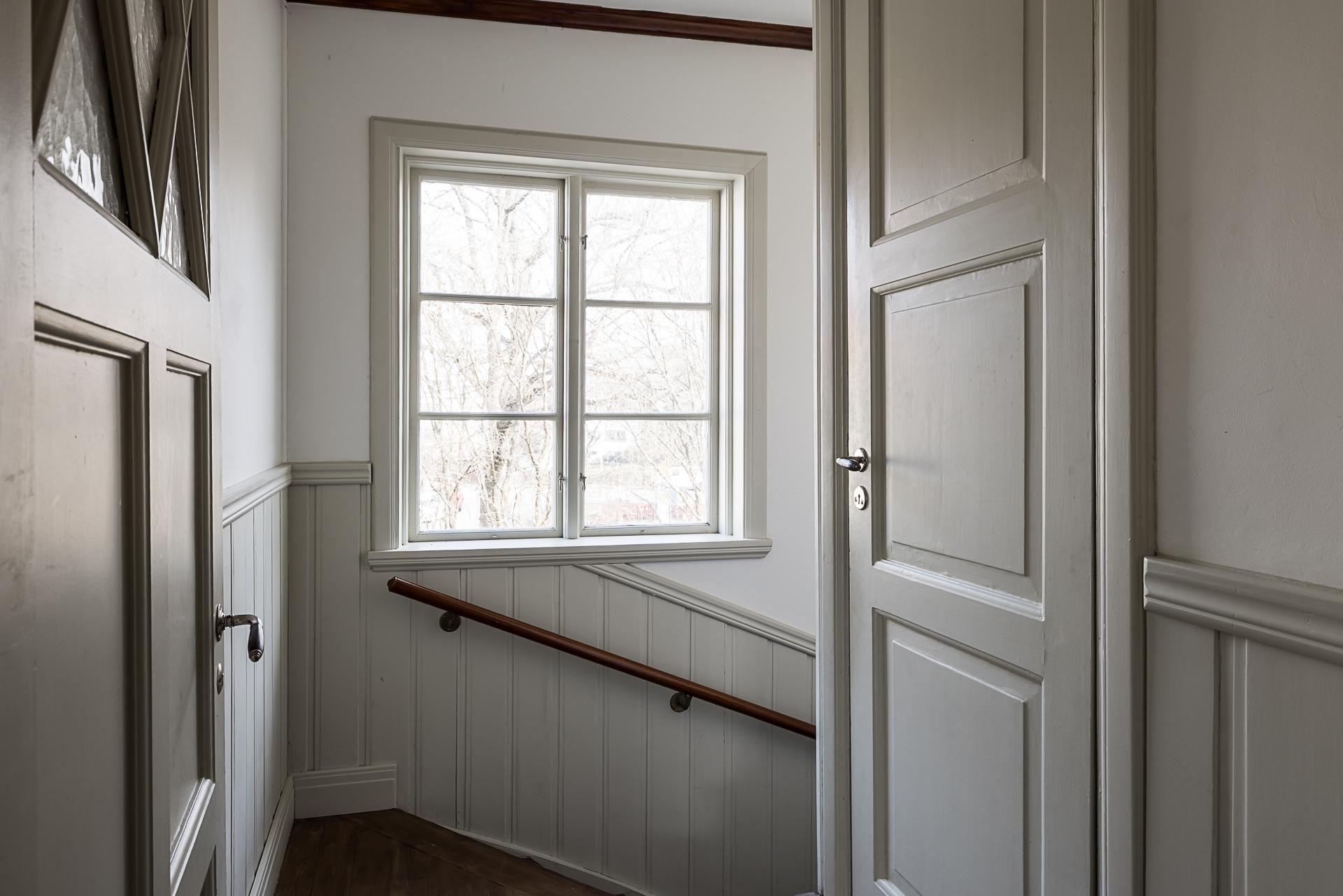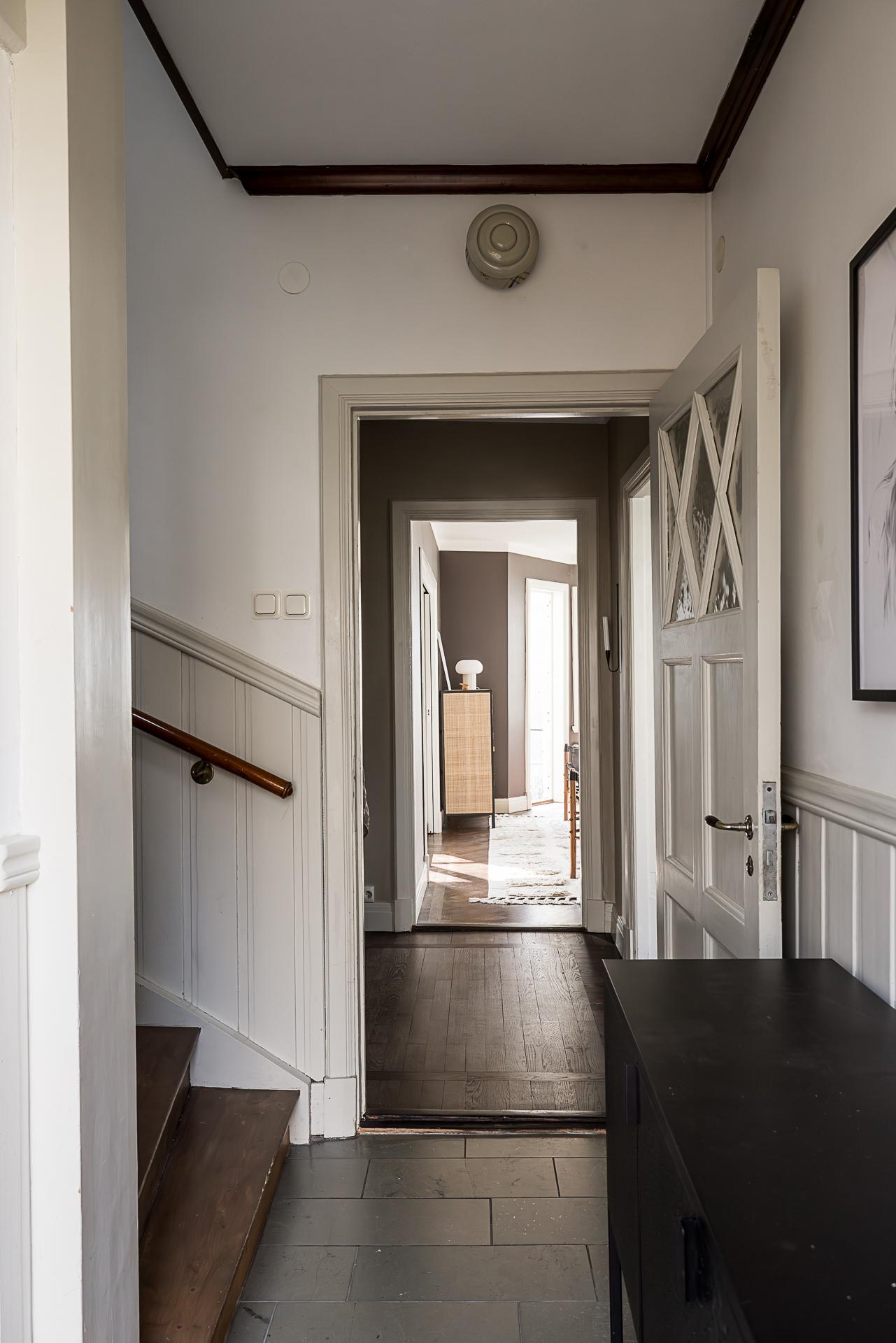 Hallen och serveringsgången binder samman hela övervåningen. Även här finns en stor inbyggd garderob och gott om plats för jackavhängning. Väggarna är ljusmålade och det framtagna brädgolvet lackat.