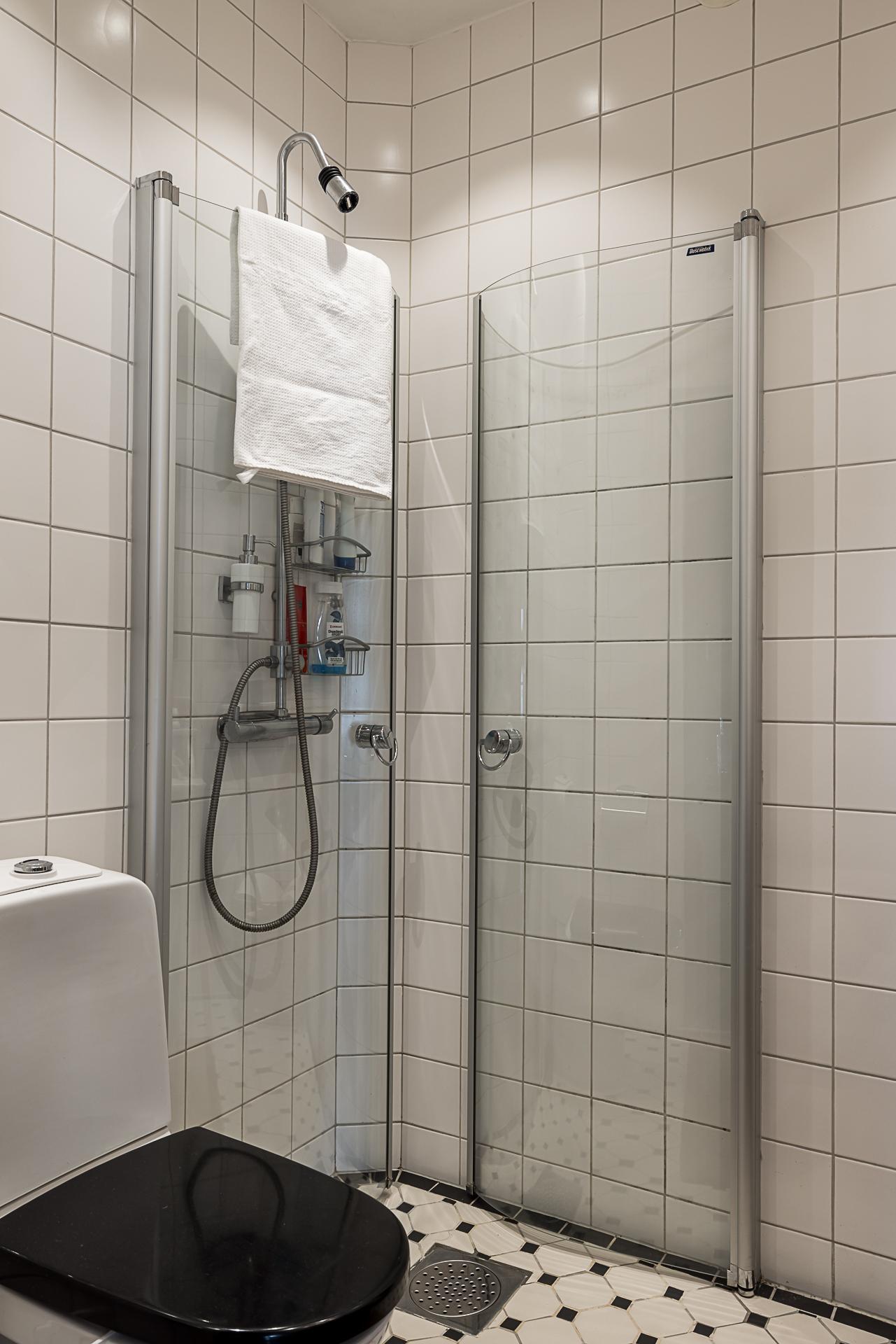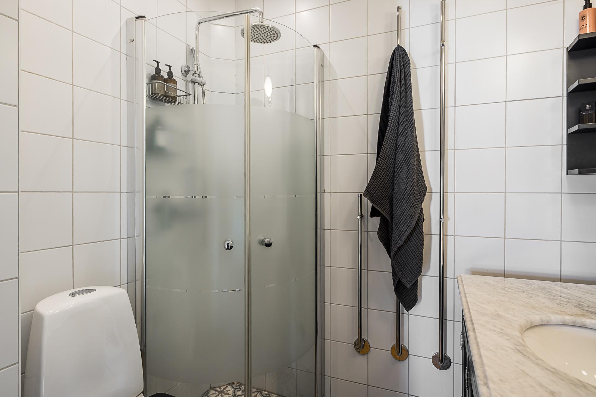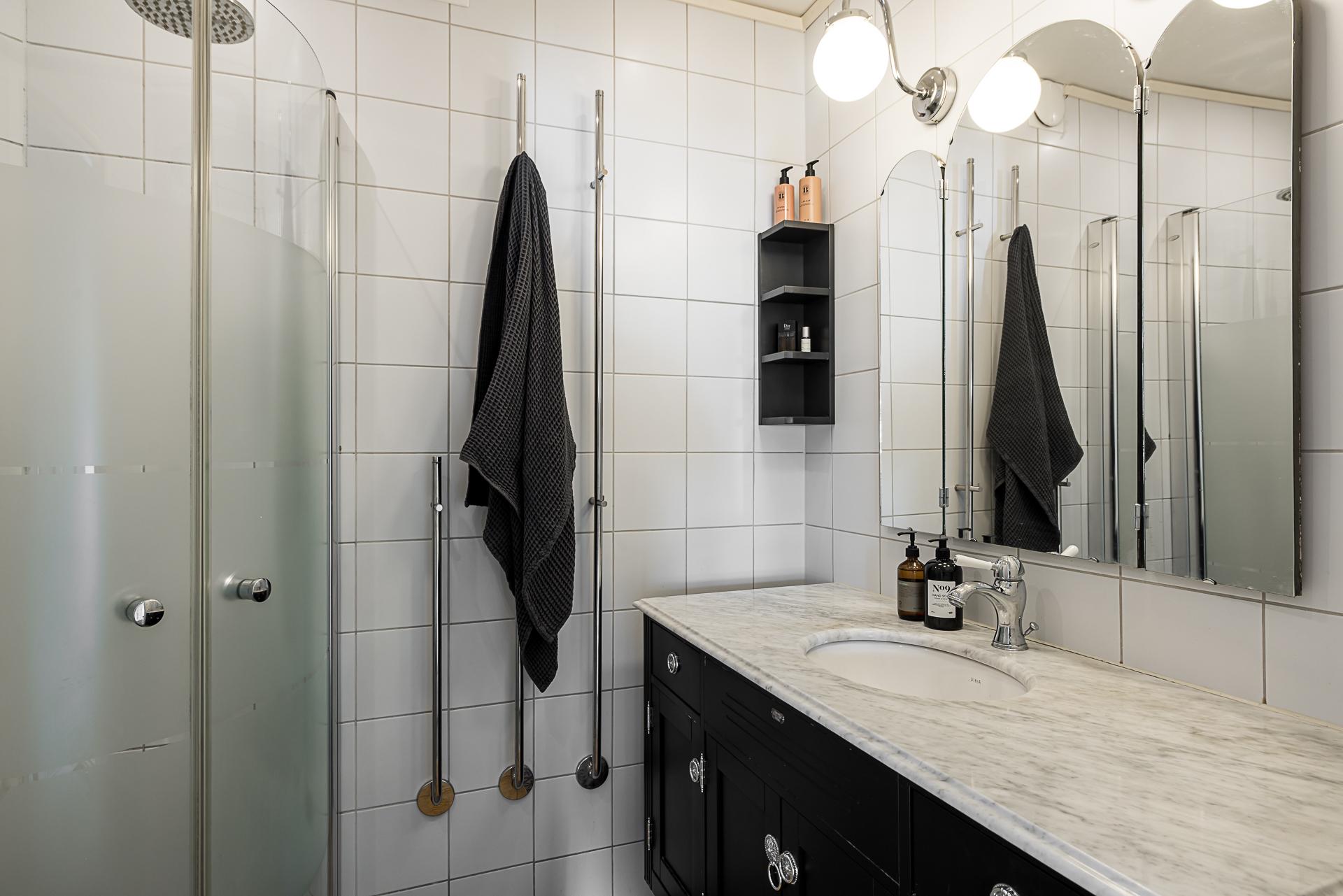 Badrummet inrymmer duschhörna, handdukstorkar, toalett och en bred tvättkommod med marmorbänk. Väggarna är klädda med vitt kakel och golvet belagt med orientaliskt mönstrad klinker med golvvärme.