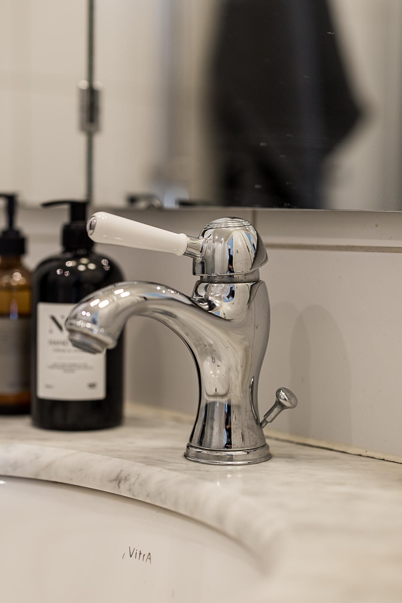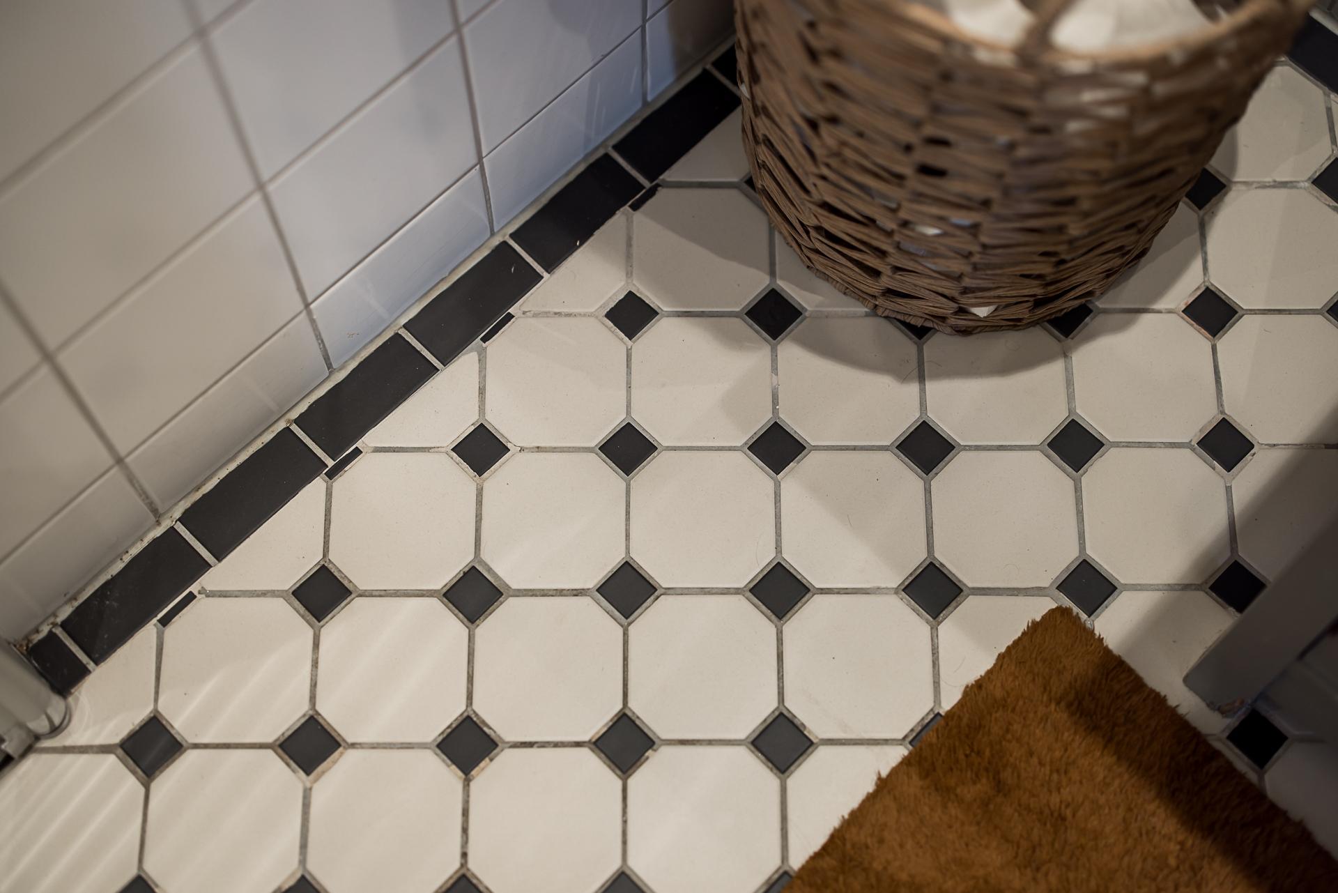 Badrummet inrymmer duschhörna, handdukstorkar, toalett och en fin tvättkommod med bänk och hylla i marmor. Väggarna är klädda med vitt kakel, och golvet belagt med vit och svart klinker. Golvvärmen gör gott för morgonkalla fötter.