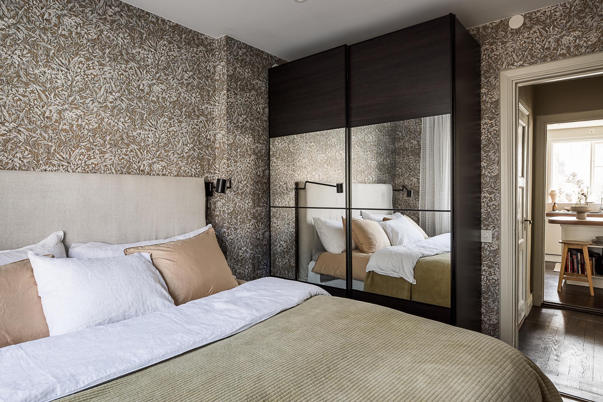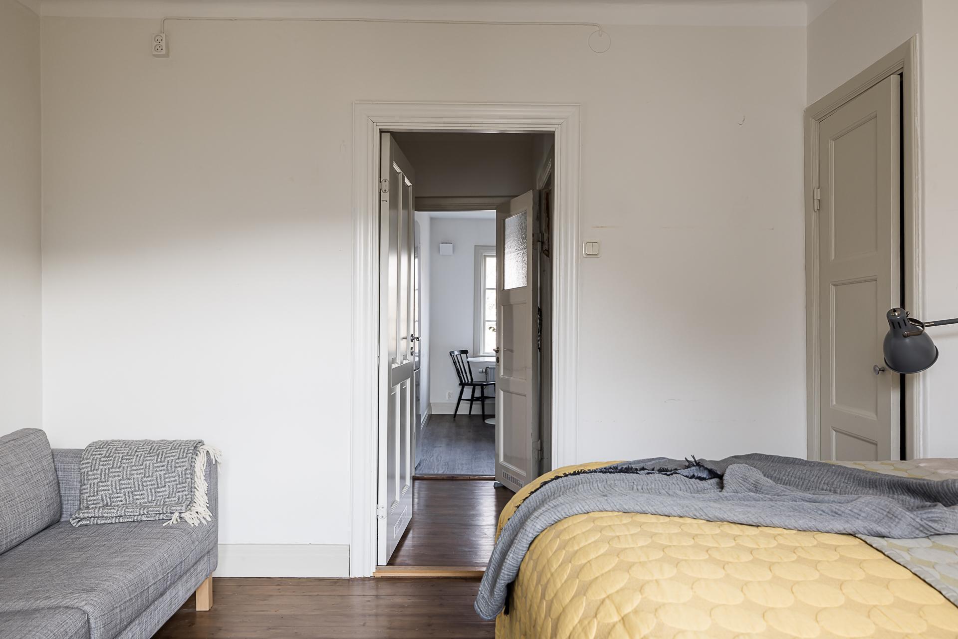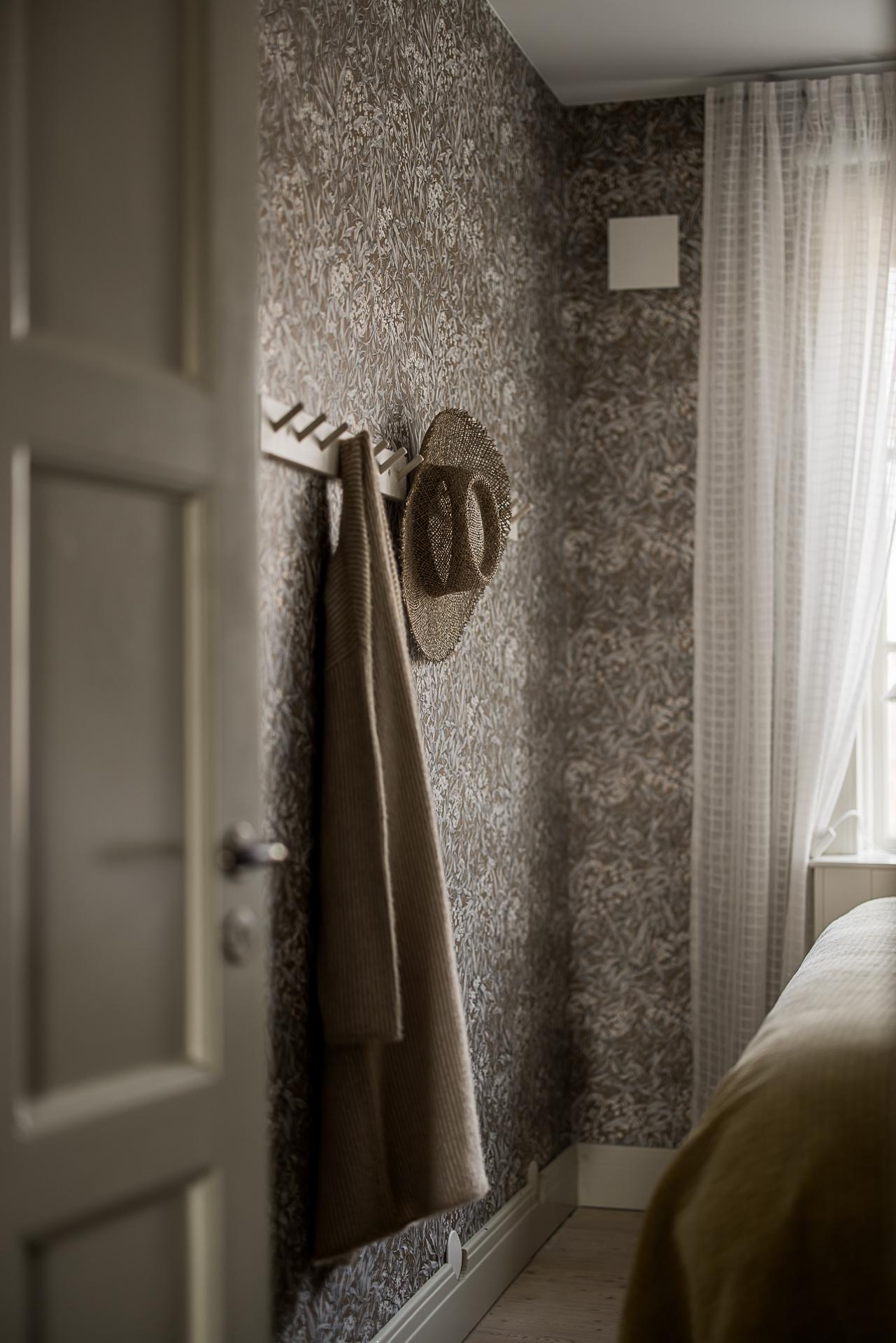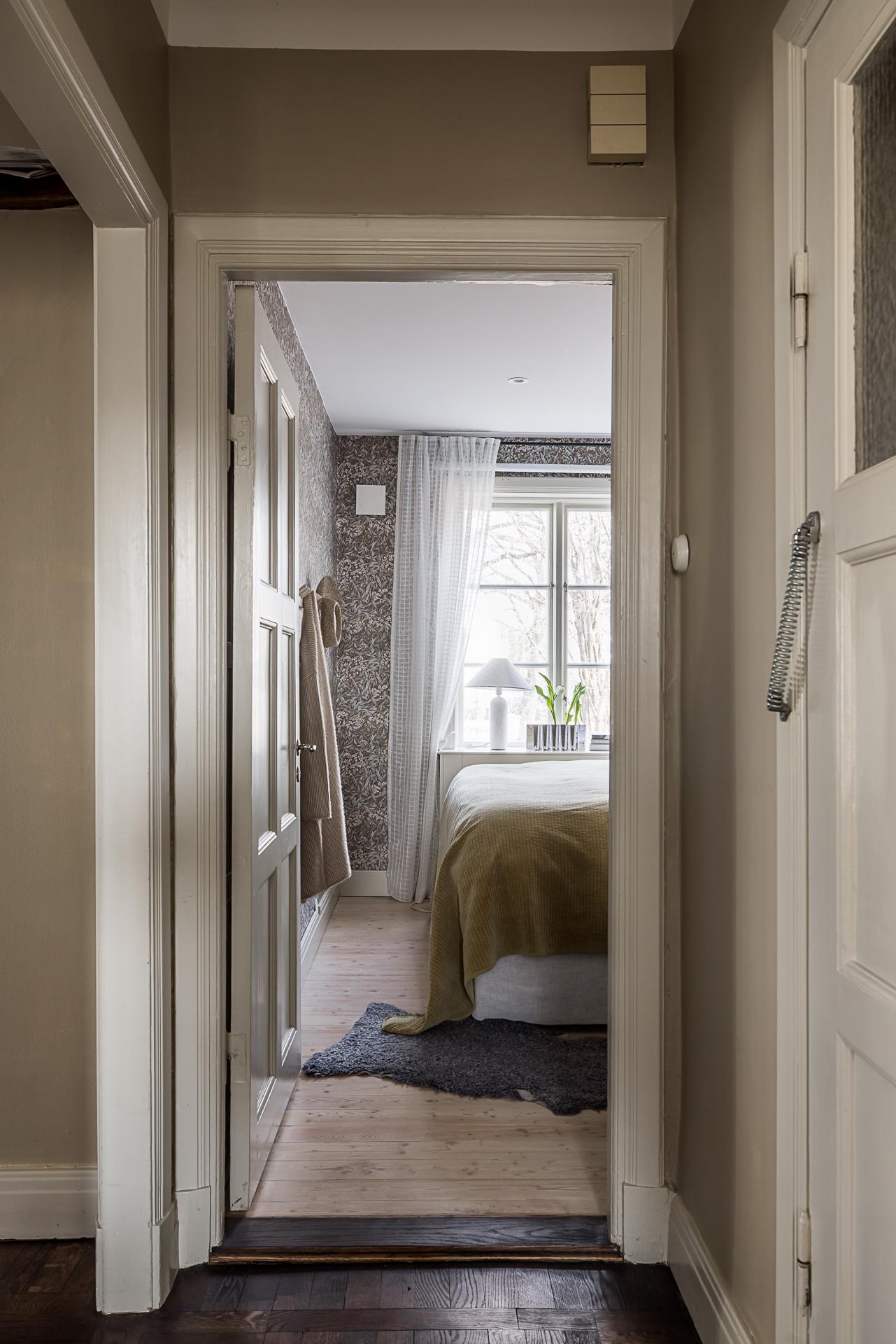 Sovrummet rymmer lätt och ledigt en dubbelsäng, och tack vare husets rofyllda läge sover man gott om natten. Här finns även skjutdörrsgarderober som sväljer det mesta i klädväg. Väggarna är tapetserade med en vacker tapet och det framtagna brädgolvet behandlat med mörkt hårdvax.
