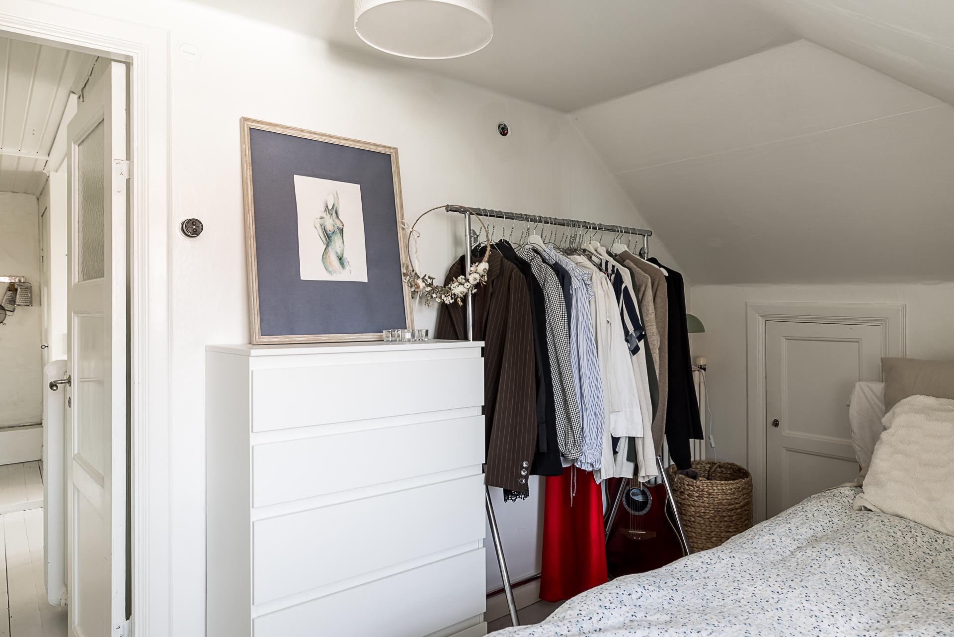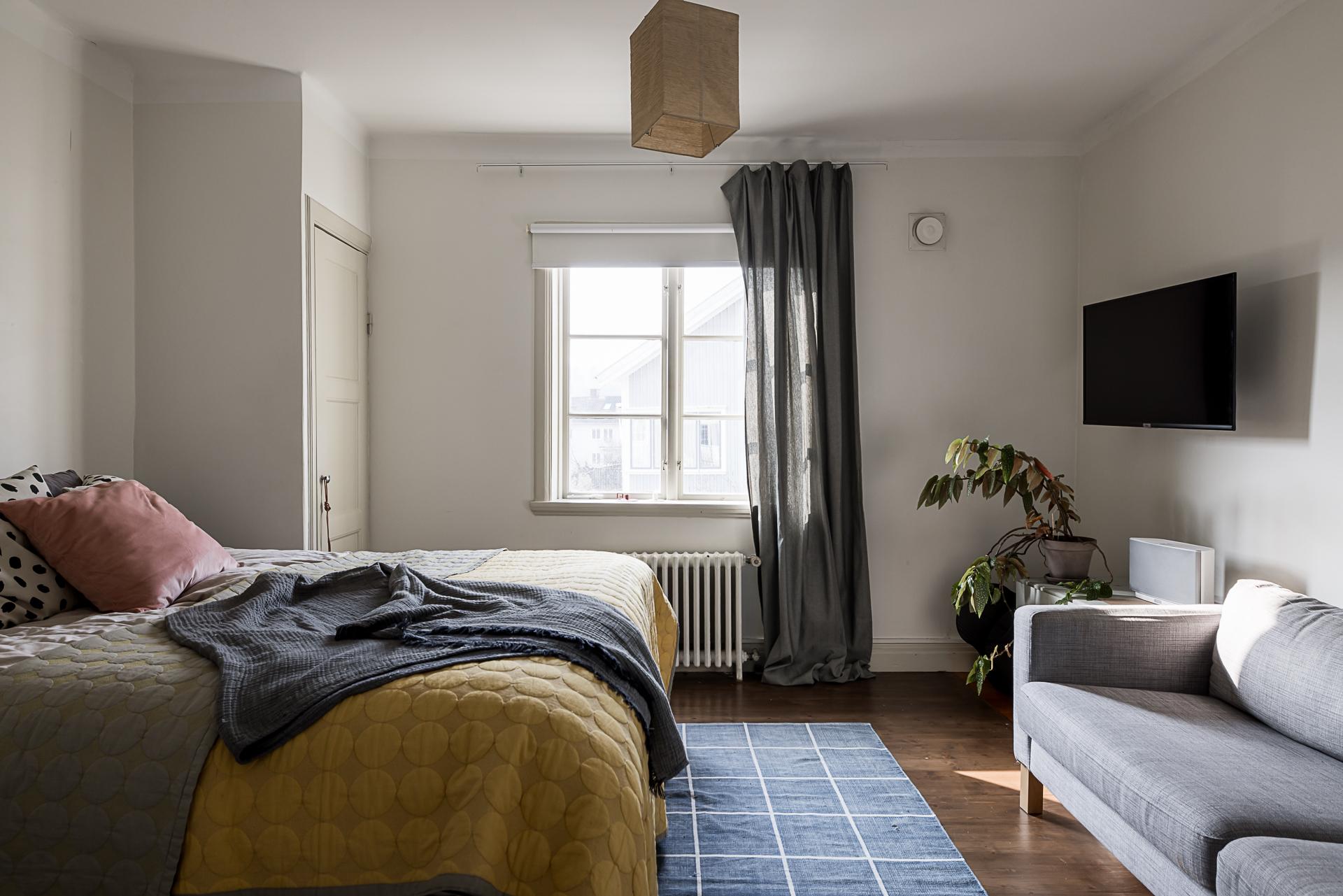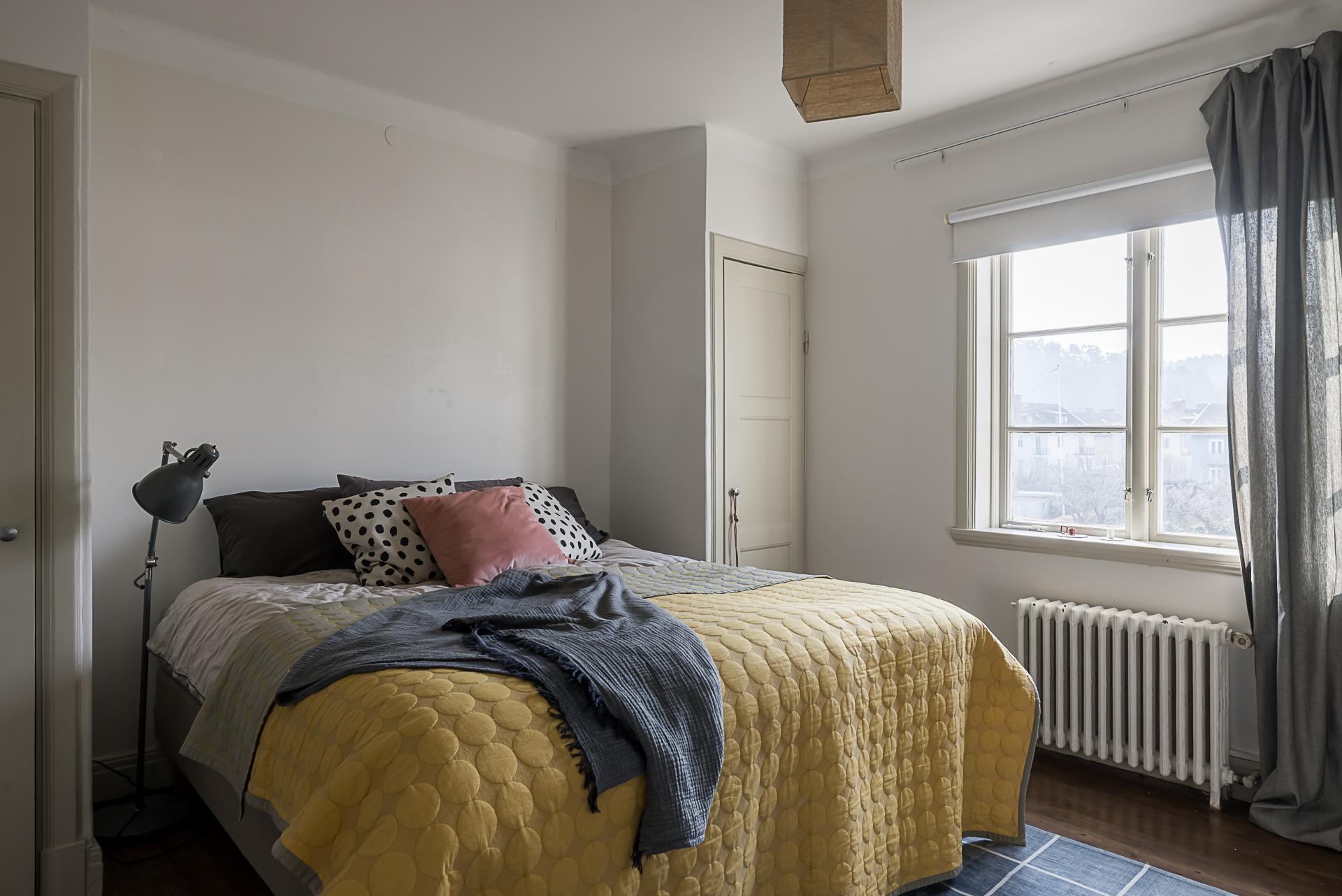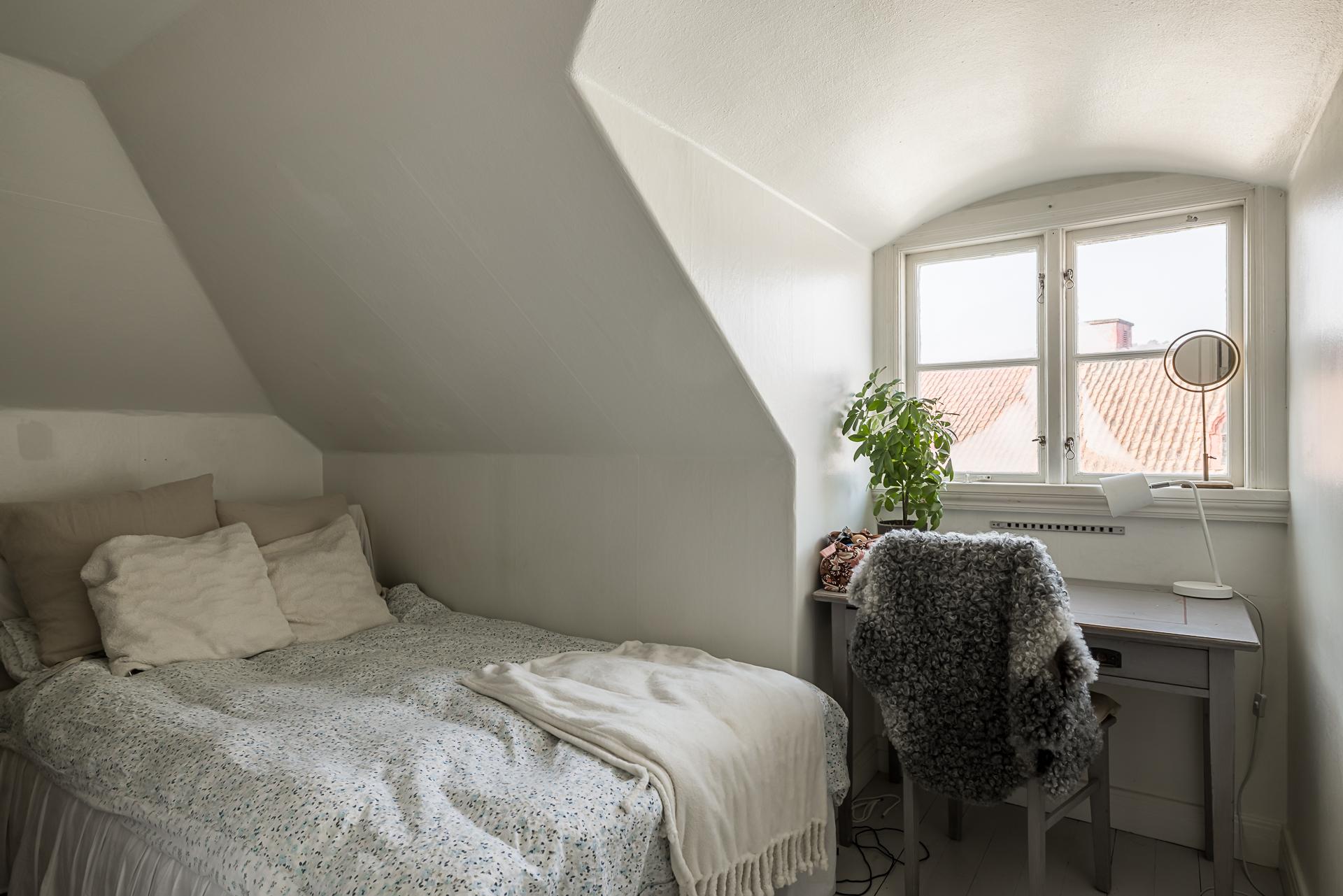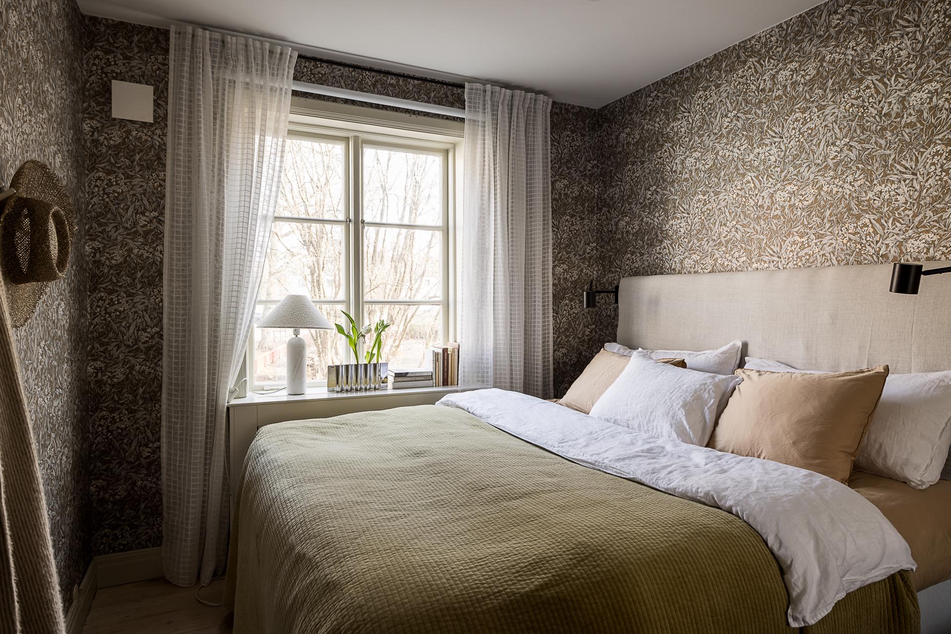Sovrummet rymmer lätt och ledigt en dubbelsäng, och tack vare husets rofyllda läge sover man gott om natten. Här finns även skjutdörrsgarderober som sväljer det mesta i klädväg. Väggarna är tapetserade med en vacker tapet och det framtagna brädgolvet behandlat med mörkt hårdvax.