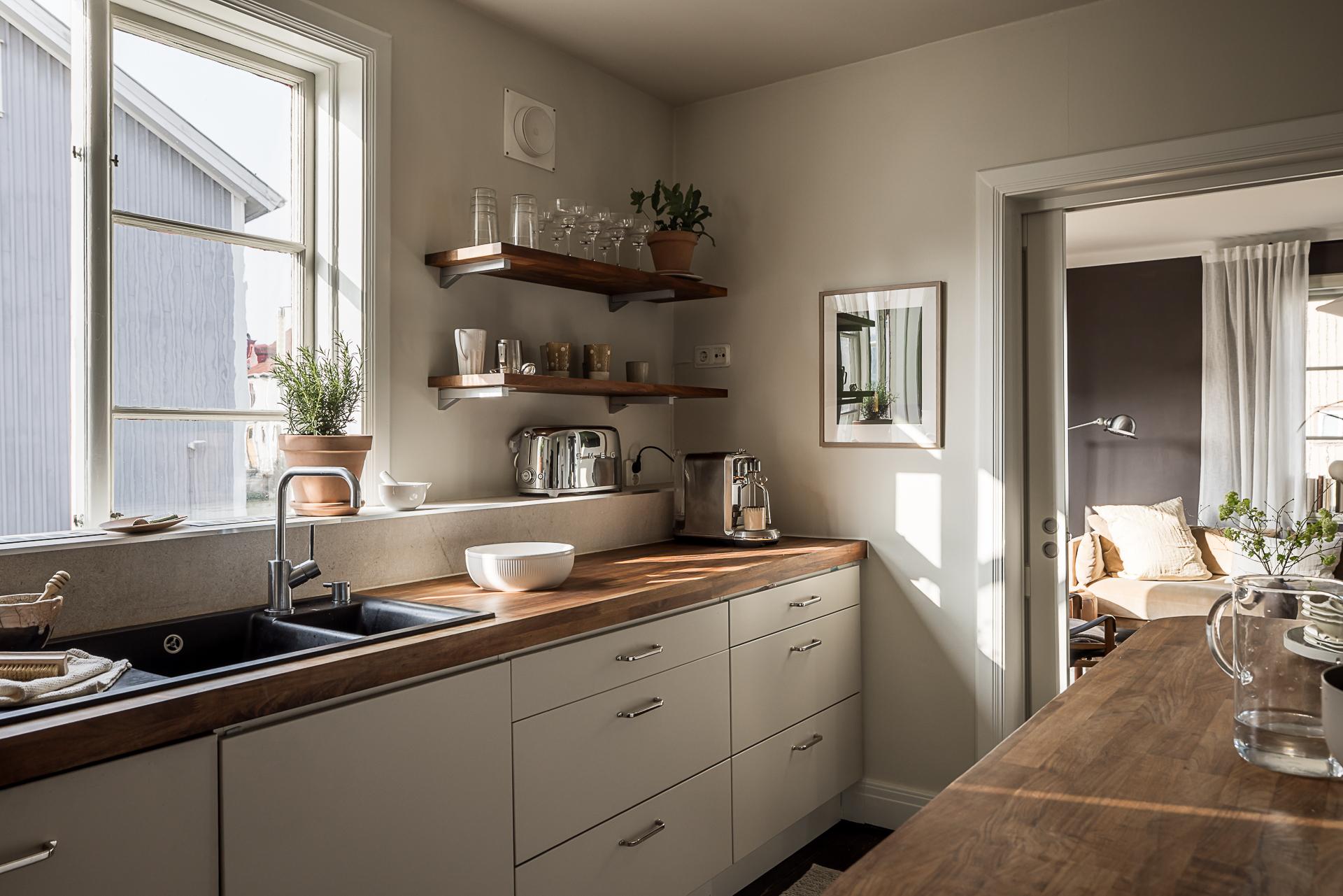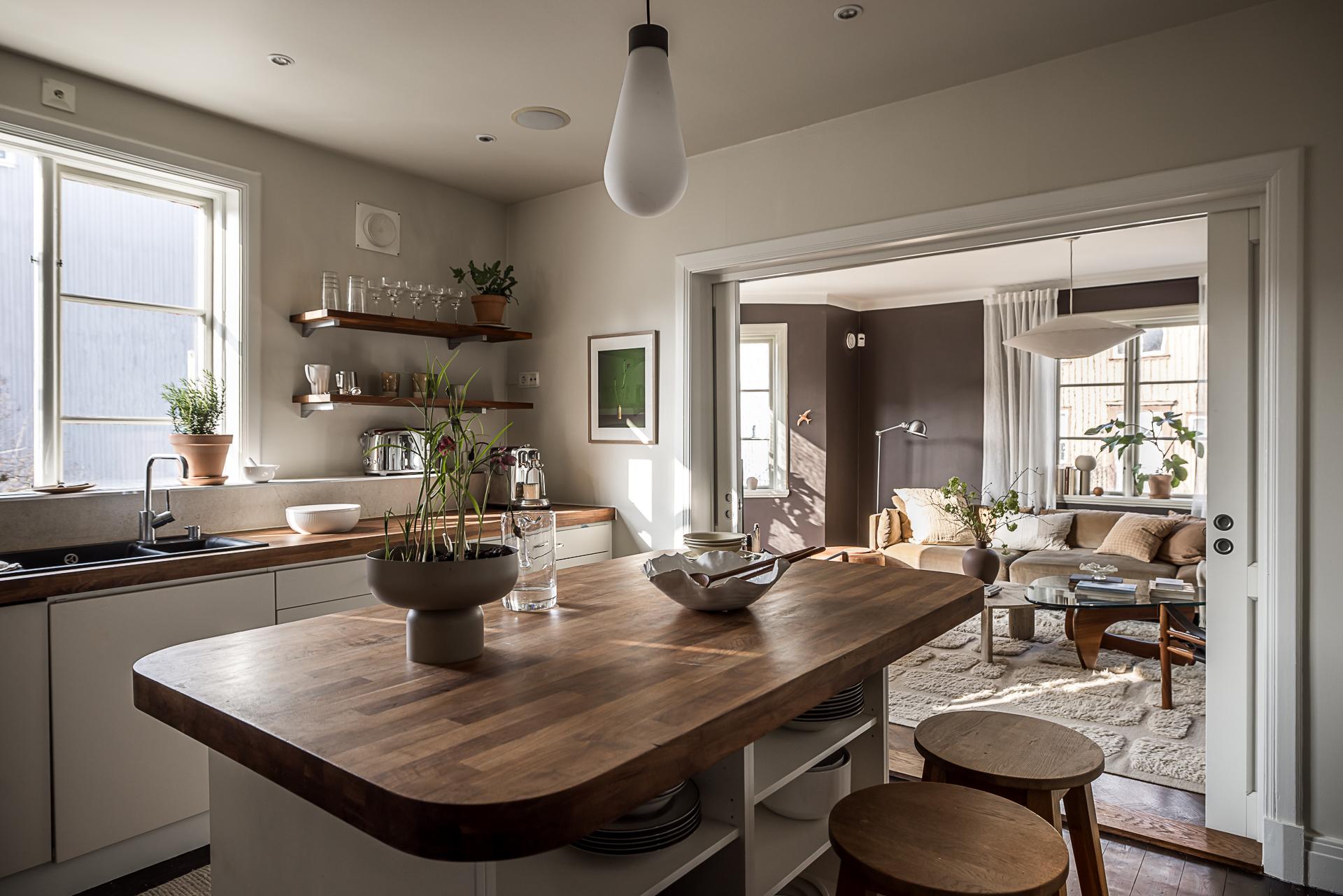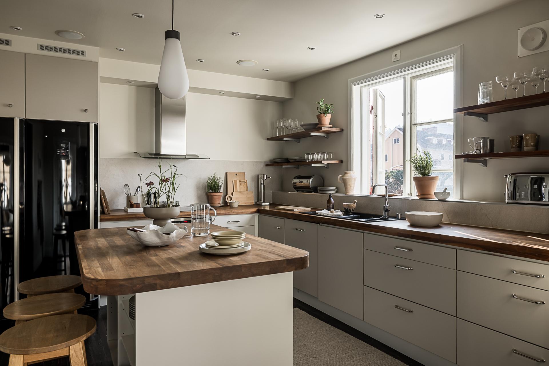 Skjutdörrar öppnar och skiljer av mot ett stort kök där familj och vänner kan samlas runt en köksö. Det är rejält tilltaget med förvaring och arbetsyta, och köksön passar även perfekt som serveringsbänk under stora middagsbjudningar. Skåpen har ljusgrå luckor och lådor, och bänkskivorna är liksom de öppna hyllplanen i valnöt. Ugnen och fläkten är i rostfri design medan kylen/frysen (side-by-side) är svart. Diskmaskinen är integrerad i inredningen. Kökets väggar och tak är målade i gråbeige, och det framtagna brädgolvet behandlat med mörkt hårdvax.