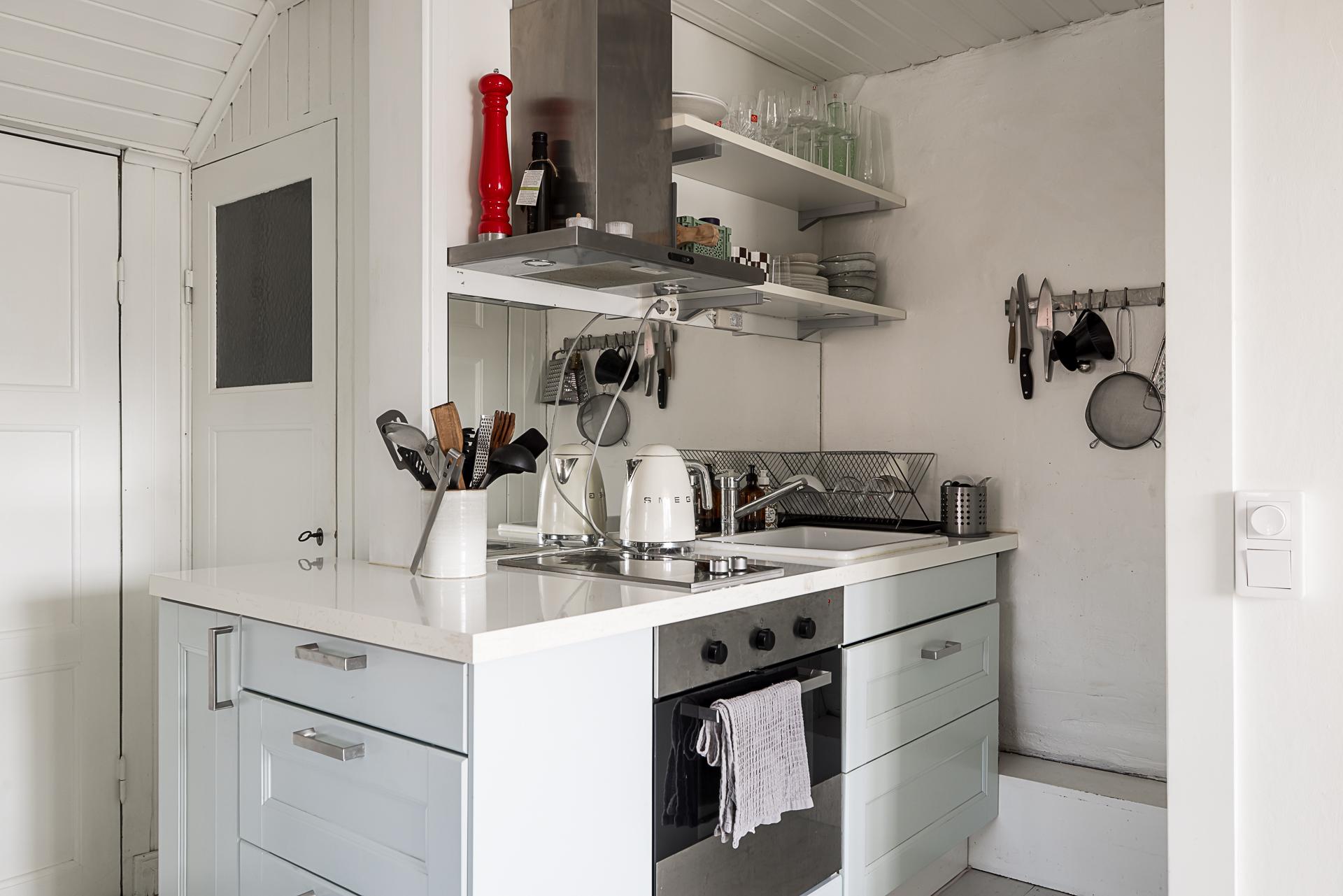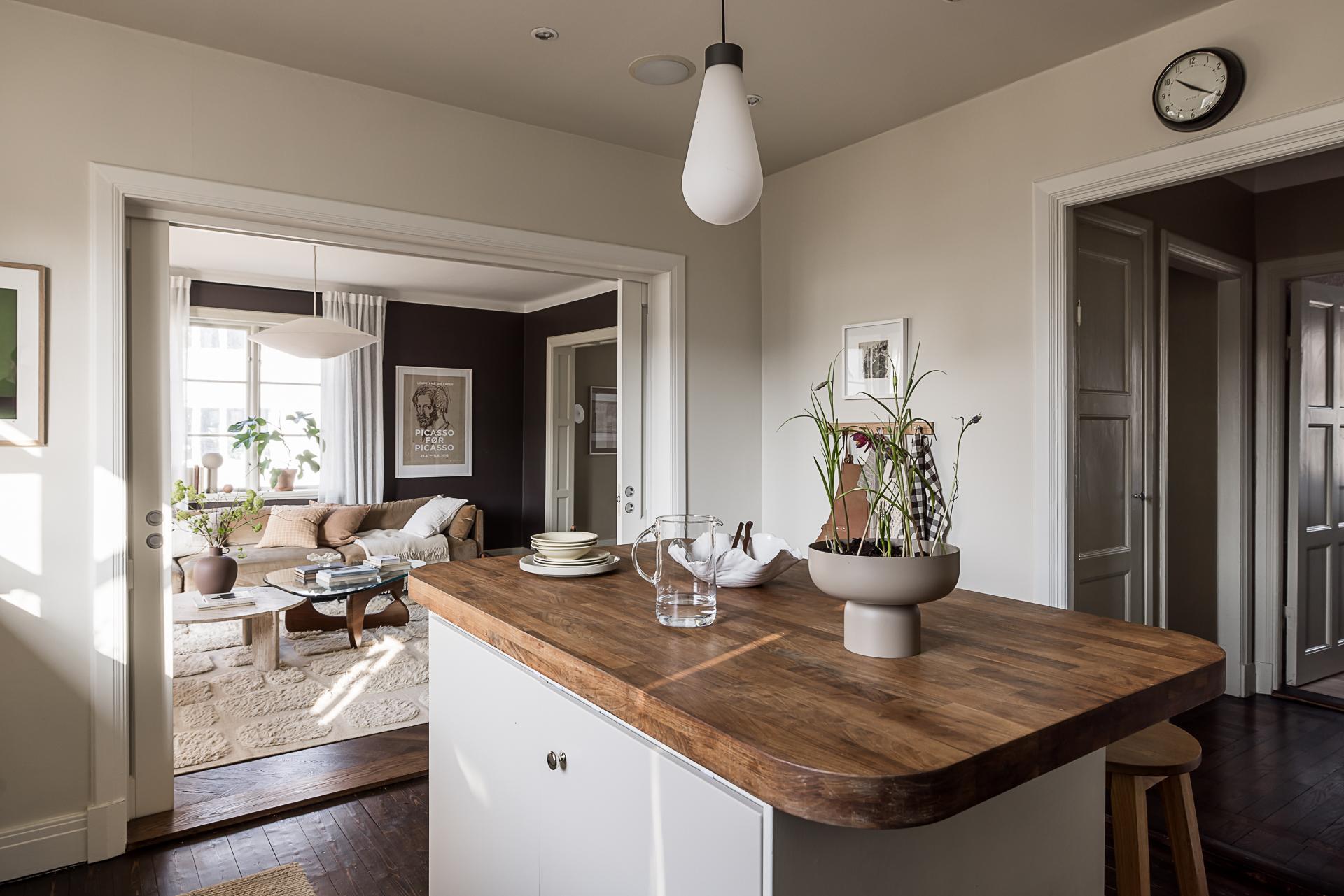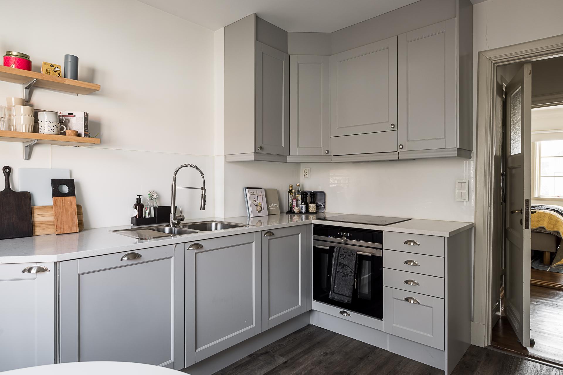 Skjutdörrar öppnar och skiljer av mot ett stort kök där familj och vänner kan samlas runt en köksö. Det är rejält tilltaget med förvaring och arbetsyta, och köksön passar även perfekt som serveringsbänk under stora middagsbjudningar. Skåpen har ljusgrå luckor och lådor, och bänkskivorna är liksom de öppna hyllplanen i valnöt. Ugnen och fläkten är i rostfri design medan kylen/frysen (side-by-side) är svart. Diskmaskinen är integrerad i inredningen. Kökets väggar och tak är målade i gråbeige, och det framtagna brädgolvet behandlat med mörkt hårdvax.