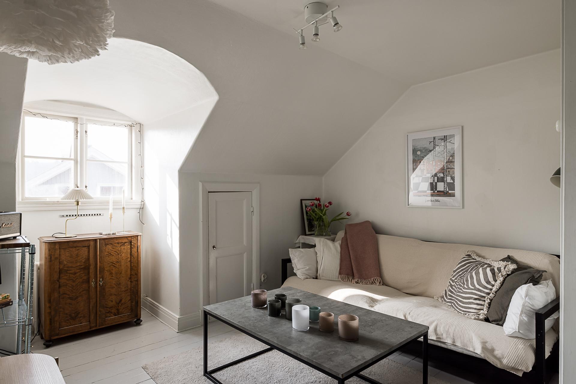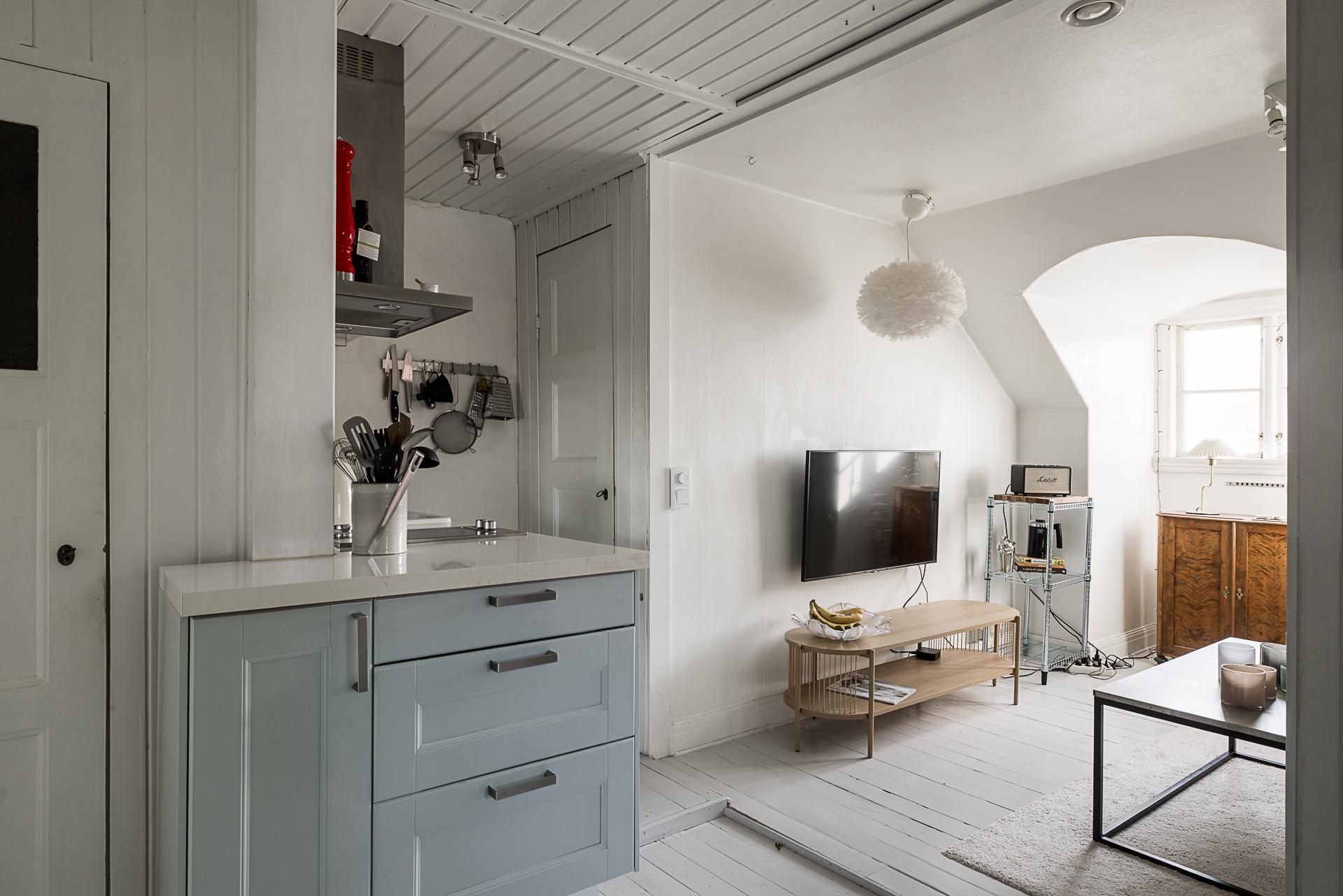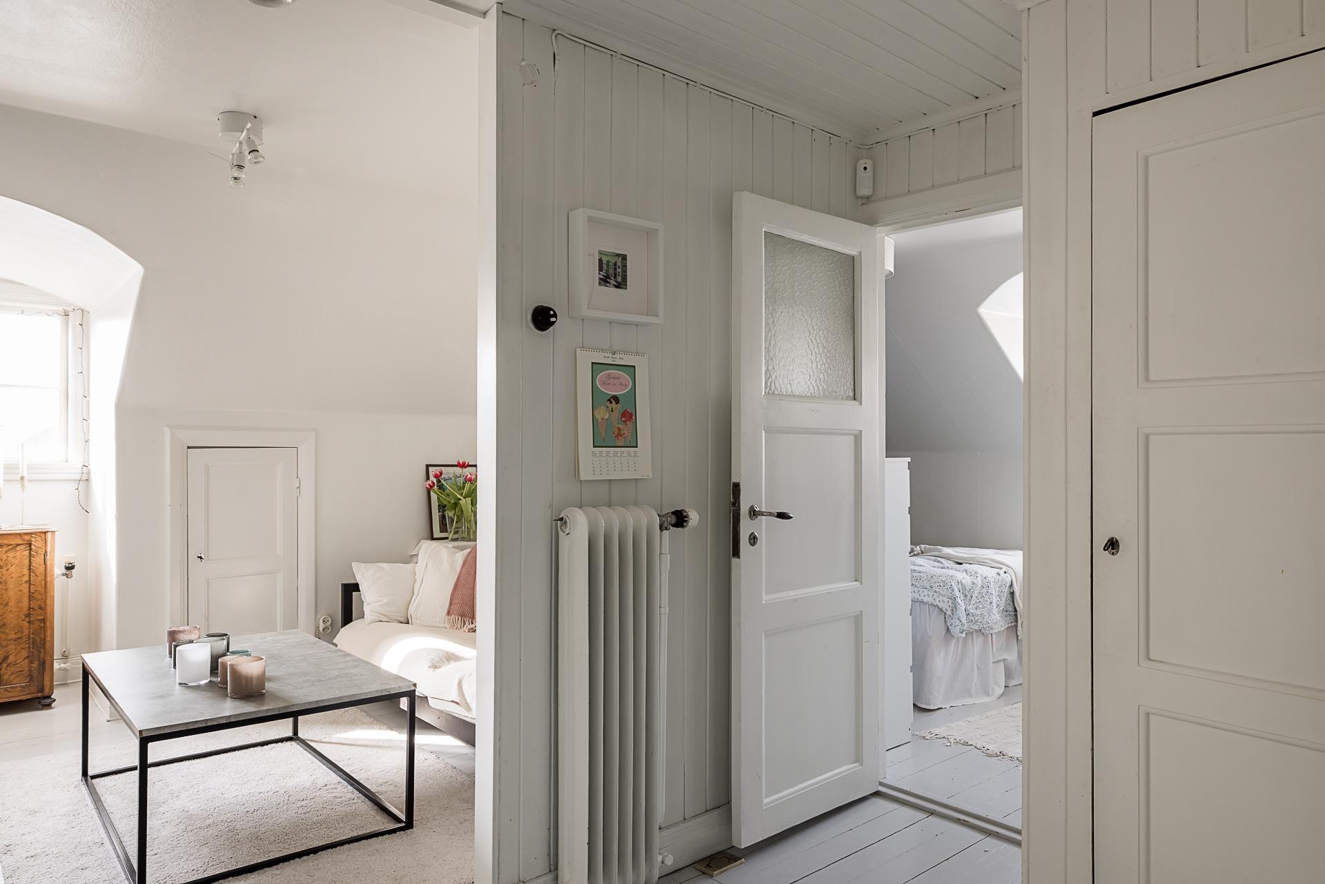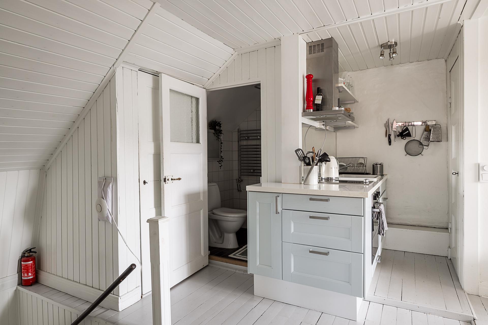 Husets vind är inrett med sovrum, badrum, vardagsrum och en komplett köksdel. Väggarna – inklusive de charmiga träpanelerna – är vitmålade och det fina brädgolvet lackat i ljusgrått. Snedtaket skapar en mysig atmosfär, och vackra takkupor ger ljusinsläpp från två olika håll. Det finns även takkupa i råvinden som används som förråd.
