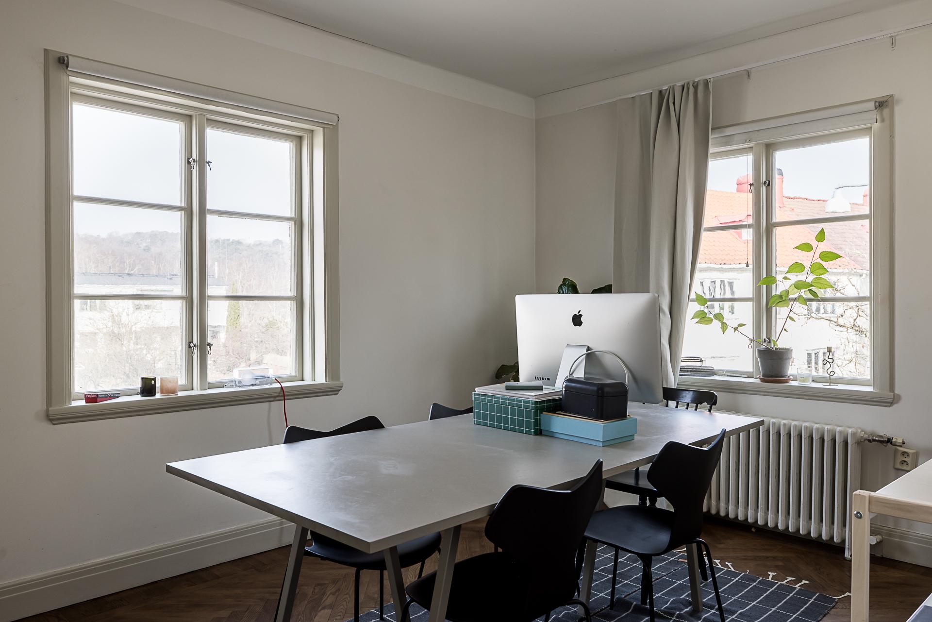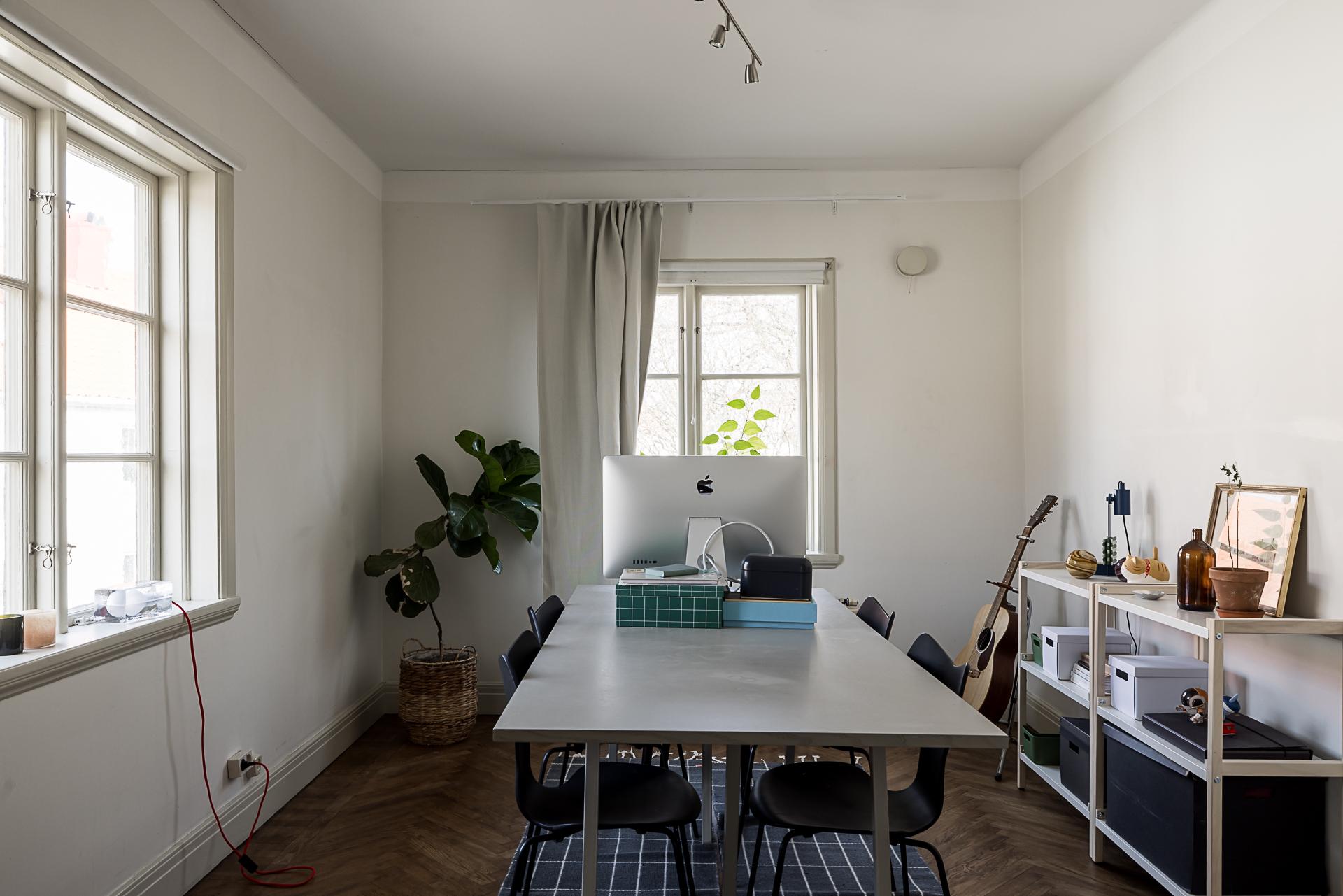 Båda sovrummen har plats för dubbelsäng, och i det ena finns även två inbyggda garderober. Det andra rummet, med fönster i två väderstreck, används idag som arbetsrum och passar även bra som matsal. Väggarna är ljusmålade och golven – fiskbensparkett och framtaget brädgolv – lackade.