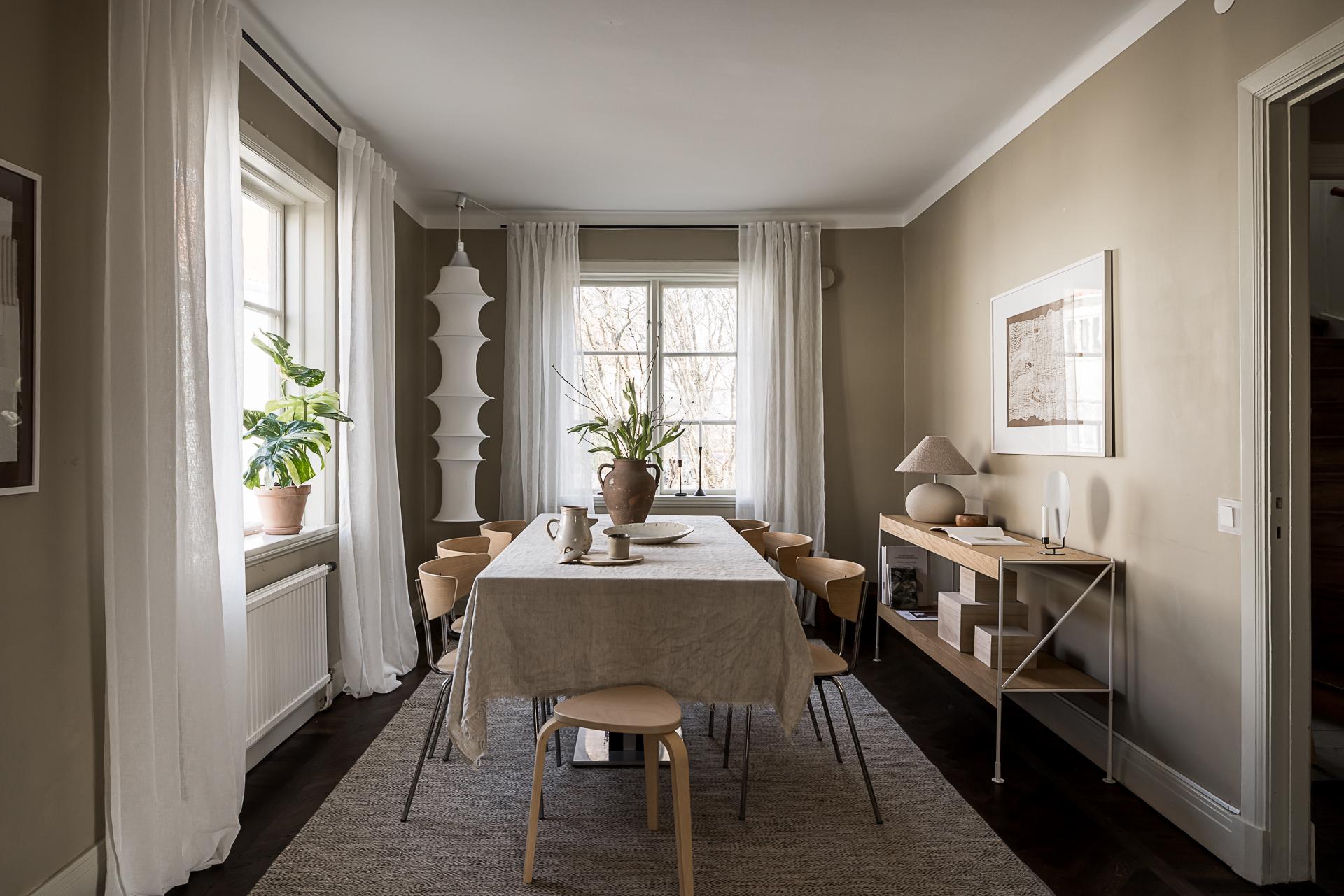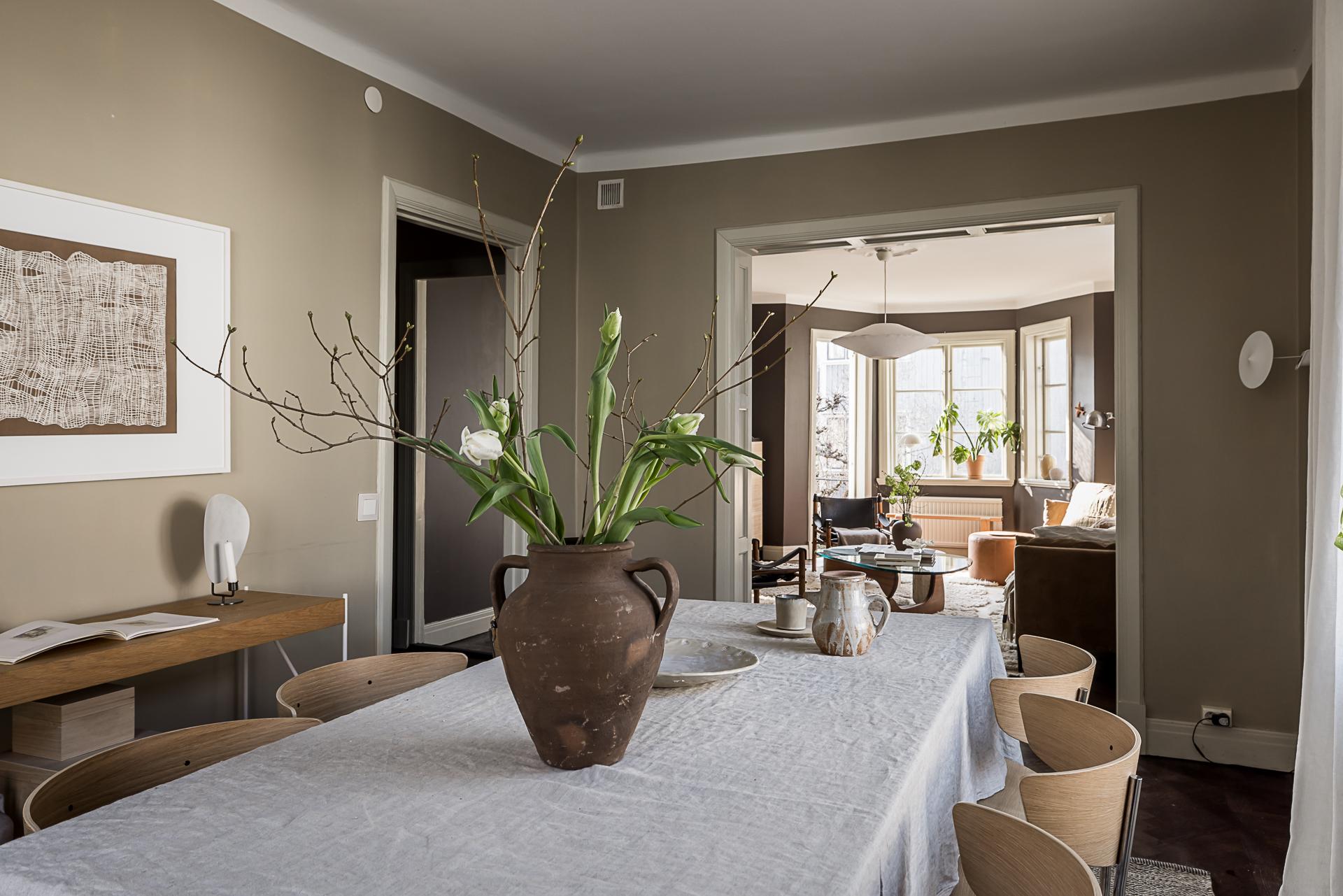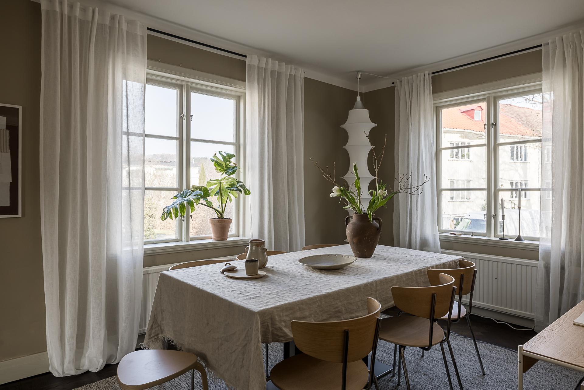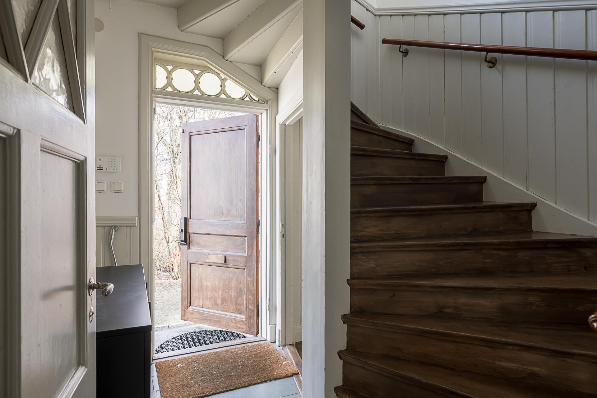 Fönster i tre väderstreck fyller detta rymliga gavelradhus från 1928 med ljus, och de rundgående planlösningarna med många dörröppningar låter solens strålar vandra mellan rummen. Såväl exteriören som interiören är välbevarad, och originaldetaljer såsom spegeldörrar, lister, takrosetter och golvstående gjutjärnsradiatorer ger en vacker inramning. Renoveringar har utförts löpande, och den gammaldags charmen samsas med tidlösa materialval på ett tilltalande sätt. Huset är idag uppdelat i två kompletta trerumslägenheter med varsin entré från ett gemensamt trapphus. Det finns även en separat vindsvåning med badrum och köksdel. Om så önskas kan hela huset disponeras som en och samma bostad, så med andra ord passar det bra vare sig man är en stor familj med stort umgänge, önskar sig ett generationsboende eller vill finansiera en del av driftkostnaderna genom uthyrning. Källaren består av garage, gästrum, tvättstuga och ett stort badrum med bastu och utrymme för att inreda en relaxhörna.