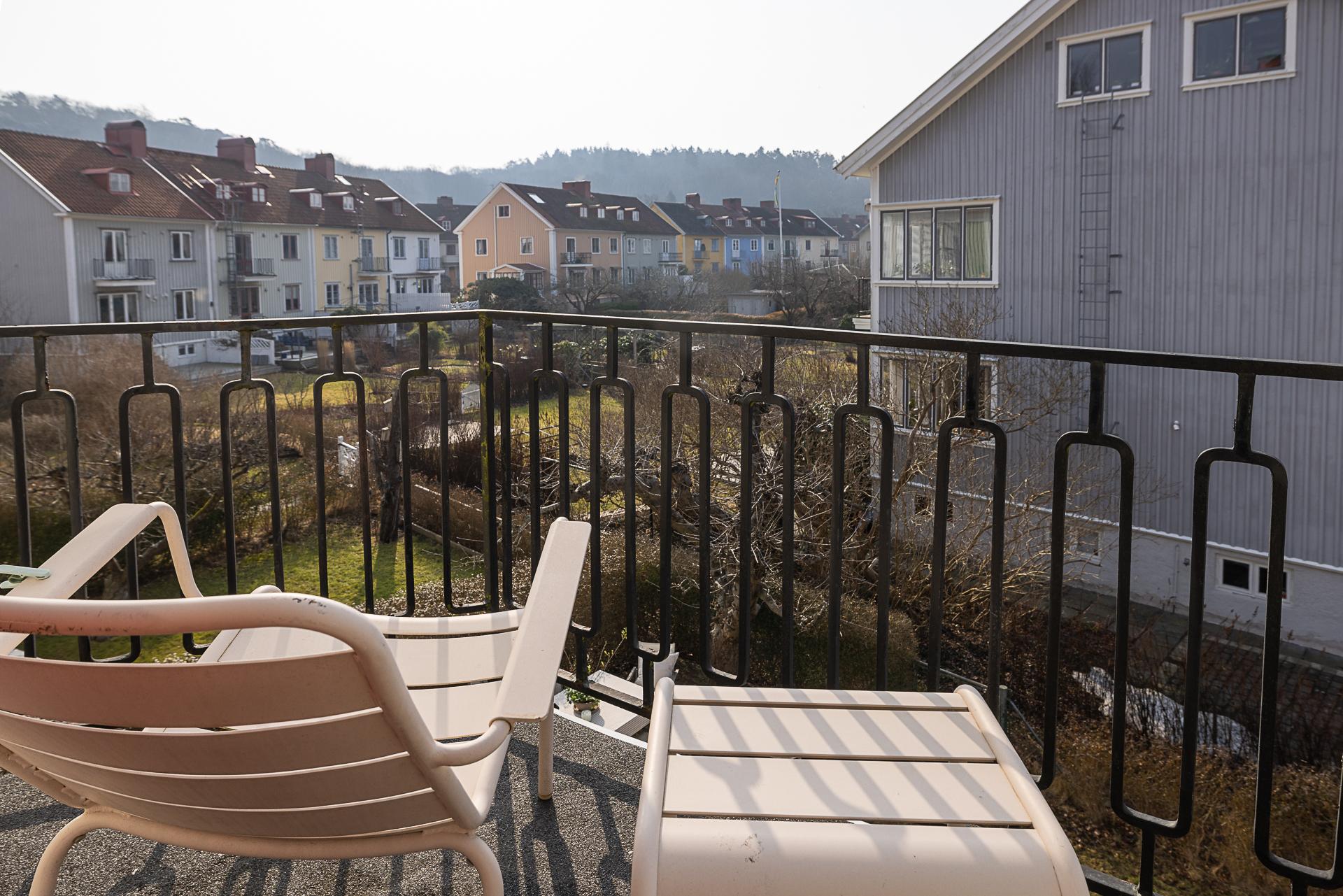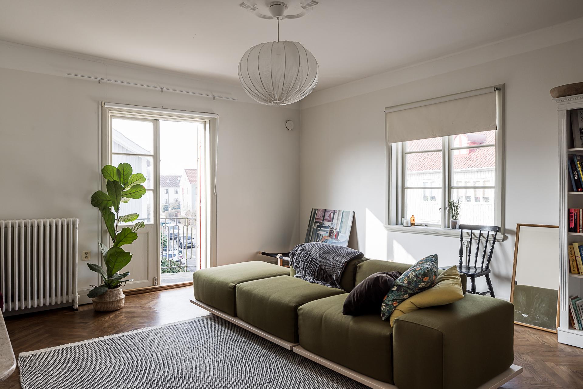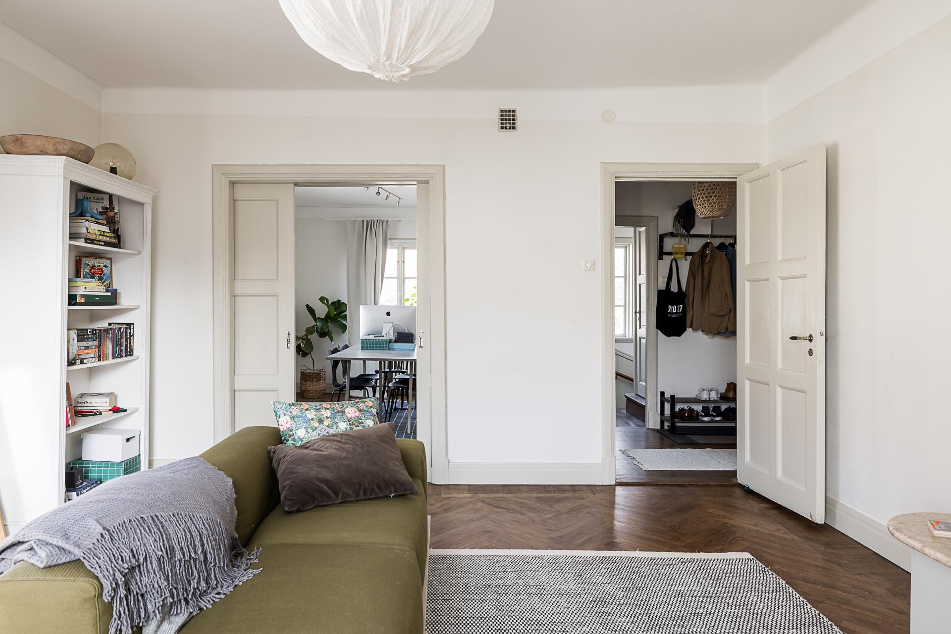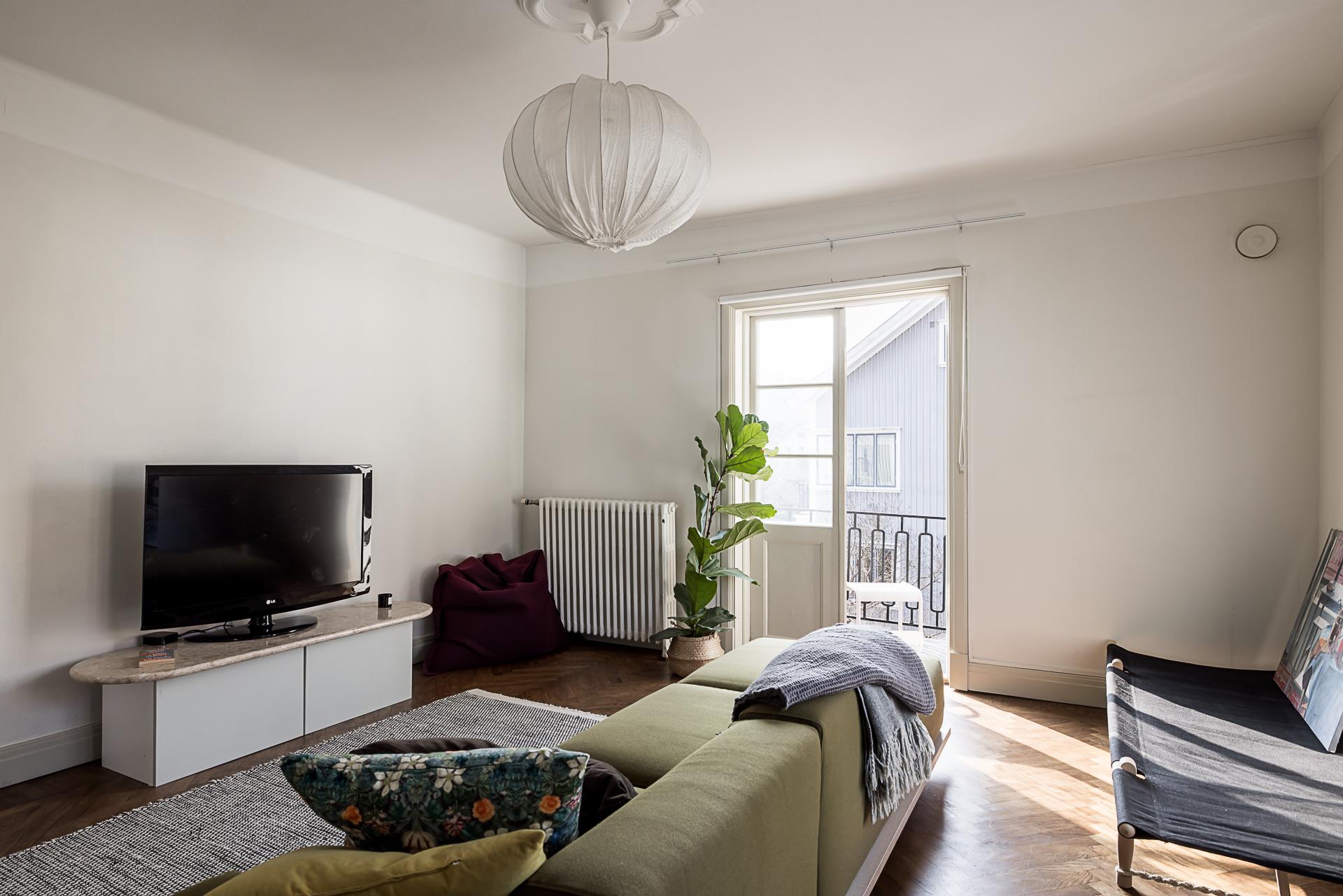 Även övervåningen är en separat trerumslägenhet, men med en annorlunda planlösning. Det stora vardagsrummet har fönster i nordväst och utgång till en solig balkong i sydväst med fin vy över kvarteret och trädgårdarna bakom huslängan. Rummets väggar är ljusmålade och golvet belagt med lackad fiskbensparkett.