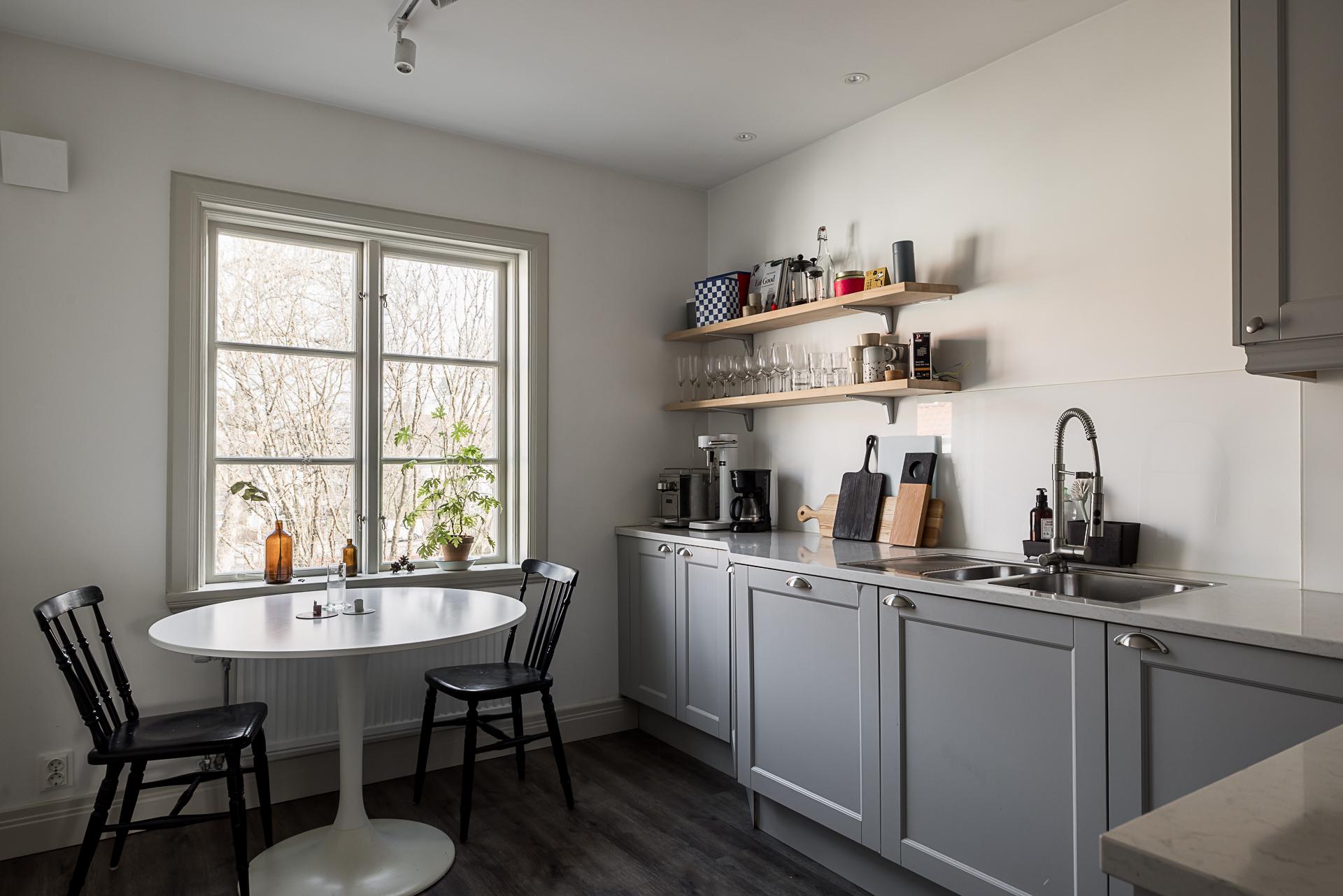 Köket är trivsamt, och intill fönstret finns en ljus och inbjudande matplats. Hemmakockarna har bra svängrum, och det är även väl tilltaget med förvaring. Ugnen är i rostfri/svart design medan diskmaskinen är integrerad i inredningen. Kylen/frysen (side-by-side) är placerad i en nisch. Kökets väggar är ljusmålade och golvet belagt med mörk parkett från Tarkett.