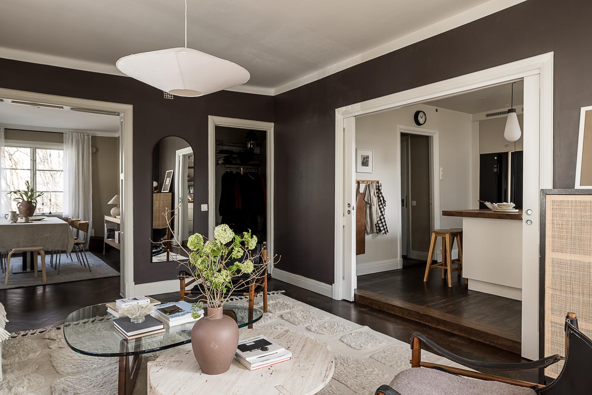 Hallen och serveringsgången binder samman våningen på ett bra sätt, och härifrån når man alla rum förutom köket. Det finns gott om plats för jackavhängning, och bra förvaringsmöjligheter erbjuds i form av en inbyggd och rymlig garderob. Väggarna är målade i gråbeige och golvet belagt med mörk hårdvaxad fiskbensparkett.