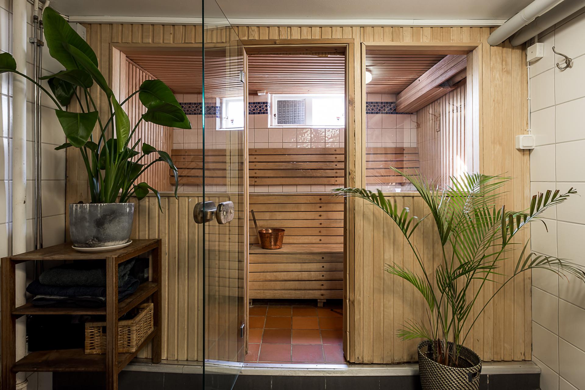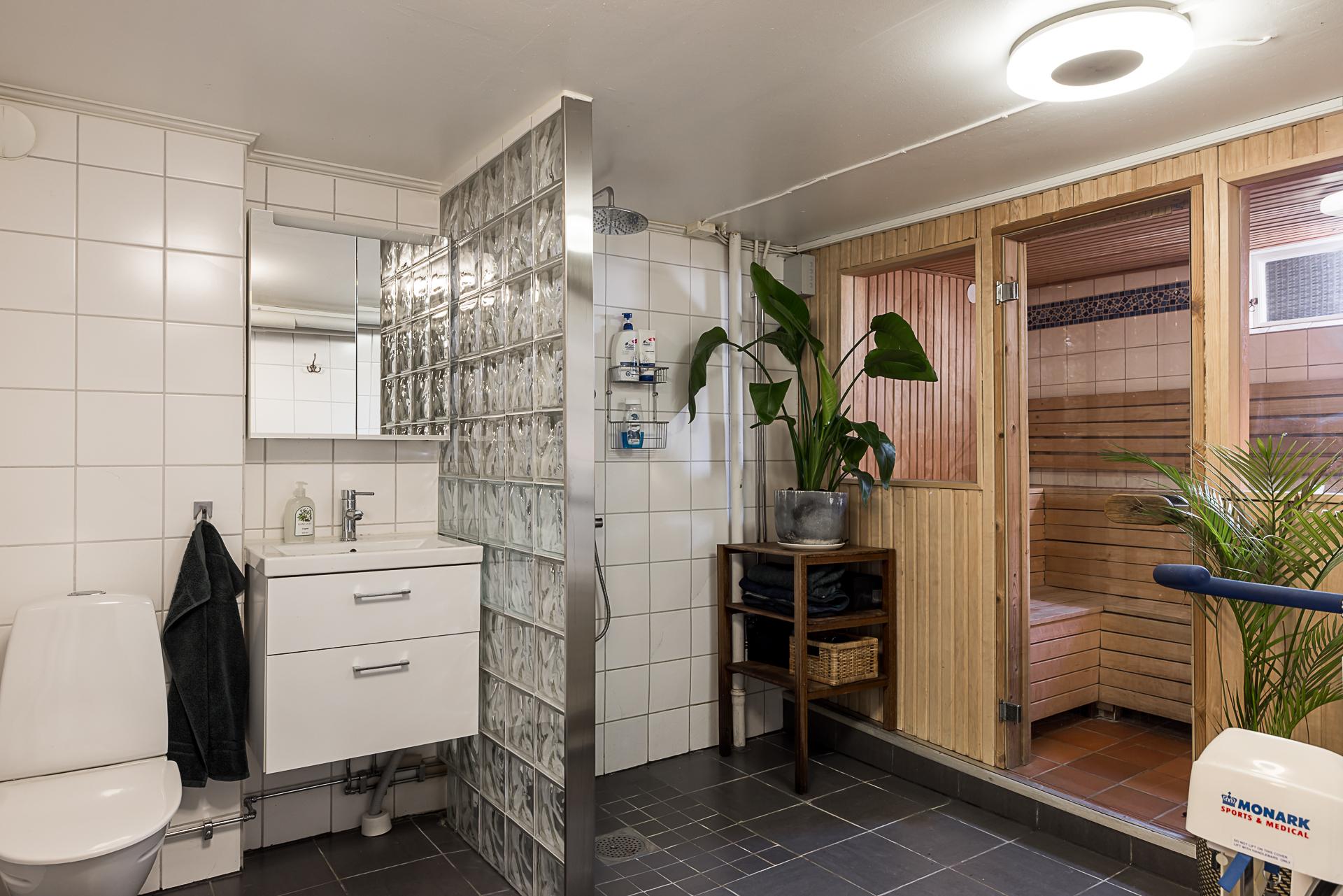 I källaren har man skapat ett stort badrum med lyxig hemmaspakänsla. Här finns förutom duschhörna, tvättkommod och toalett även en rymlig bastu och plats för att inreda en relaxhörna. Väggarna är klädda med vitt kakel och golvet belagt med mörkgrå klinker med golvvärme. Källaren består också av ett gästrum med golvvärme, en tvättstuga och ett garage med automatisk port. Tvättstugan är utrustad med två tvättmaskiner av olika årsmodell. Det är väl tilltaget med både arbetsyta, förvaring och torkutrymme.