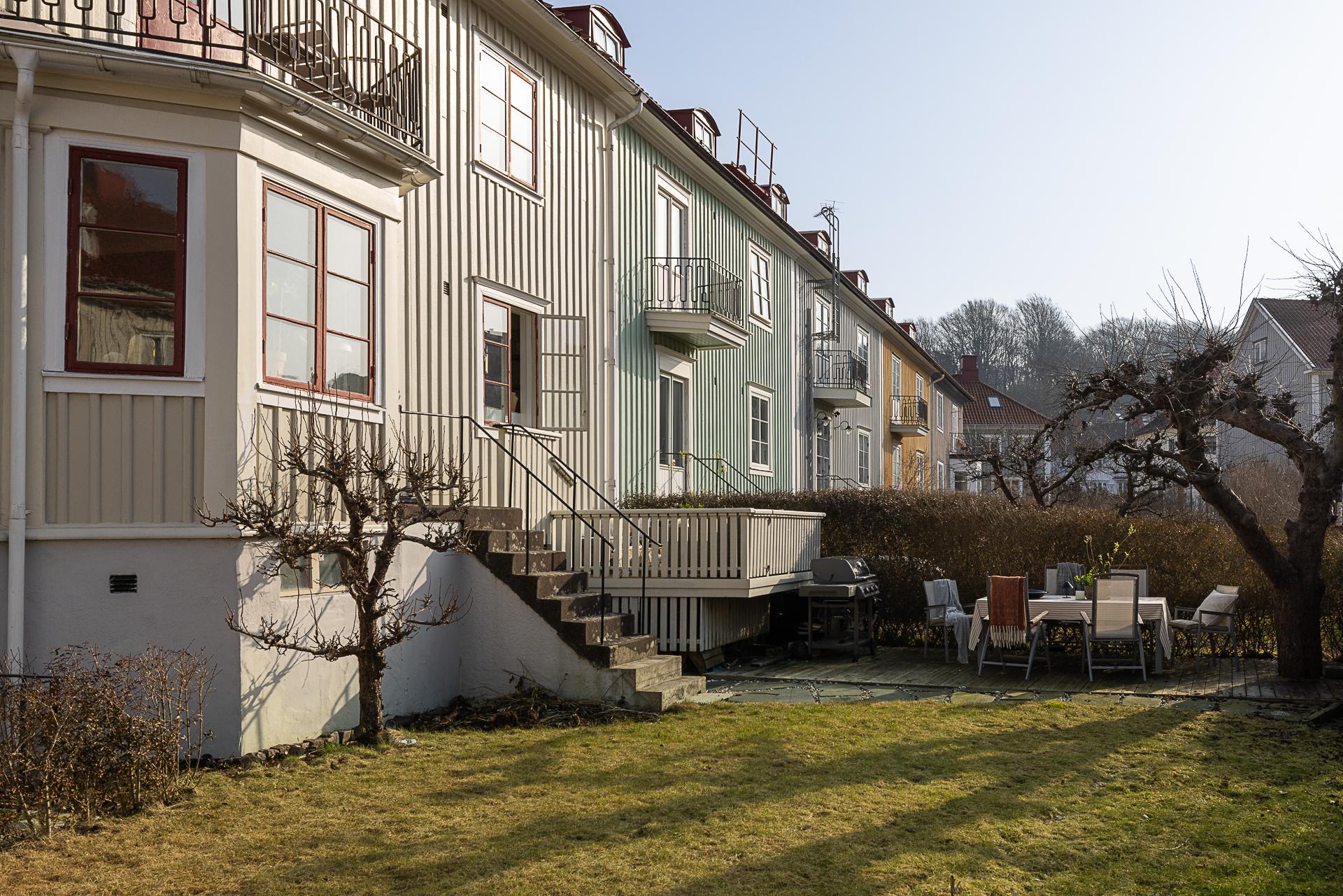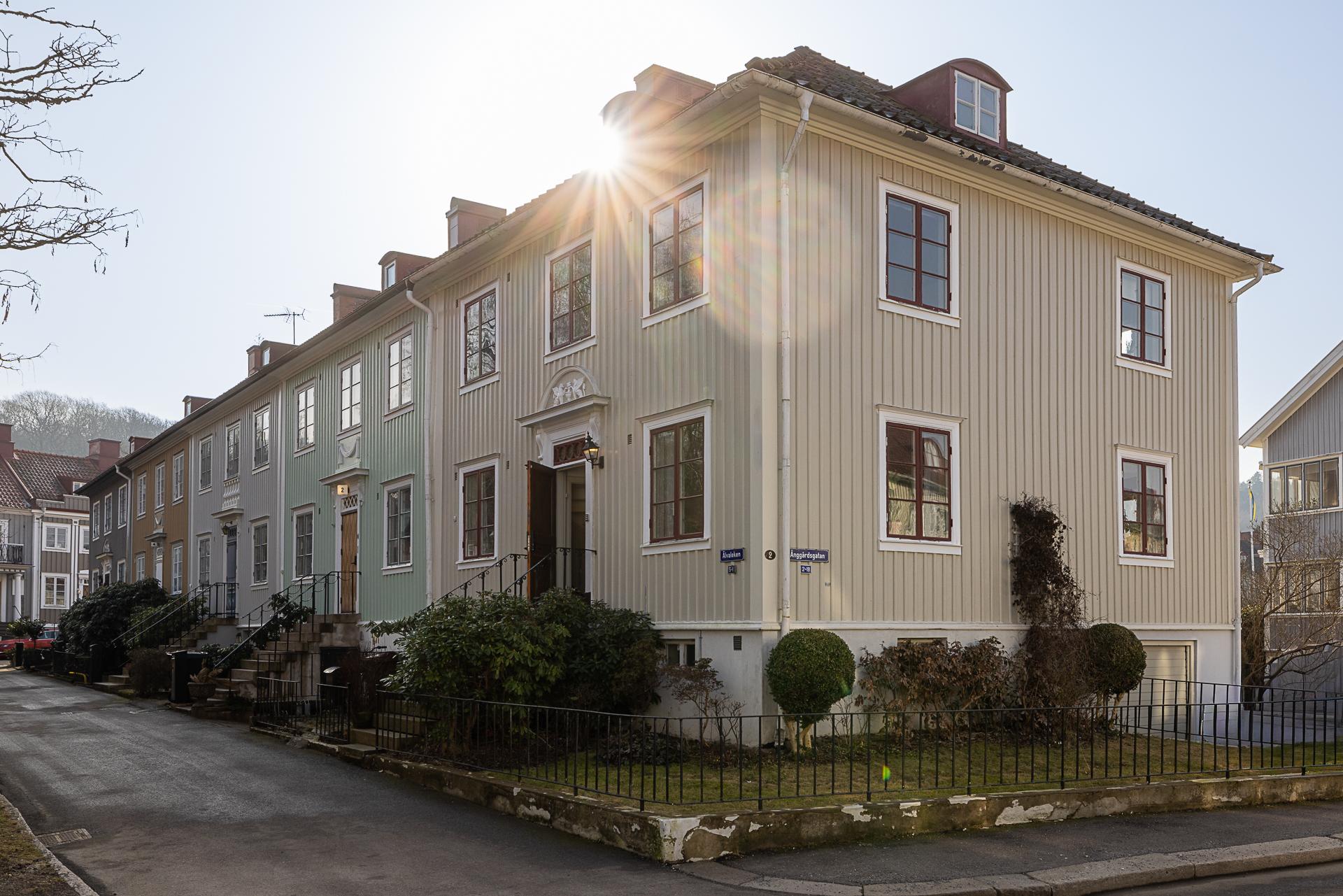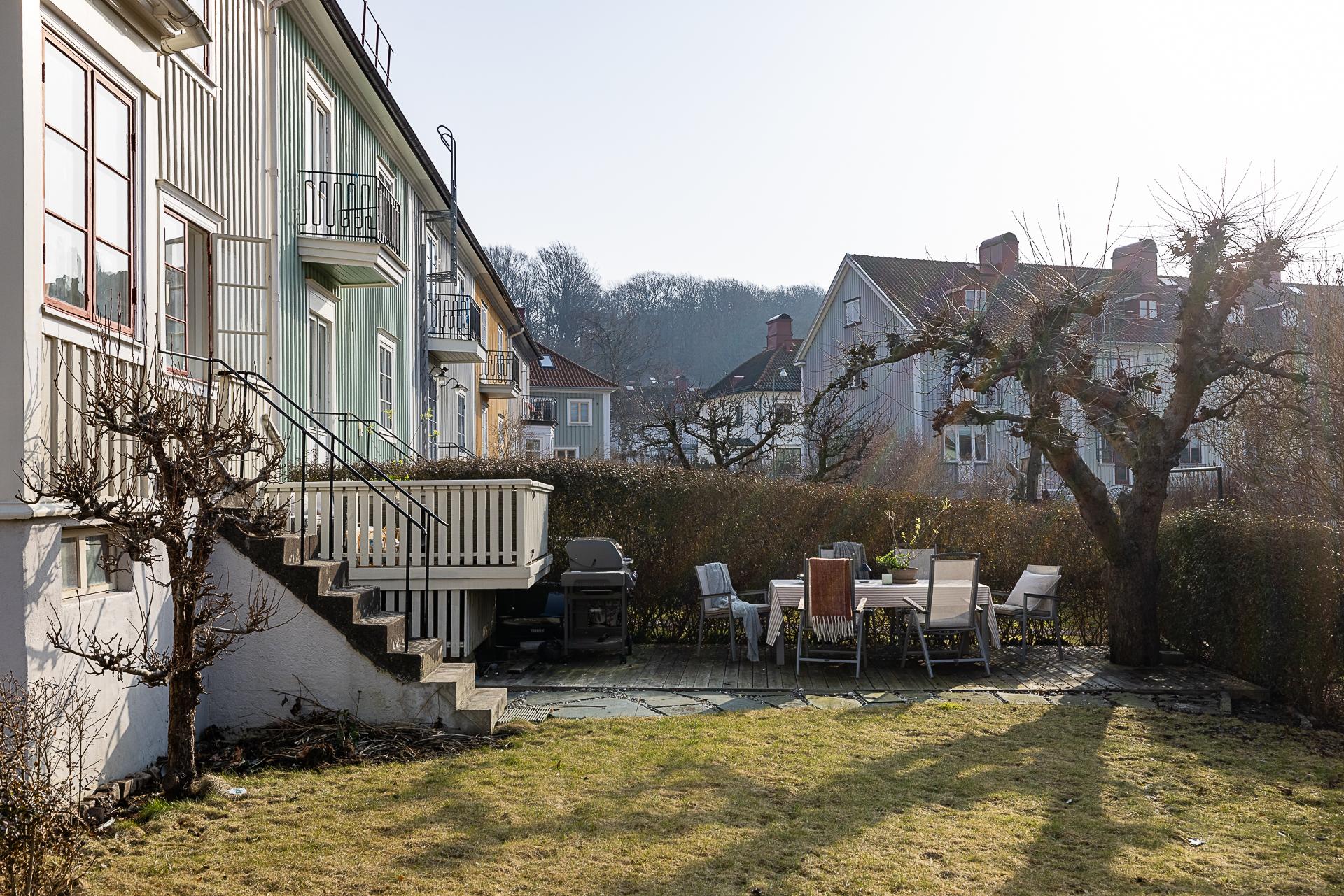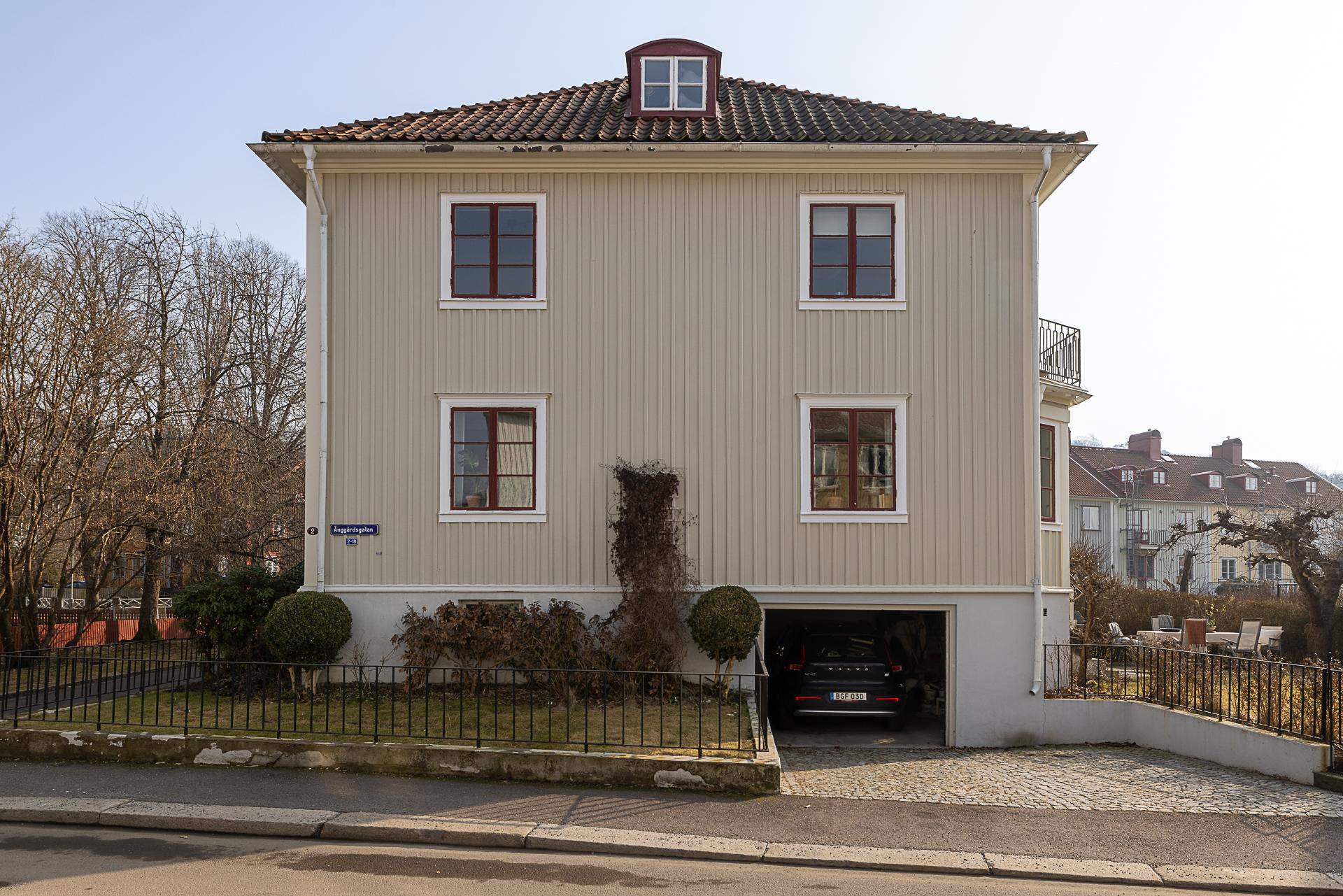 Husets trädgård är en lugn oas med härlig eftermiddags- och kvällssol. Här växer bland annat äppelträd och päronträd, och häckar avgränsar mot gatan och grannarna. En upphöjd terrass och en stensatt uteplats i marknivå bjuder in till fika och trevliga middagar ute i det gröna. Ett barnvänligt boende erbjuds, och strax utanför husets vackra entré ligger en park med lummigt inramad lekplats. Läget är perfekt för familjen som gärna vistas utomhus, och på kort gångavstånd har man Änggårdsbergens naturreservat och Botaniska trädgården. Det är även nära till Slottsskogen och Linnéstaden med sjudande kafé- och restaurangstråk. Med cykel eller spårvagn, endast ett stenkast bort, tar man sig snabbt in till centrum och ut till havet med bad och väntande skärgårdsbåtar. Änggården började byggas ut på 1920-talet enligt en stadsplan av stadsingenjören Albert Lilienberg. Med sina vackra gamla småhus, oregelbundet formade kvarter, vinklade gator och gröna lungor är stadsplanen ett bra exempel på den svenska trädgårdsstaden som hämtade inspiration från de tankar som den engelske stadsplaneraren Ebenezer Howard presenterade i sin skrift ”Garden Cities of Tomorrow”. Det är ett idag mycket eftertraktat område med rofyllt lugn och familjär stämning grannar emellan.
