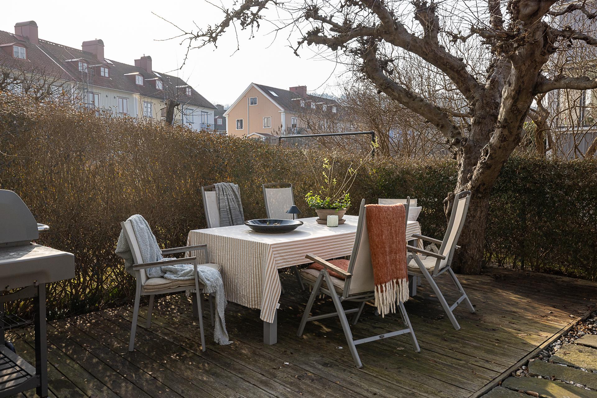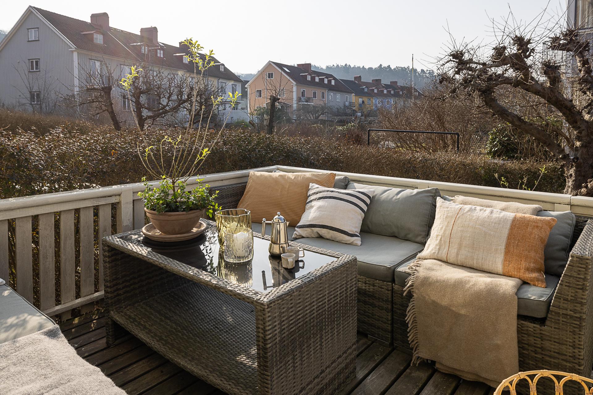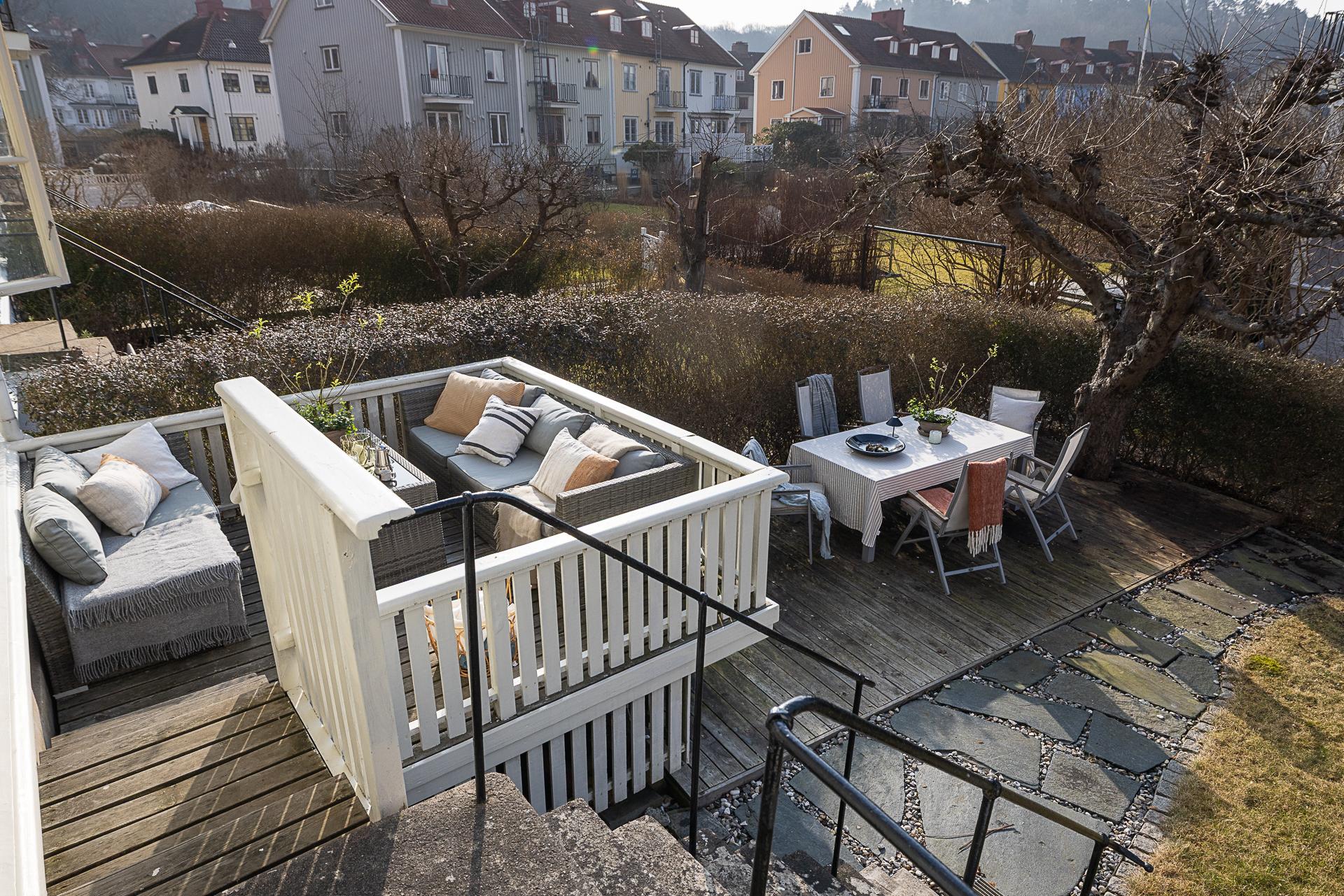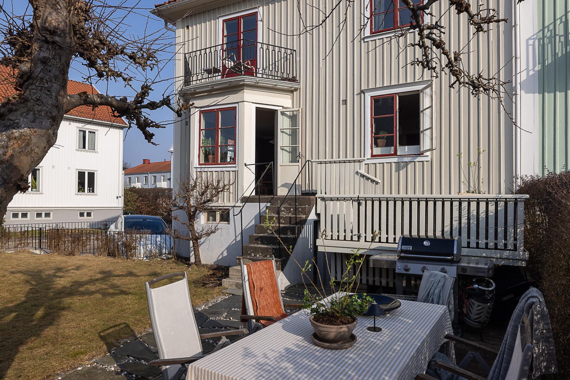 Husets trädgård är en lugn oas med härlig eftermiddags- och kvällssol. Här växer bland annat äppelträd och päronträd, och häckar avgränsar mot gatan och grannarna. En upphöjd terrass och en stensatt uteplats i marknivå bjuder in till fika och trevliga middagar ute i det gröna. Ett barnvänligt boende erbjuds, och strax utanför husets vackra entré ligger en park med lummigt inramad lekplats. Läget är perfekt för familjen som gärna vistas utomhus, och på kort gångavstånd har man Änggårdsbergens naturreservat och Botaniska trädgården. Det är även nära till Slottsskogen och Linnéstaden med sjudande kafé- och restaurangstråk. Med cykel eller spårvagn, endast ett stenkast bort, tar man sig snabbt in till centrum och ut till havet med bad och väntande skärgårdsbåtar. Änggården började byggas ut på 1920-talet enligt en stadsplan av stadsingenjören Albert Lilienberg. Med sina vackra gamla småhus, oregelbundet formade kvarter, vinklade gator och gröna lungor är stadsplanen ett bra exempel på den svenska trädgårdsstaden som hämtade inspiration från de tankar som den engelske stadsplaneraren Ebenezer Howard presenterade i sin skrift ”Garden Cities of Tomorrow”. Det är ett idag mycket eftertraktat område med rofyllt lugn och familjär stämning grannar emellan.