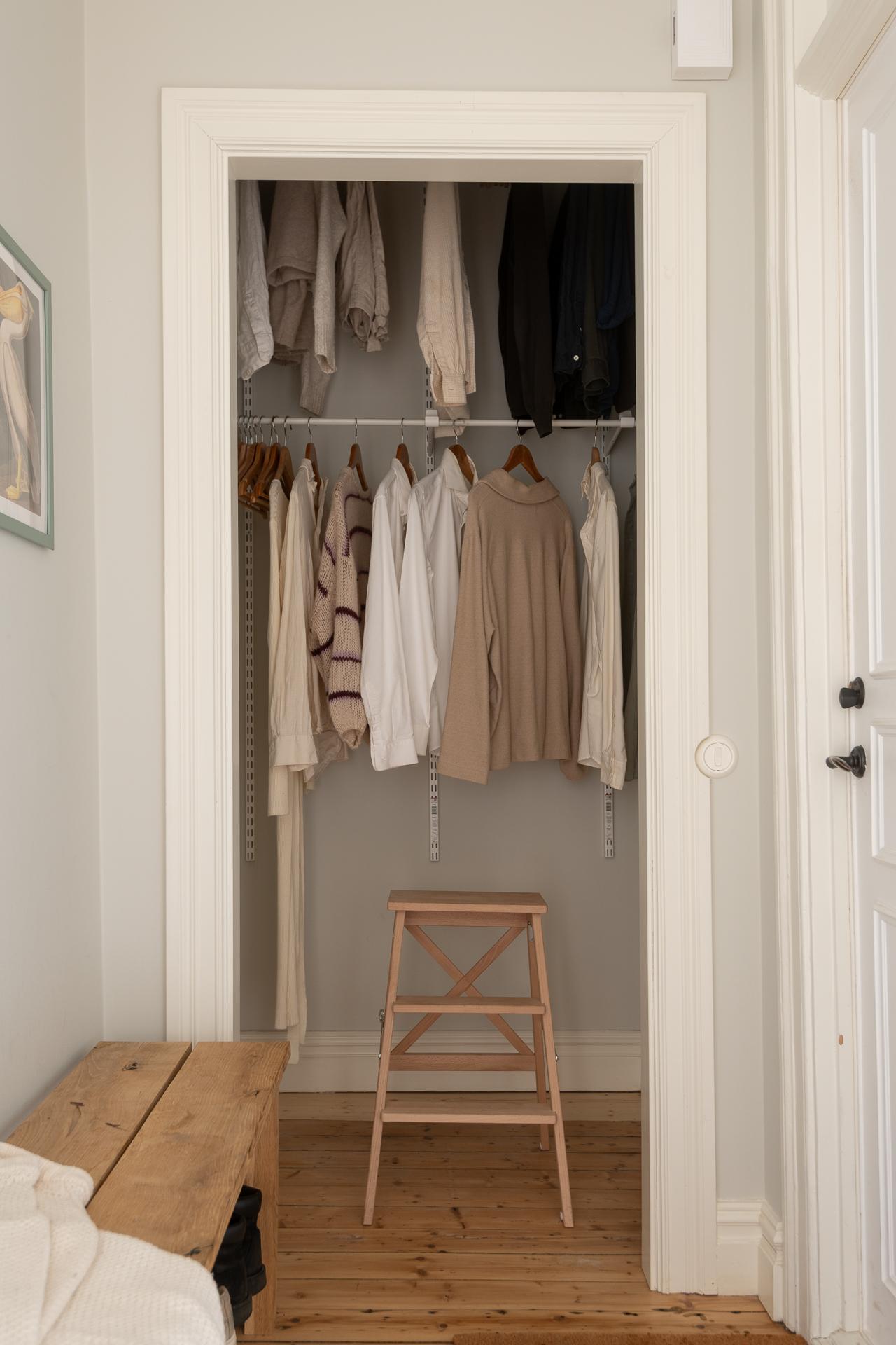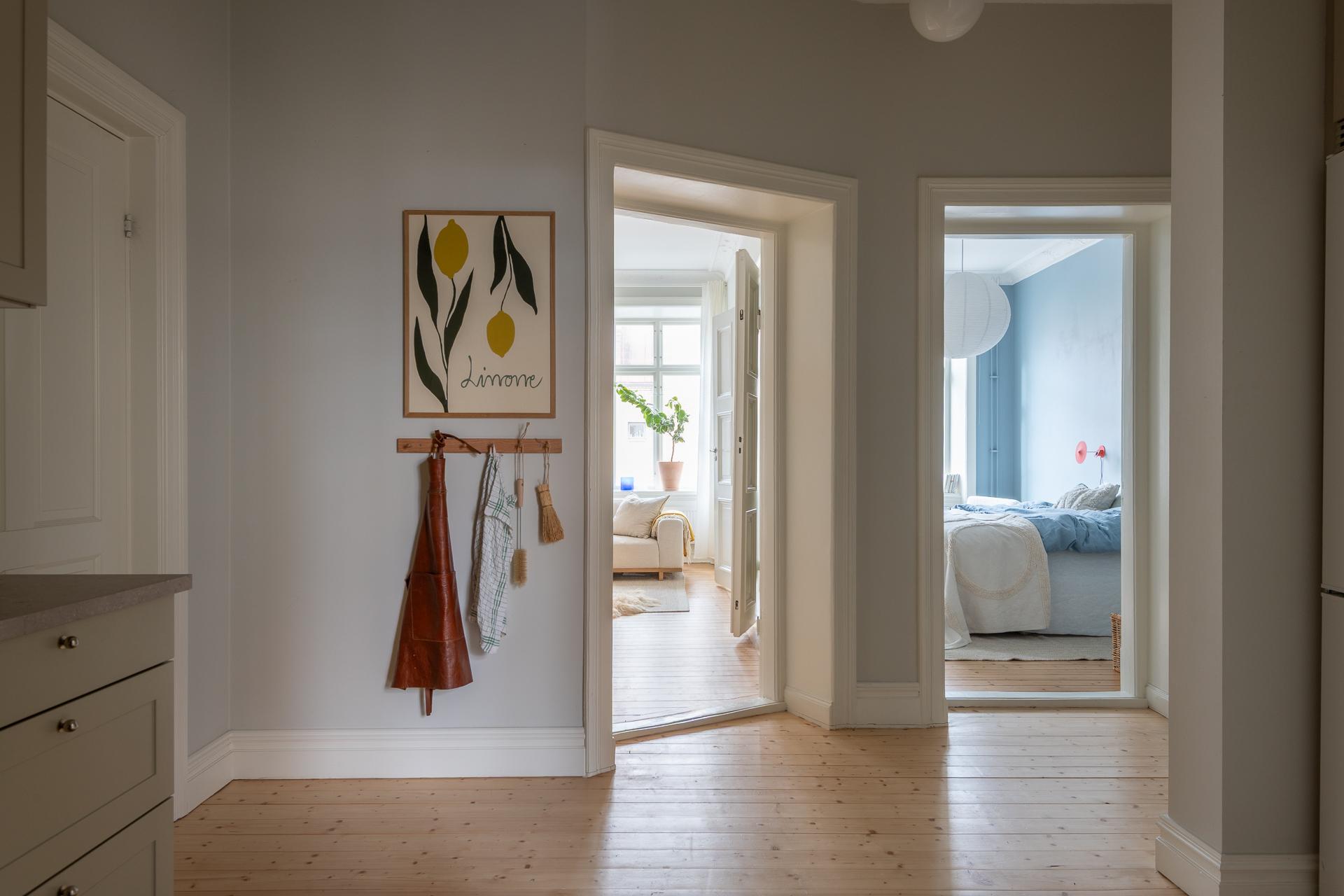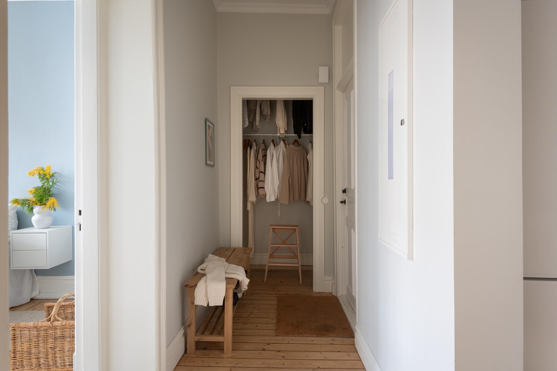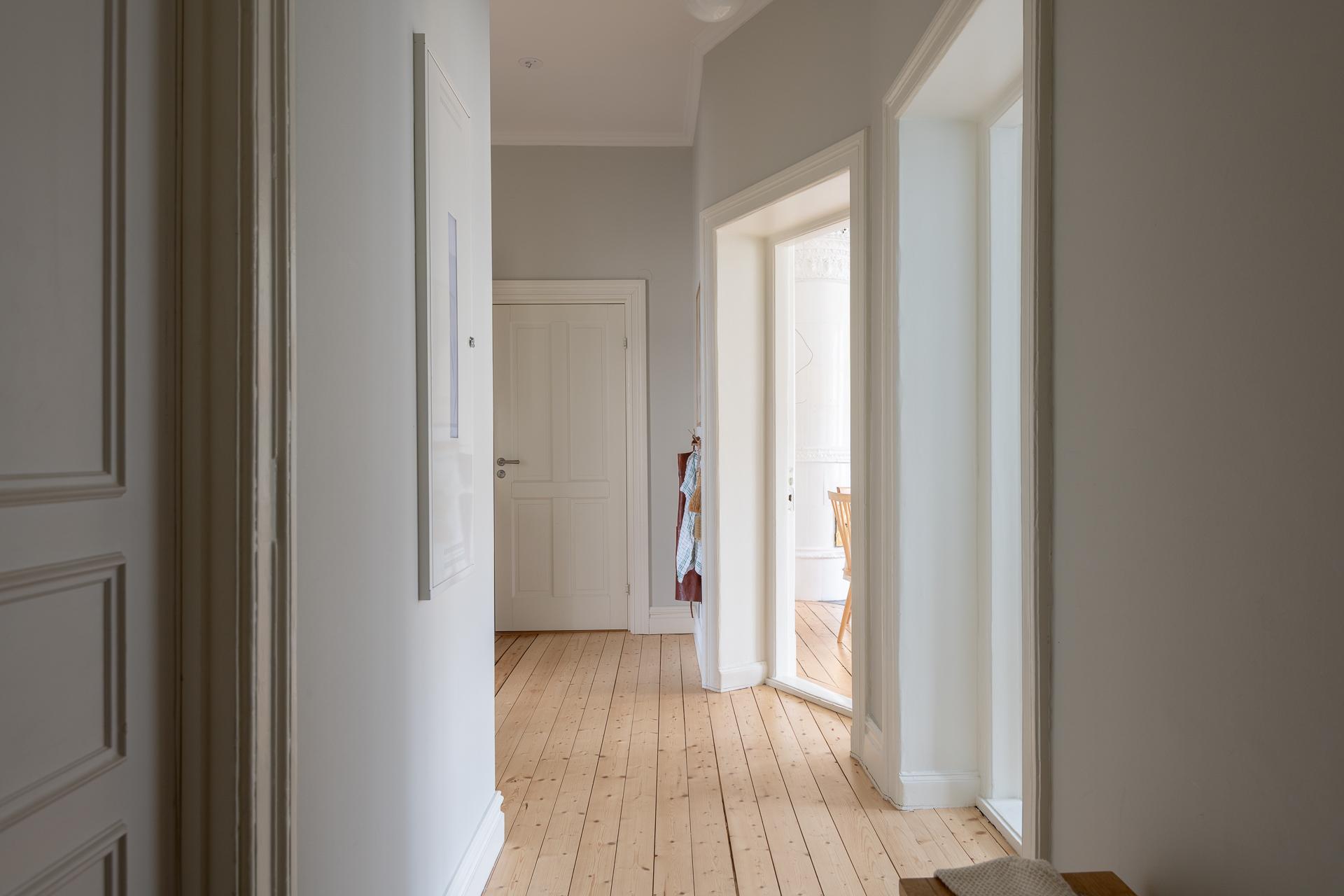 Praktisk och välkomnande med inbyggd garderob för avhängning. En fin första glimt av de genomgående originalbrädgolven som löper genom hela bostaden.
