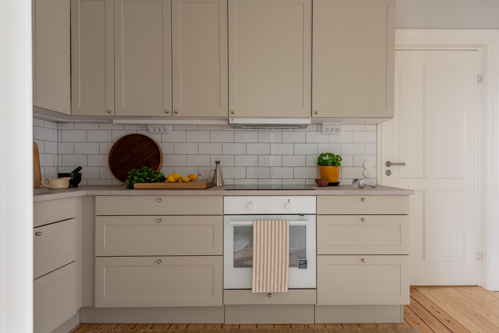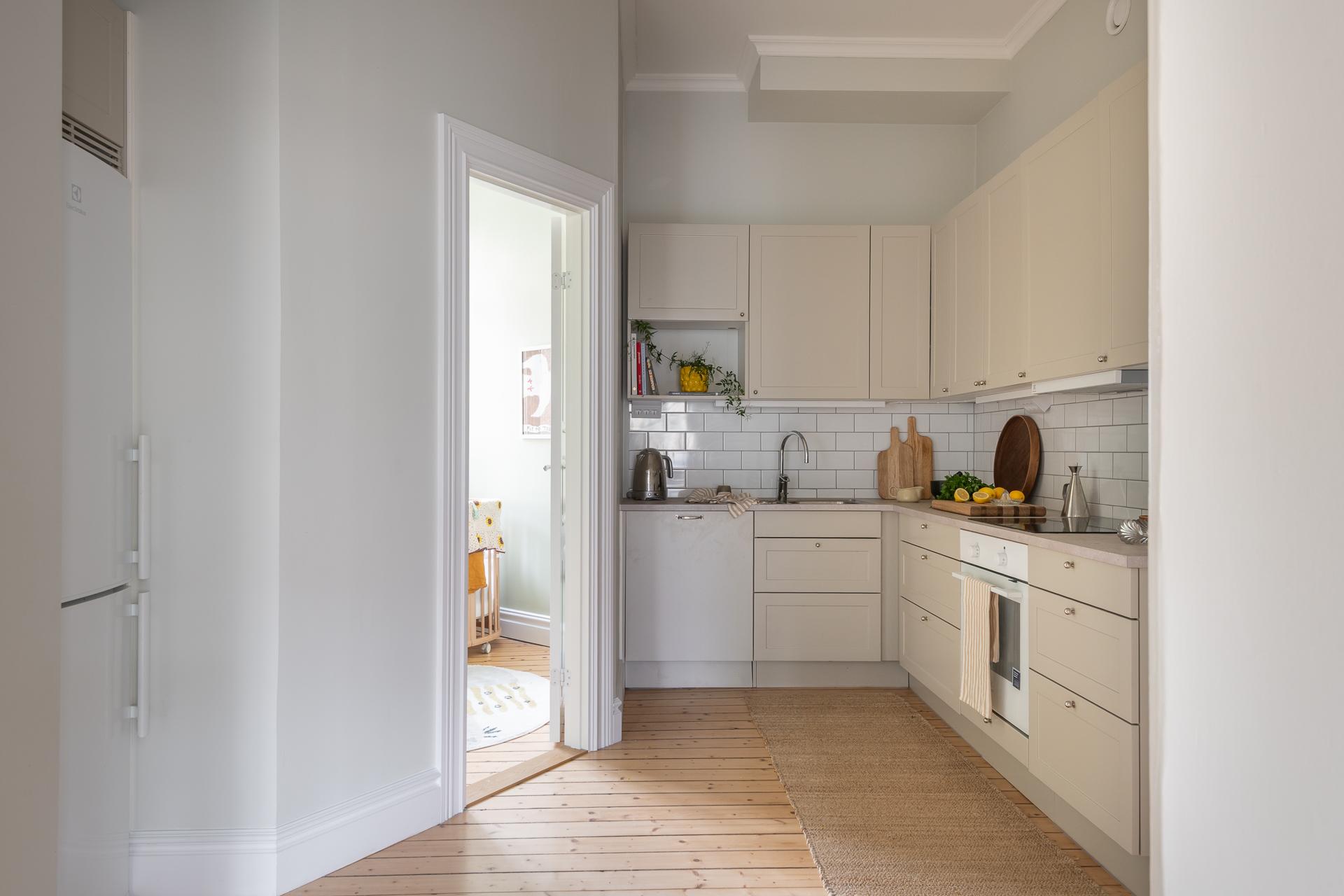 Ljust, kvadratsmart och funktionellt. Ljusa luckor, beige bänkskiva och vitt kakel ger en stilren och mjuk känsla. Här finns diskmaskin, spishäll, ugn och kombinerad kyl/frys – allt du behöver i en miljö som harmonierar med resten av bostaden.