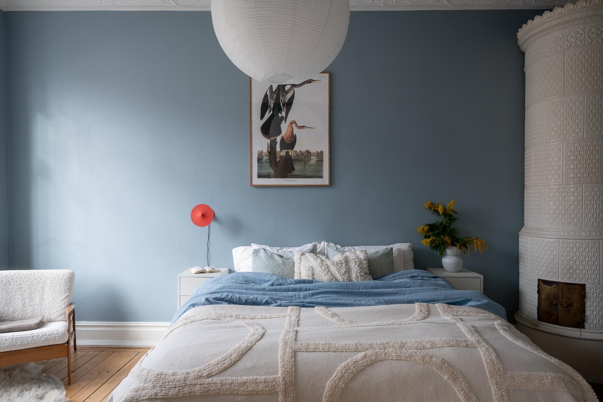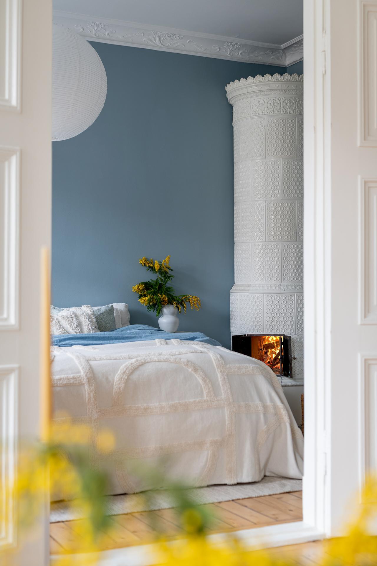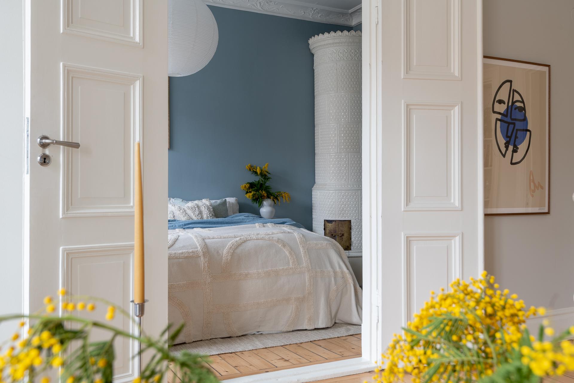 Stort, luftigt och badar i ljus från ett brett, generöst fönster. Här finns en fungerande kakelugn att tända upp i och platsbyggd förvaring som smälter in fint i stilen. Det finns plats för sängen med en fåtölj vid fönstret – perfekt för morgonkaffet – och kakelugnen på andra sidan som kvällssällskap. Ett stort, luftigt rum att verkligen trivas i.