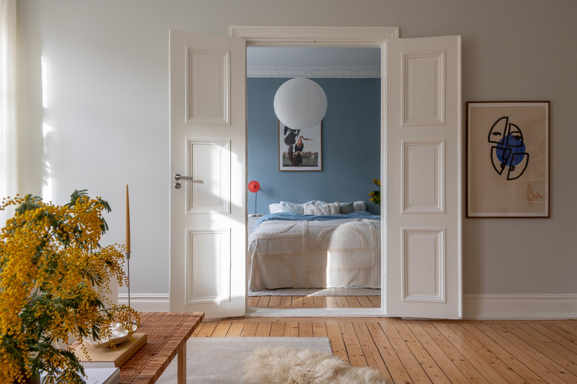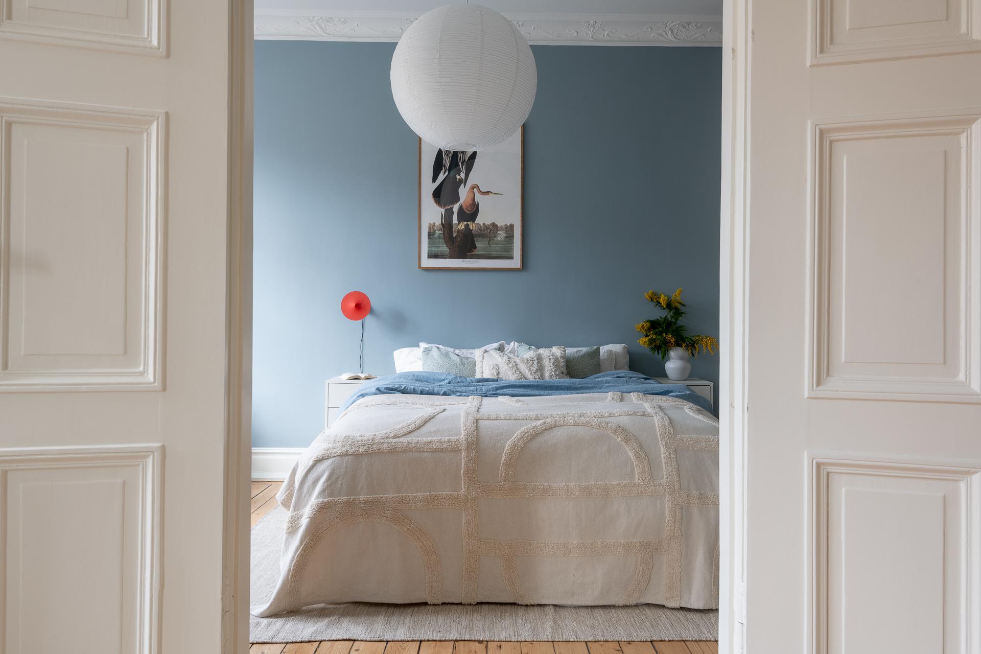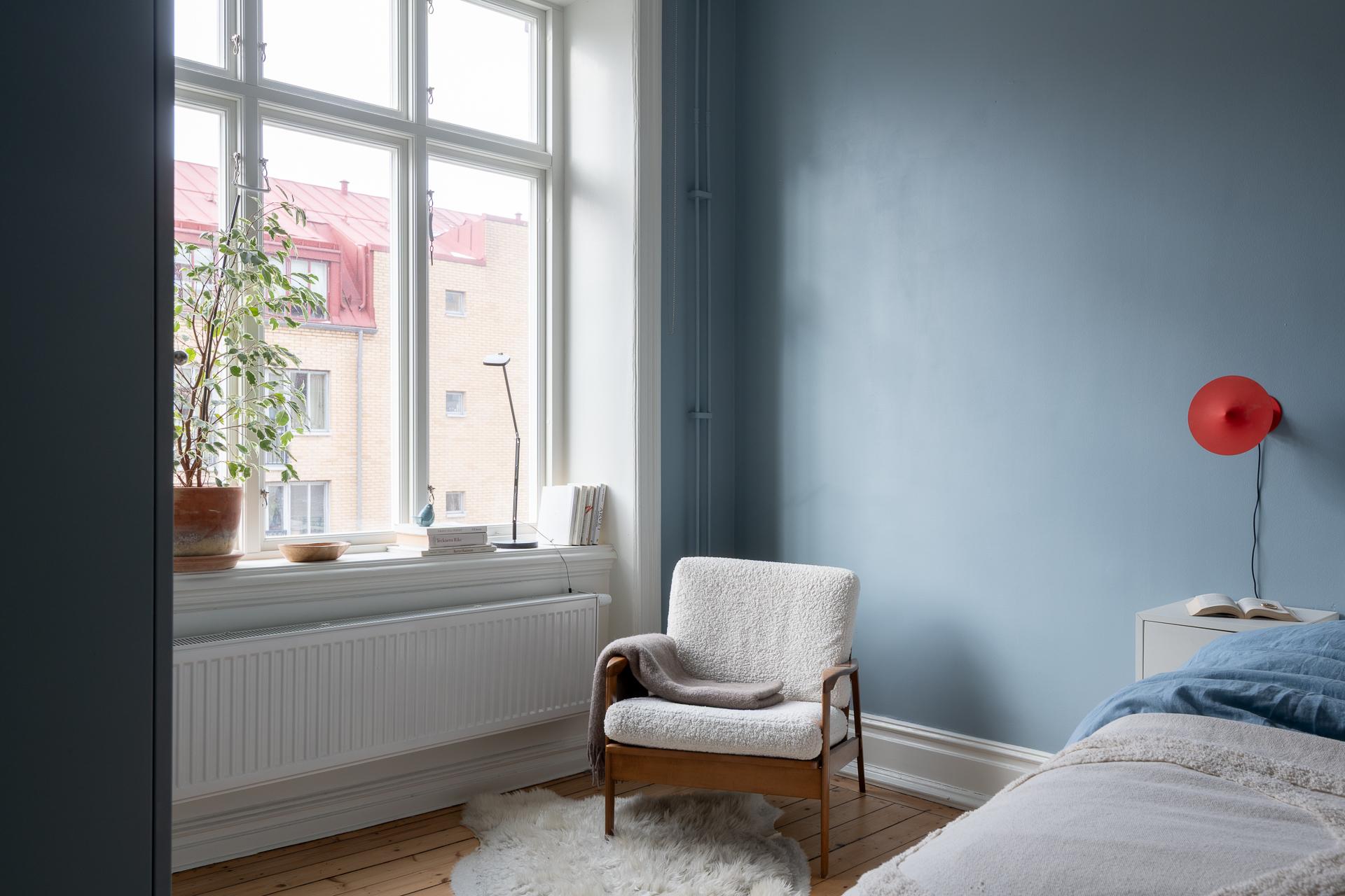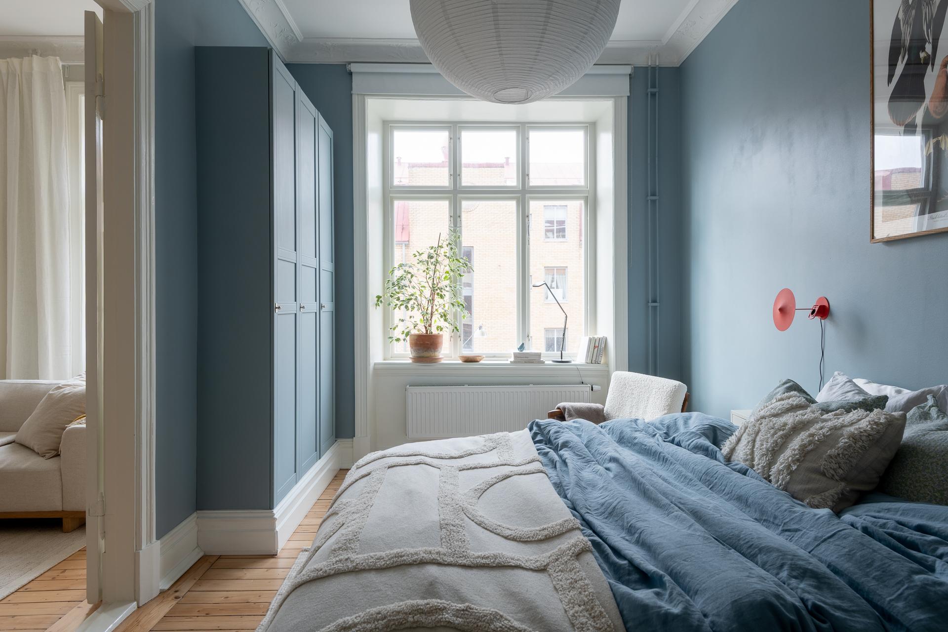 Stort, luftigt och badar i ljus från ett brett, generöst fönster. Här finns en fungerande kakelugn att tända upp i och platsbyggd förvaring som smälter in fint i stilen. Det finns plats för sängen med en fåtölj vid fönstret – perfekt för morgonkaffet – och kakelugnen på andra sidan som kvällssällskap. Ett stort, luftigt rum att verkligen trivas i.