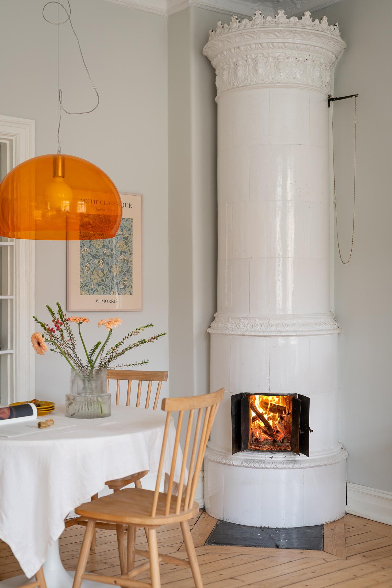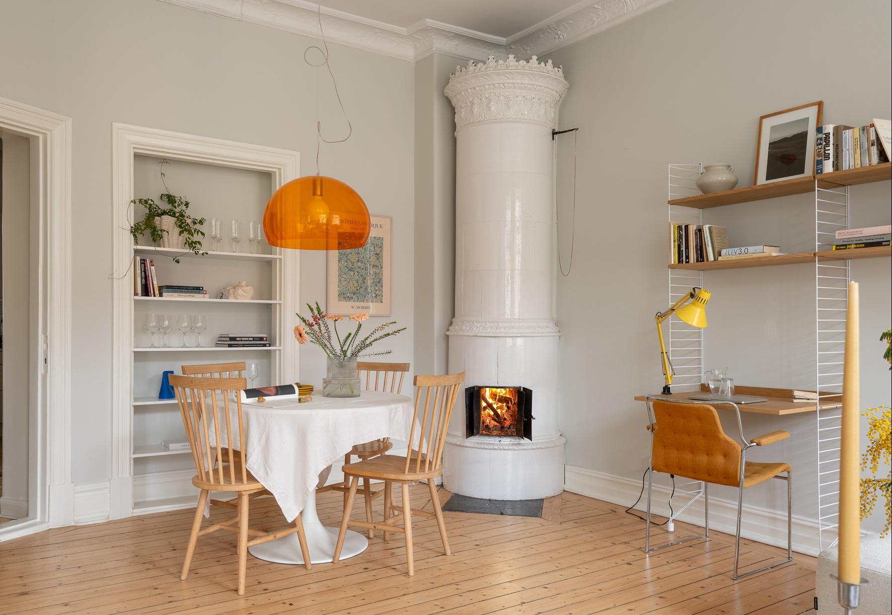 Här kliver du rakt in i ett hem där sekelskiftesdrömmen lever – men utan att du behöver frysa eller kompromissa med bekvämligheten. Hela bostaden totalrenoverades 2024 med stor respekt för husets själ. En takhöjd på 3,2 meter, originaldetaljerna har bevarats, brädgolven ligger kvar och knarrar sådär charmigt som de ska, och känslan av sekelskifte sitter i väggarna. Två fullt fungerande kakelugnar? Jajamän. Här kan du elda både i sovrummet och i vardagsrummet och bjuda på den där svårslagna mysfaktorn som bara ett riktigt sekelskifteshem kan ge. Vi tar de 2,5 trapporna upp genom ett välhållet, tidstypiskt trapphus med vacker natursten och fina originaldetaljer – redan här börjar känslan.