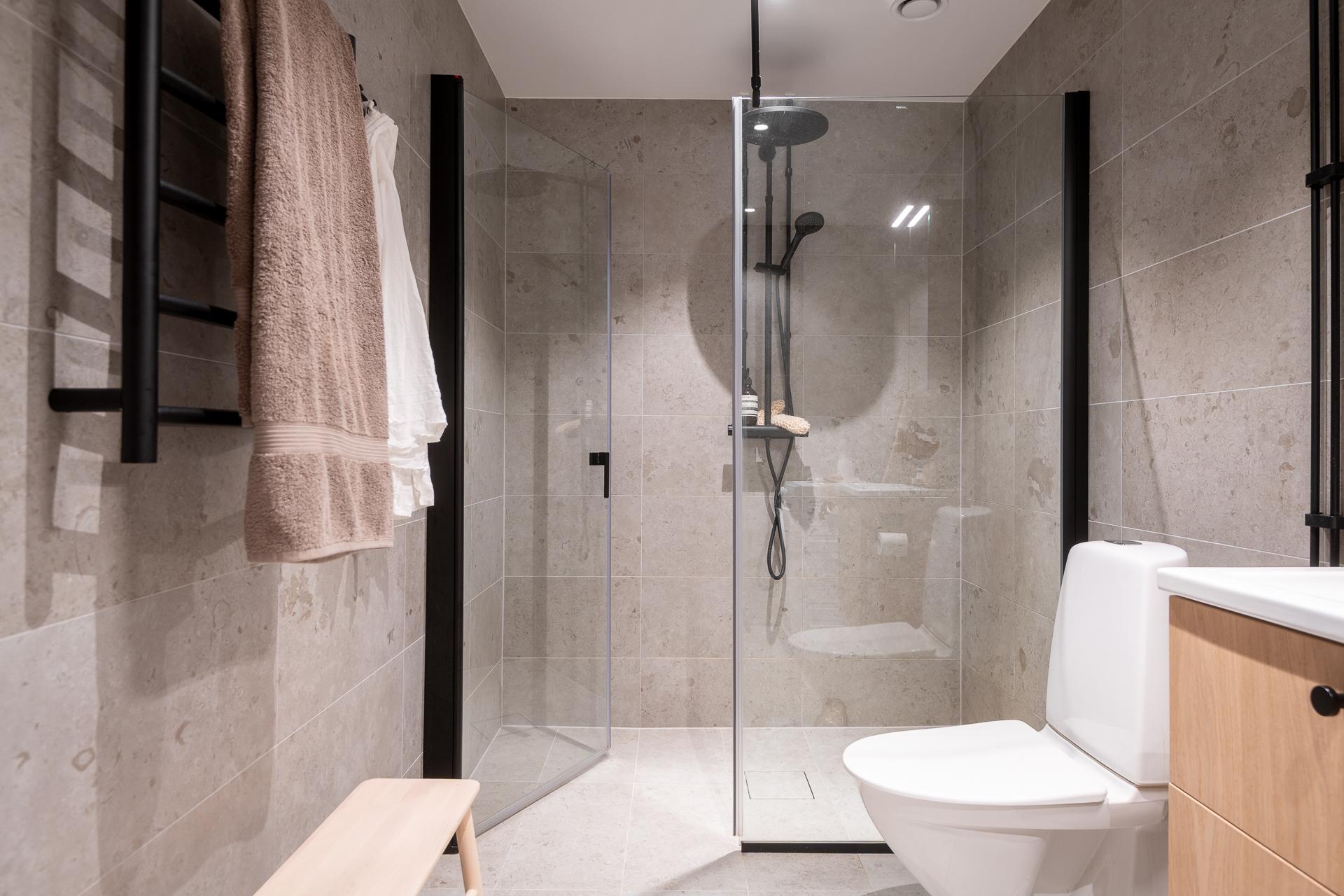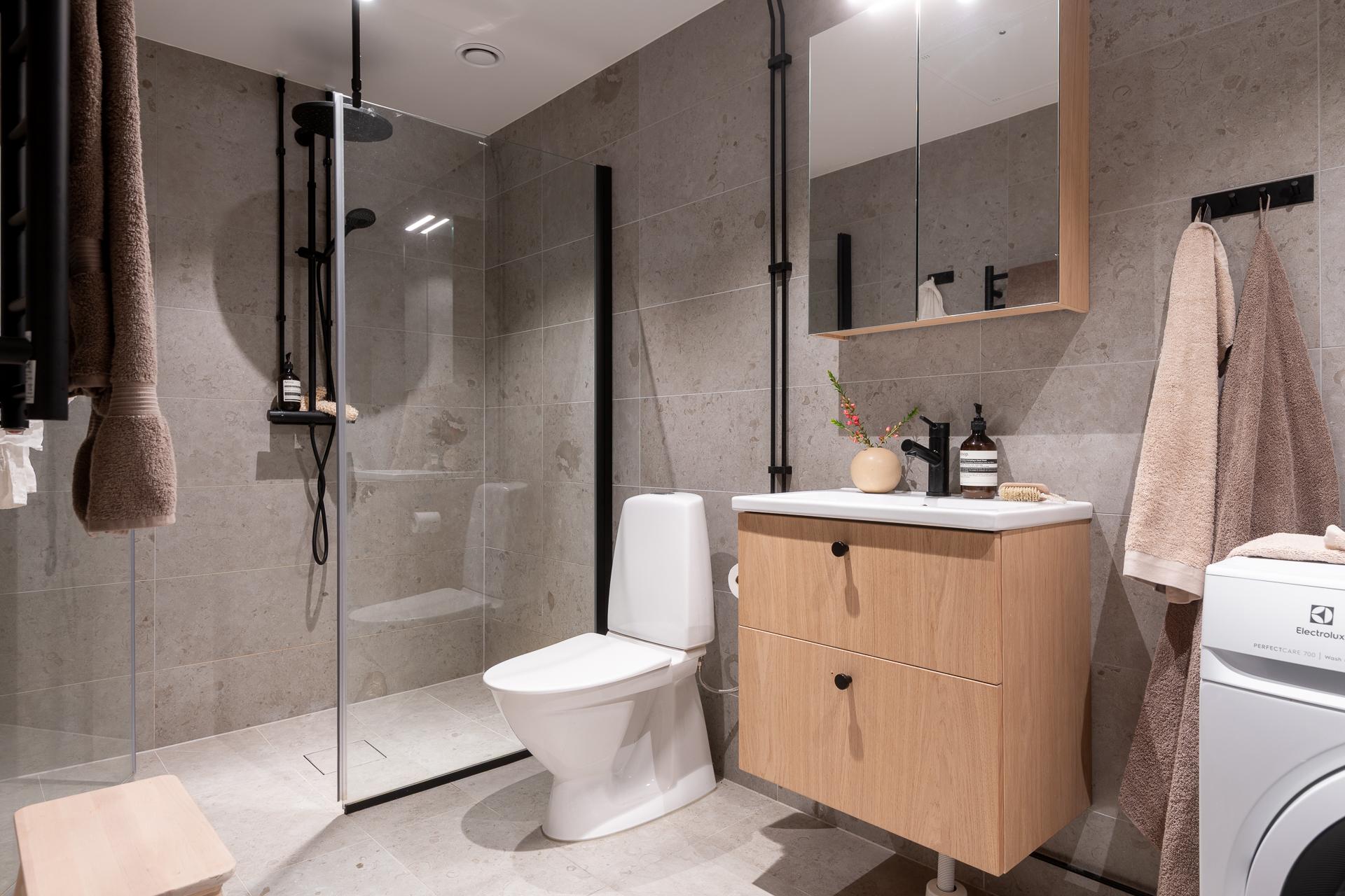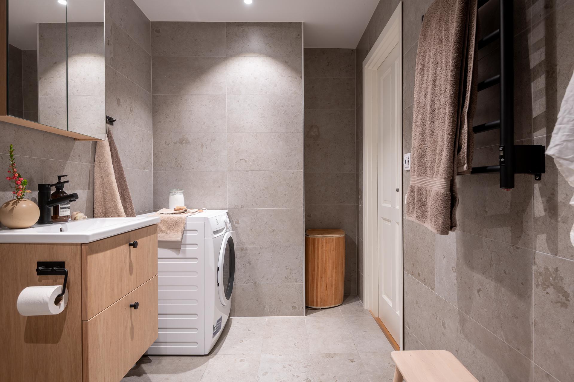 Helkaklat och modernt med stenliknande keramiska plattor och svarta detaljer på duschväggar, blandare och kranar. Här finns kommod, kombinerad tvättmaskin och torktumlare, dusch, golvvärme och handdukstork – en stilren och bekväm kontrast till sekelskifteskänslan i övriga hemmet.