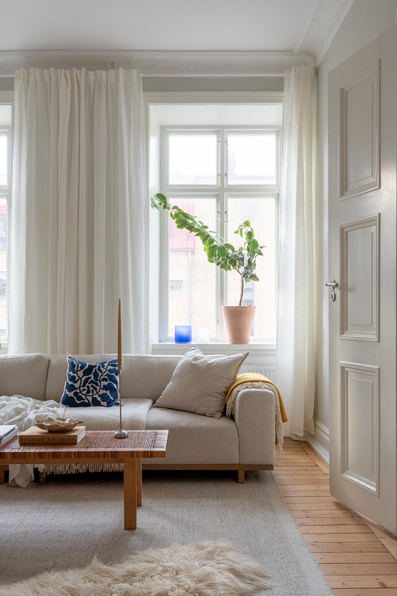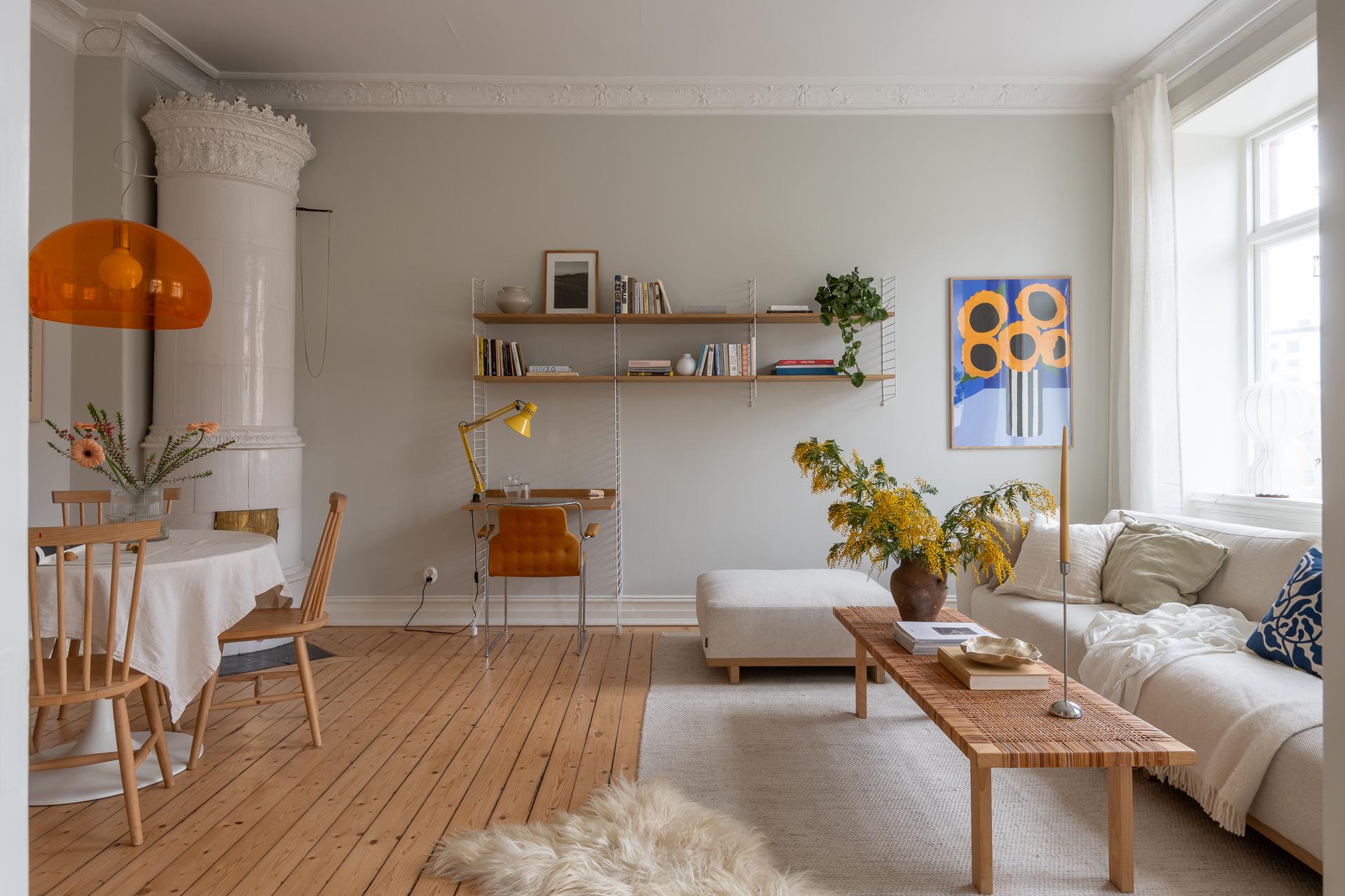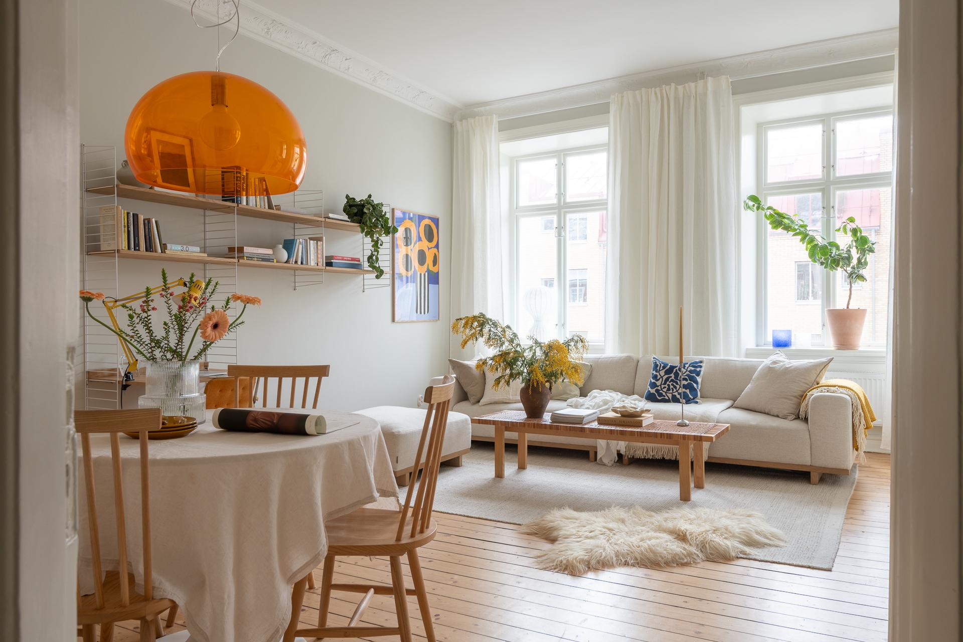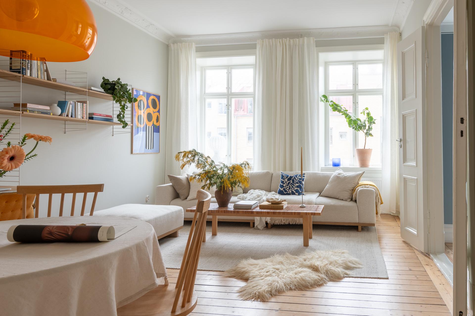 Genom vackra pardörrar kliver du in i vardagsrummet. Här möts du av ännu en kakelugn (ja, två stycken totalt!) och ett fantastiskt ljusinsläpp från stora, nyinsatta fyrluftsfönster i tidstypisk stil. Det finns gott om plats för en rejäl soffa, skrivbord och ett ordentligt matbord för långa middagar med vänner.
