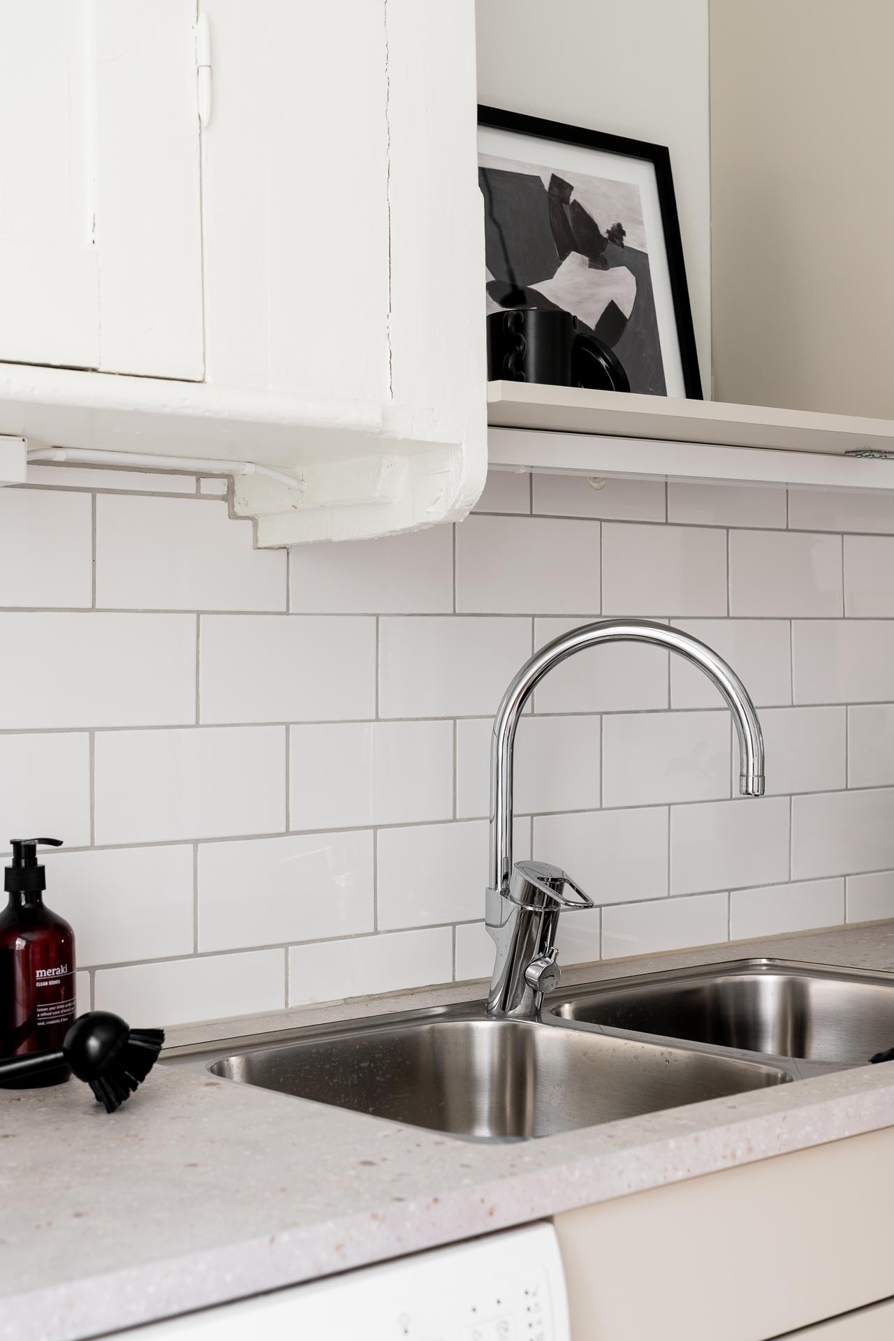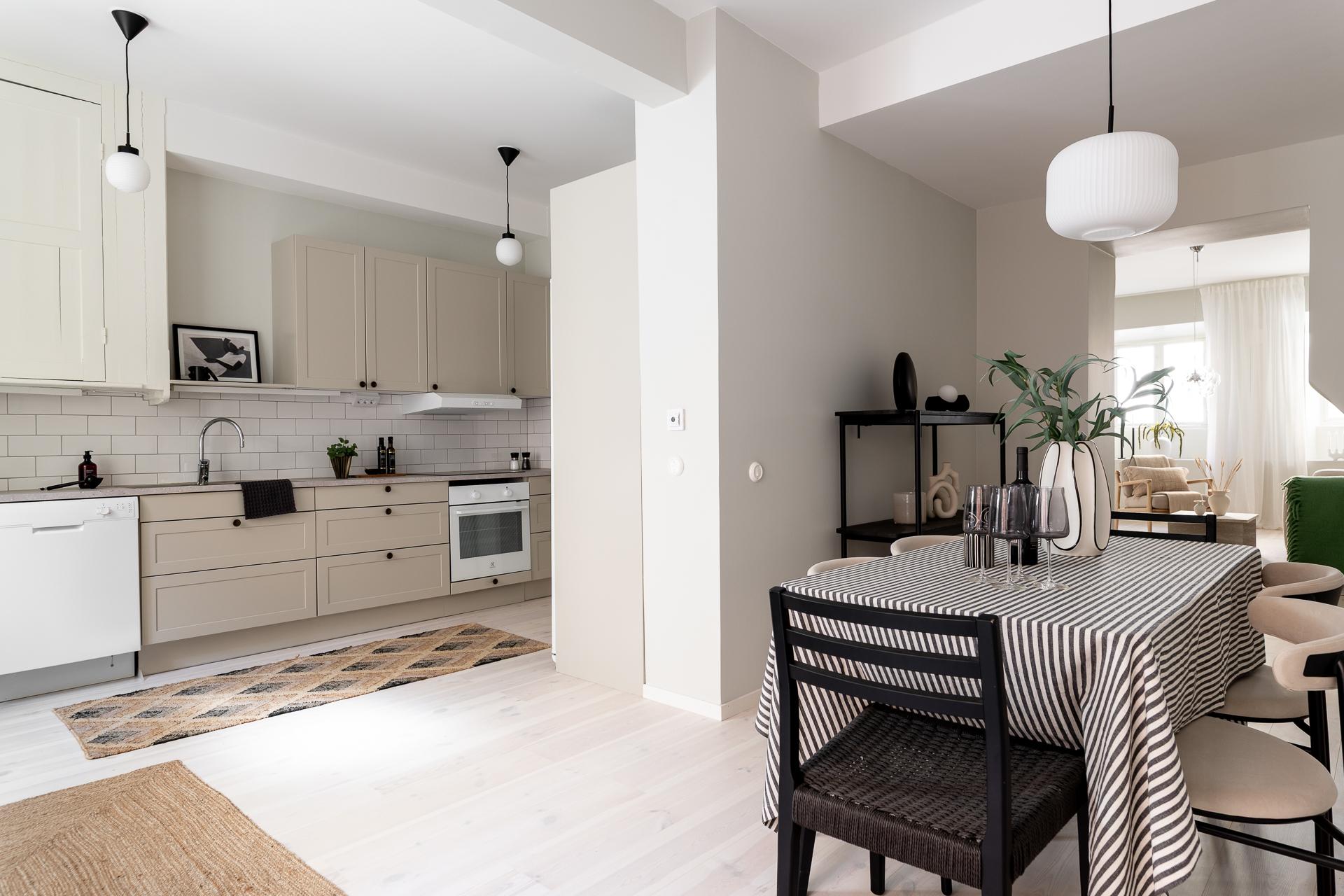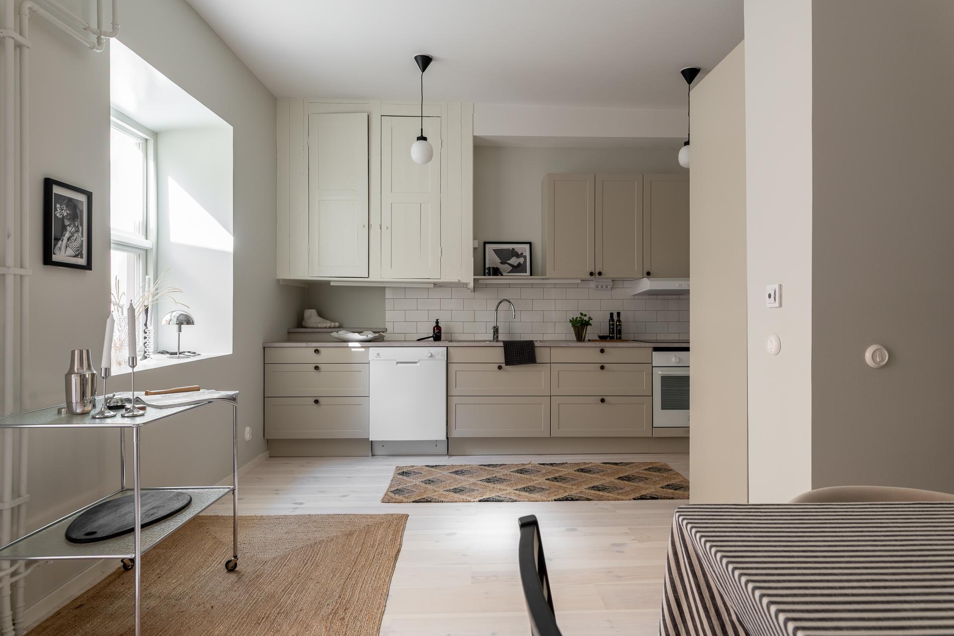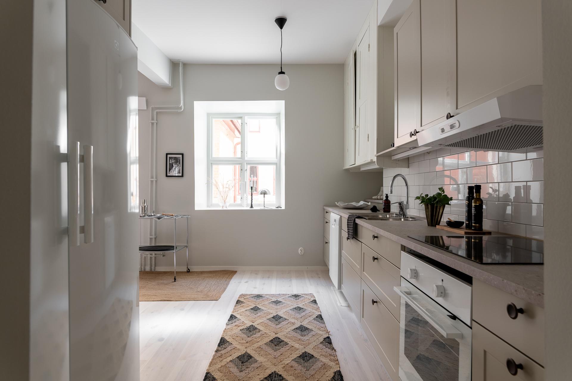 Köket är hemmets hjärta – en plats där funktion möter trivsel. Inredningen kommer från Marbodal och erbjuder generösa arbetsytor och gott om förvaring. Vid fönstret finns plats för ett matbord där dagsljuset får spela över ytorna, och de fullhöga kyl- och frysskåpen bidrar till både praktisk användning och en stilren helhet.