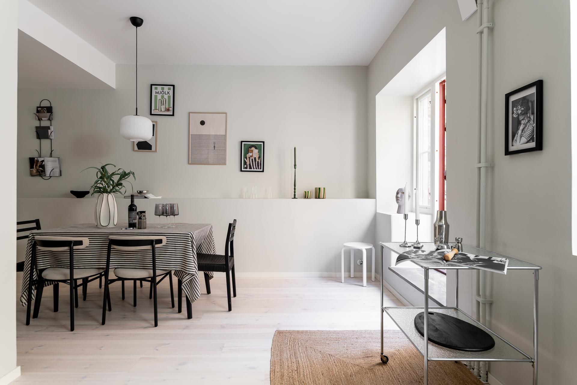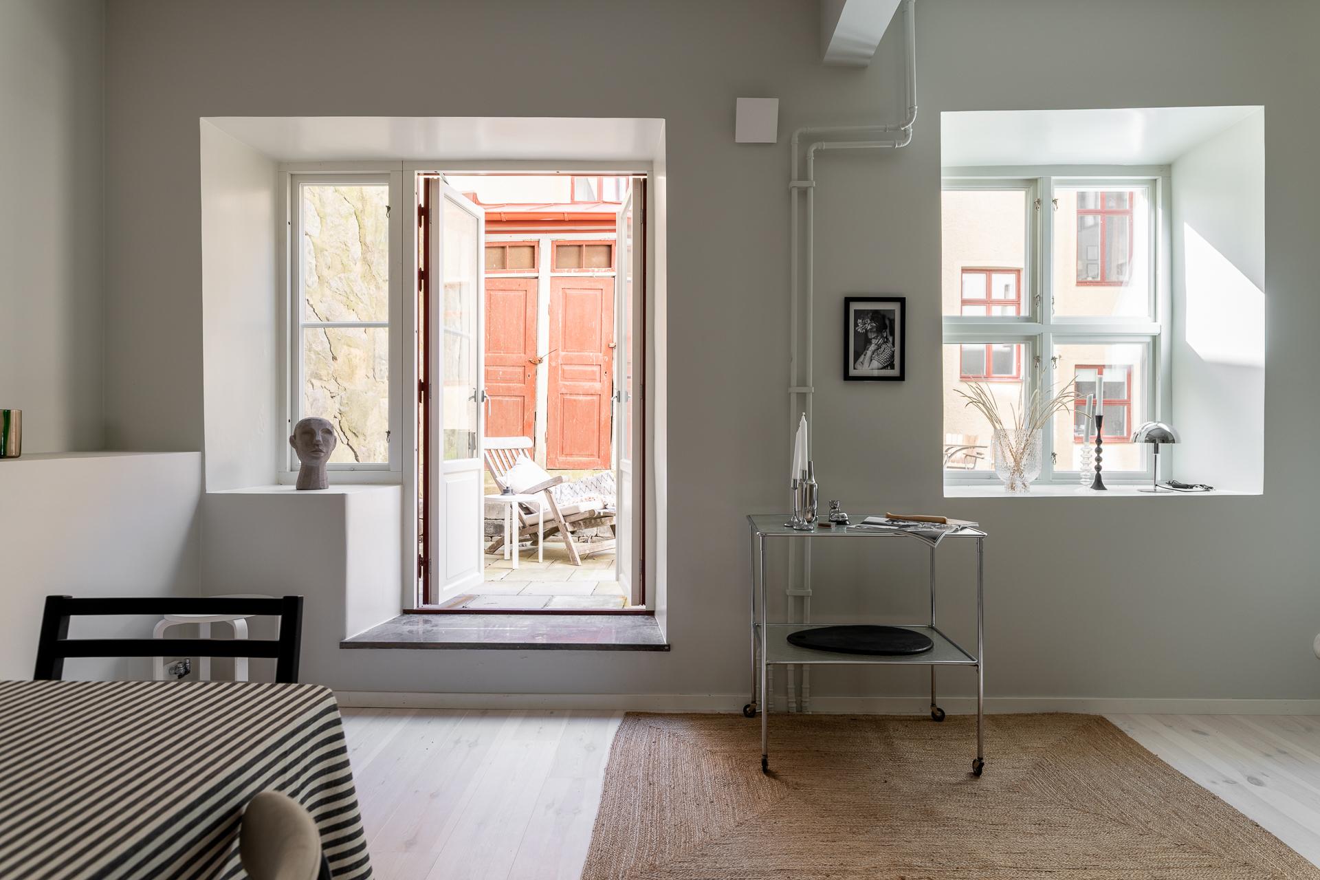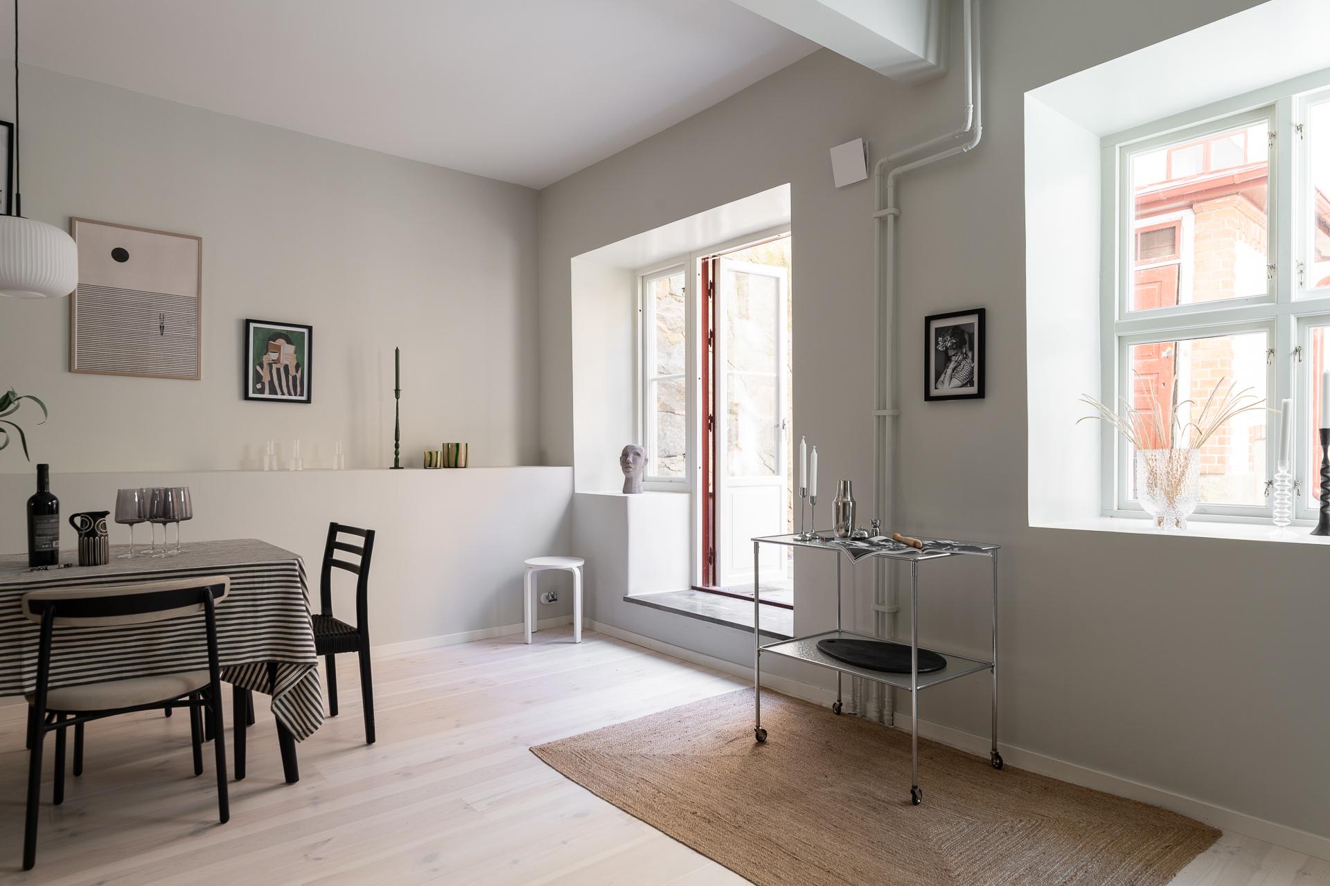 I dag används detta rum som matsal, en naturlig samlingspunkt för middagar och umgänge. För den som har andra behov finns möjlighet att enkelt skapa ytterligare ett sovrum genom att sätta upp en vägg. Rummet har dessutom en egen utgång till gården, vilket ger en fin kontakt med utemiljön och förstärker känslan av rymd och flexibilitet.