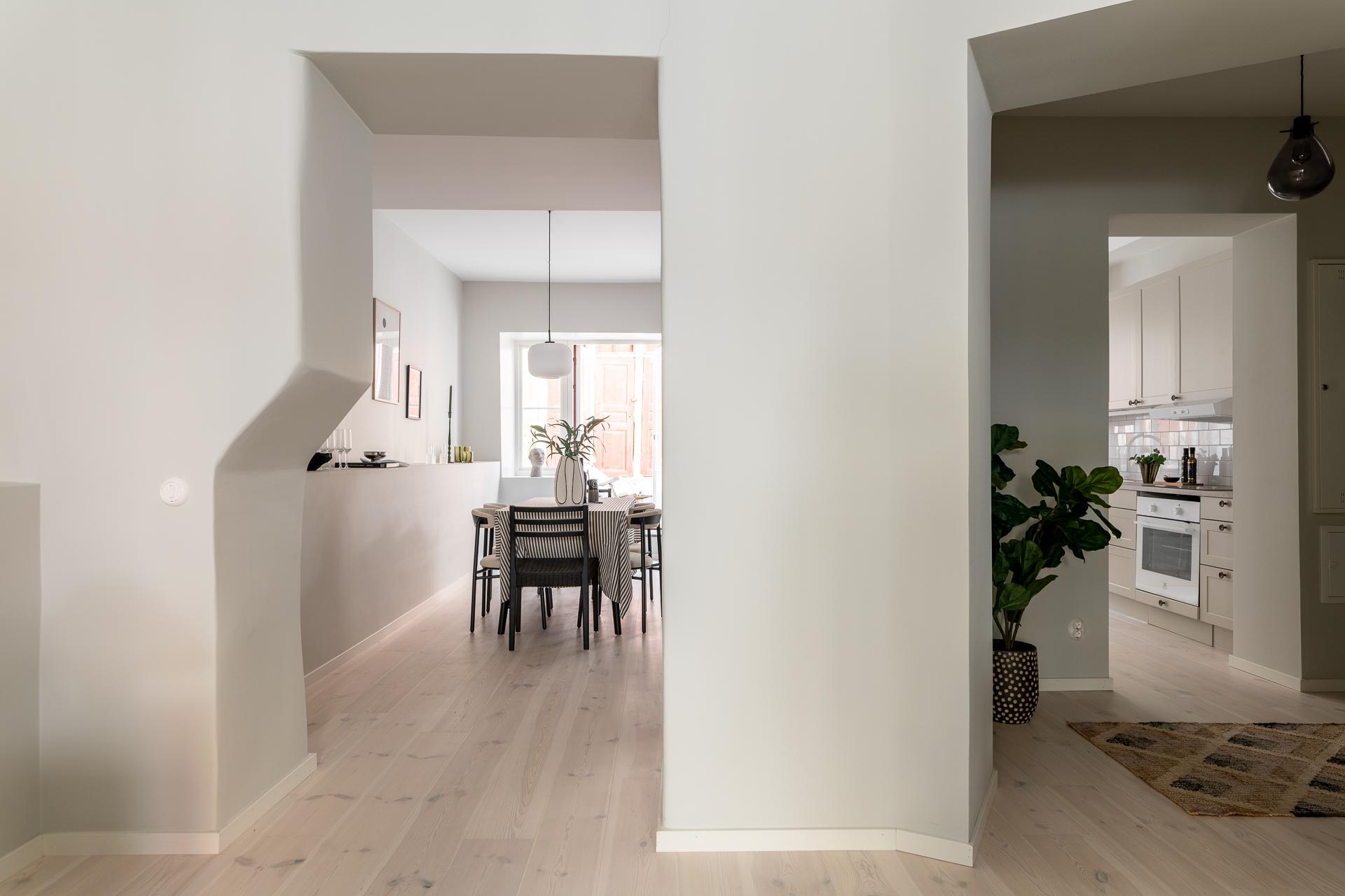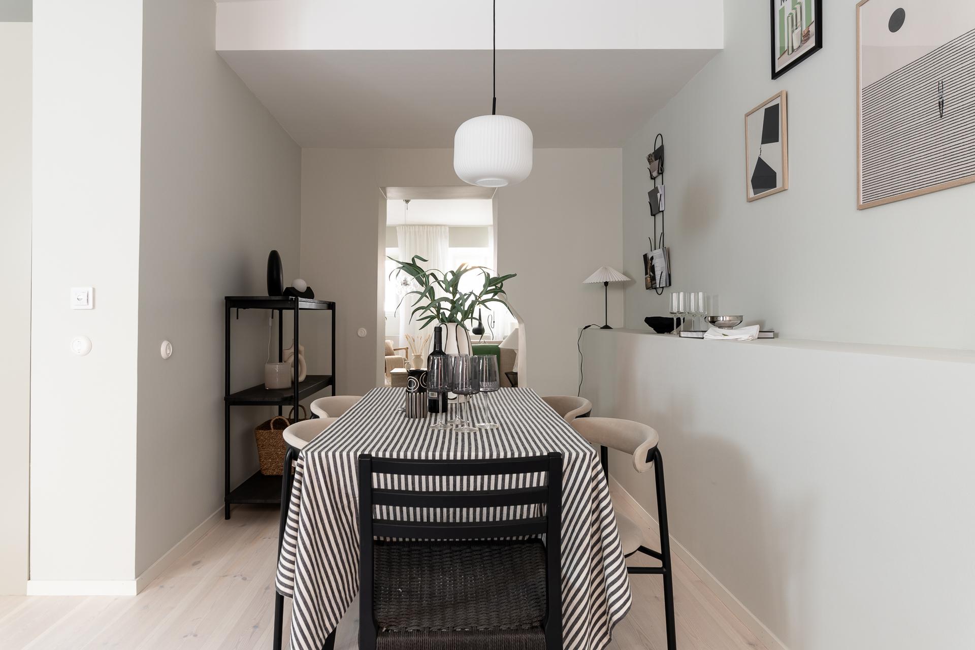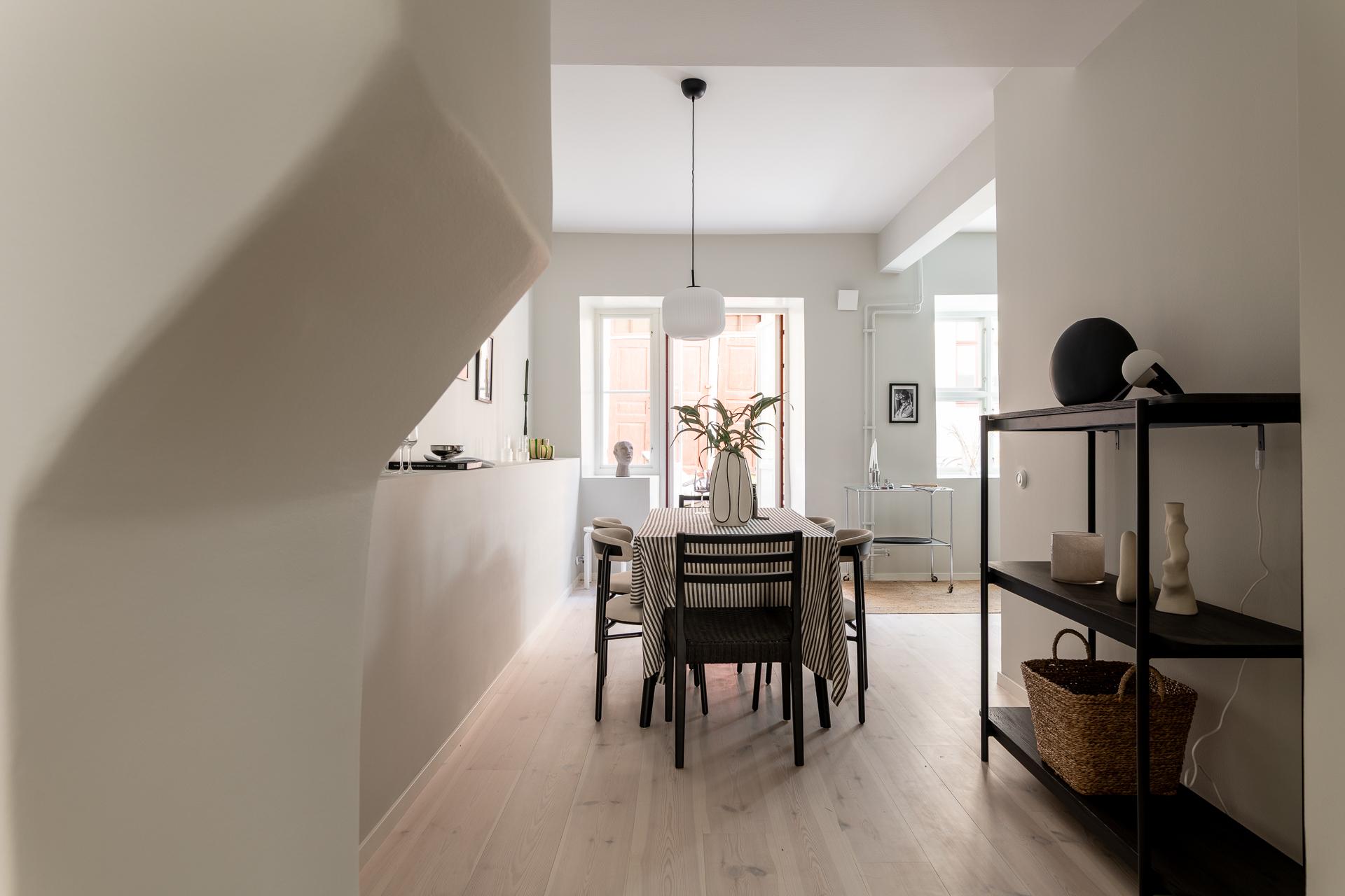I dag används detta rum som matsal, en naturlig samlingspunkt för middagar och umgänge. För den som har andra behov finns möjlighet att enkelt skapa ytterligare ett sovrum genom att sätta upp en vägg. Rummet har dessutom en egen utgång till gården, vilket ger en fin kontakt med utemiljön och förstärker känslan av rymd och flexibilitet.