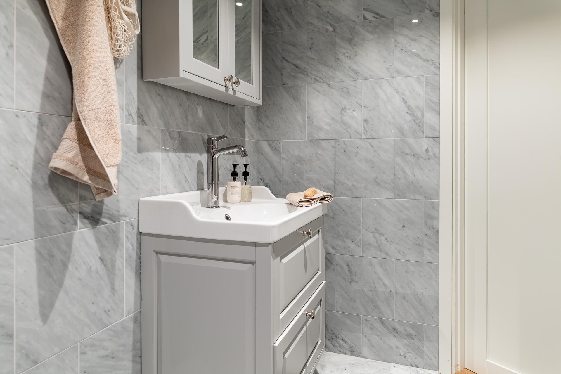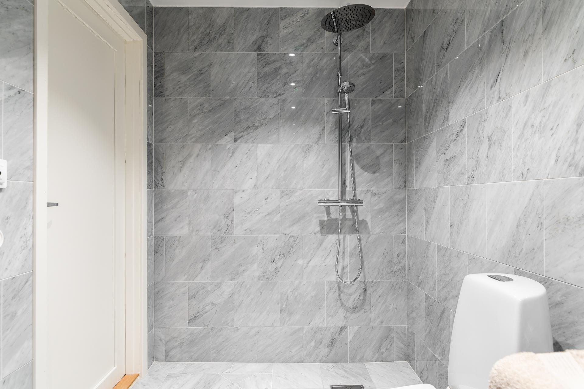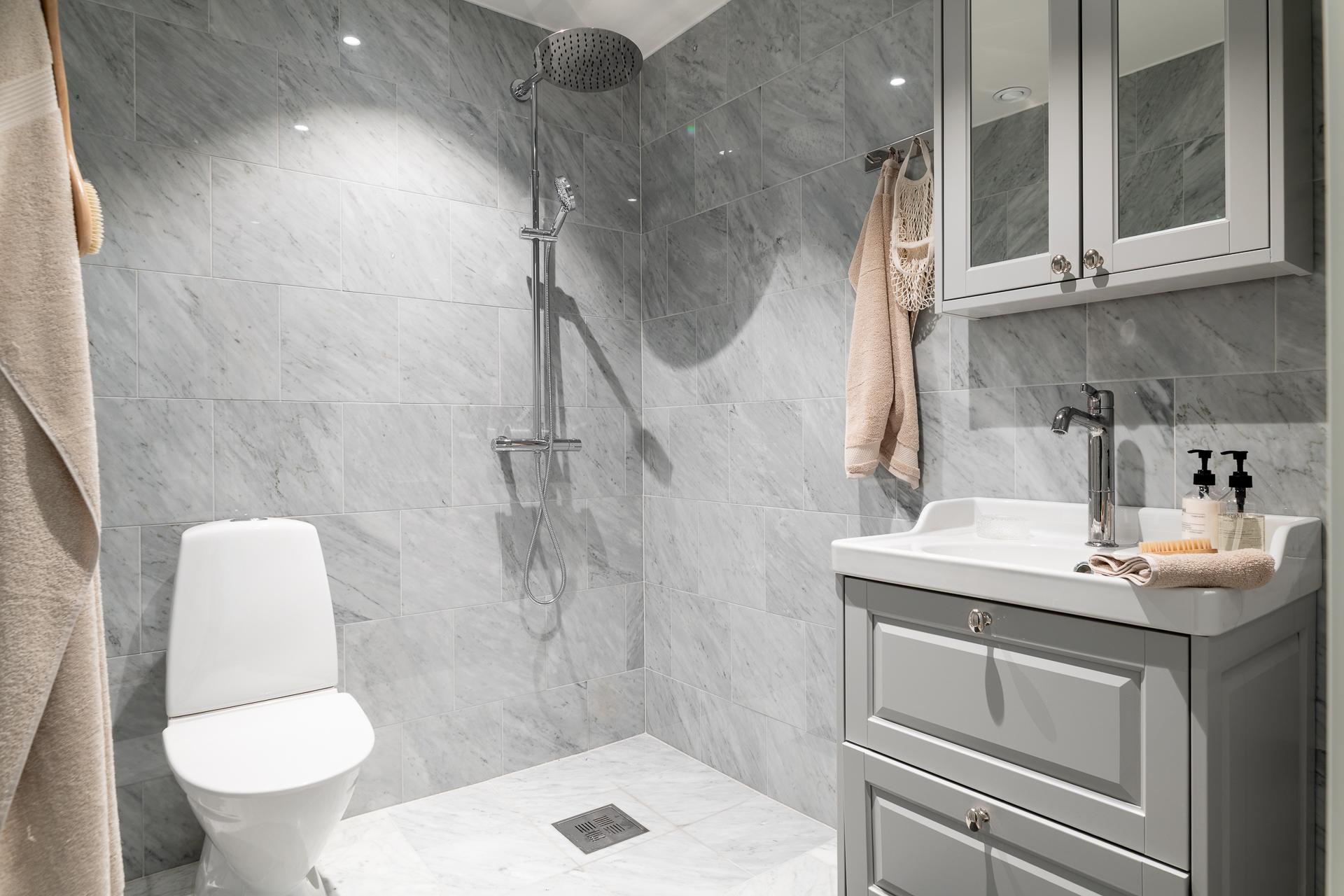 Det första badrummet är stilrent och omsorgsfullt utformat, med en känsla som för tankarna till ett elegant hotell. Här finns dusch, wc och kommod, och golvvärmen bidrar till en behaglig komfort som gör vardagen lite lyxigare.