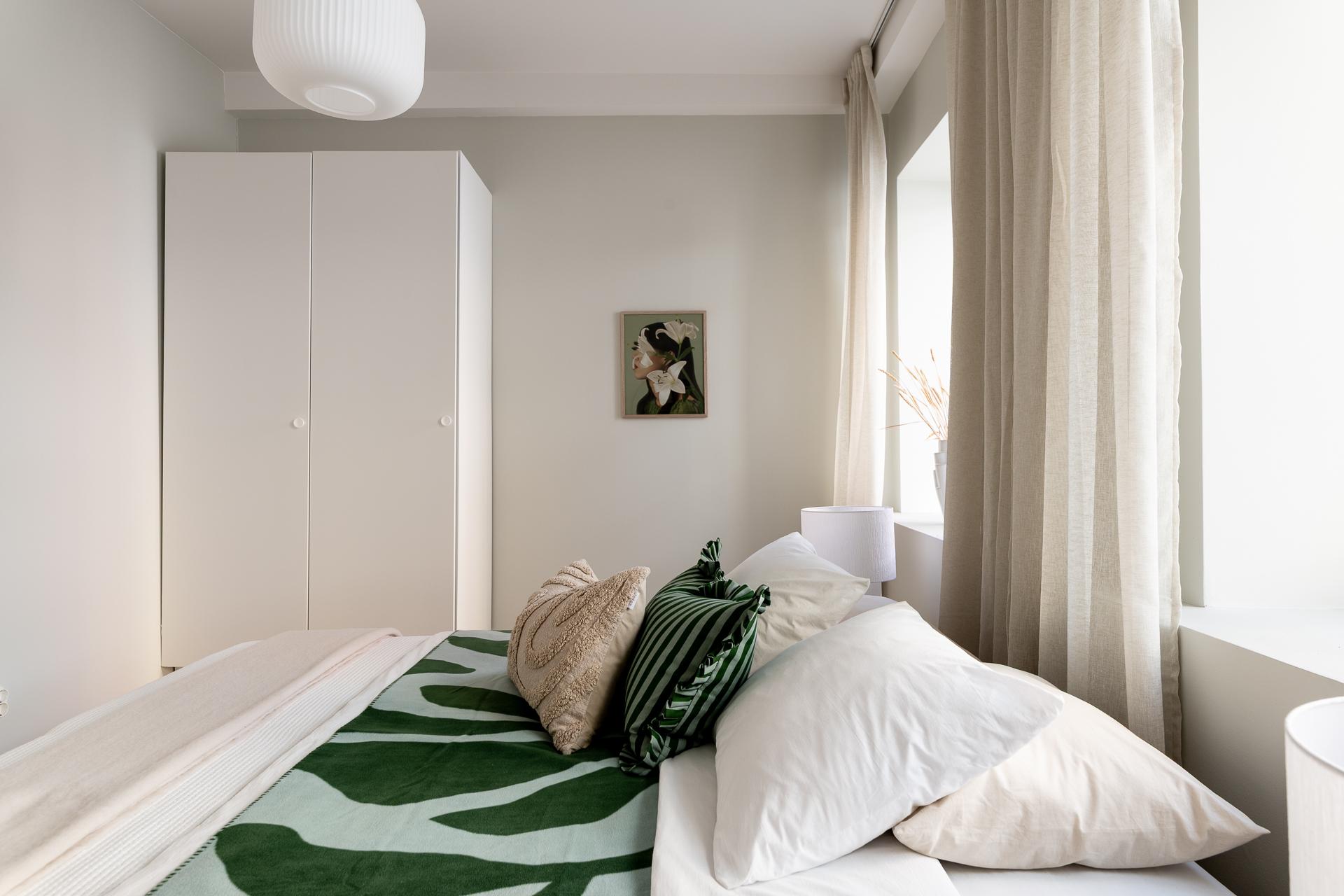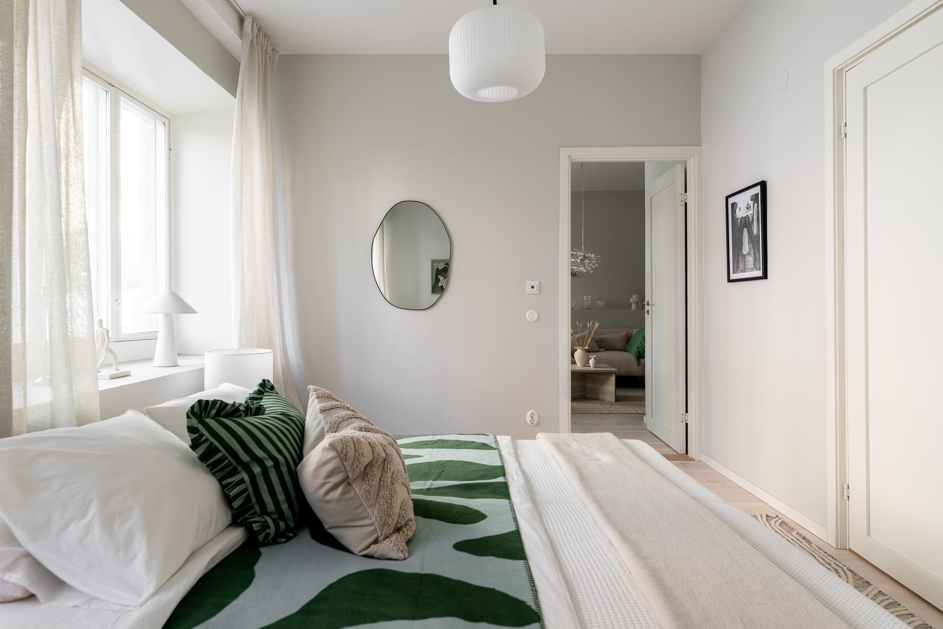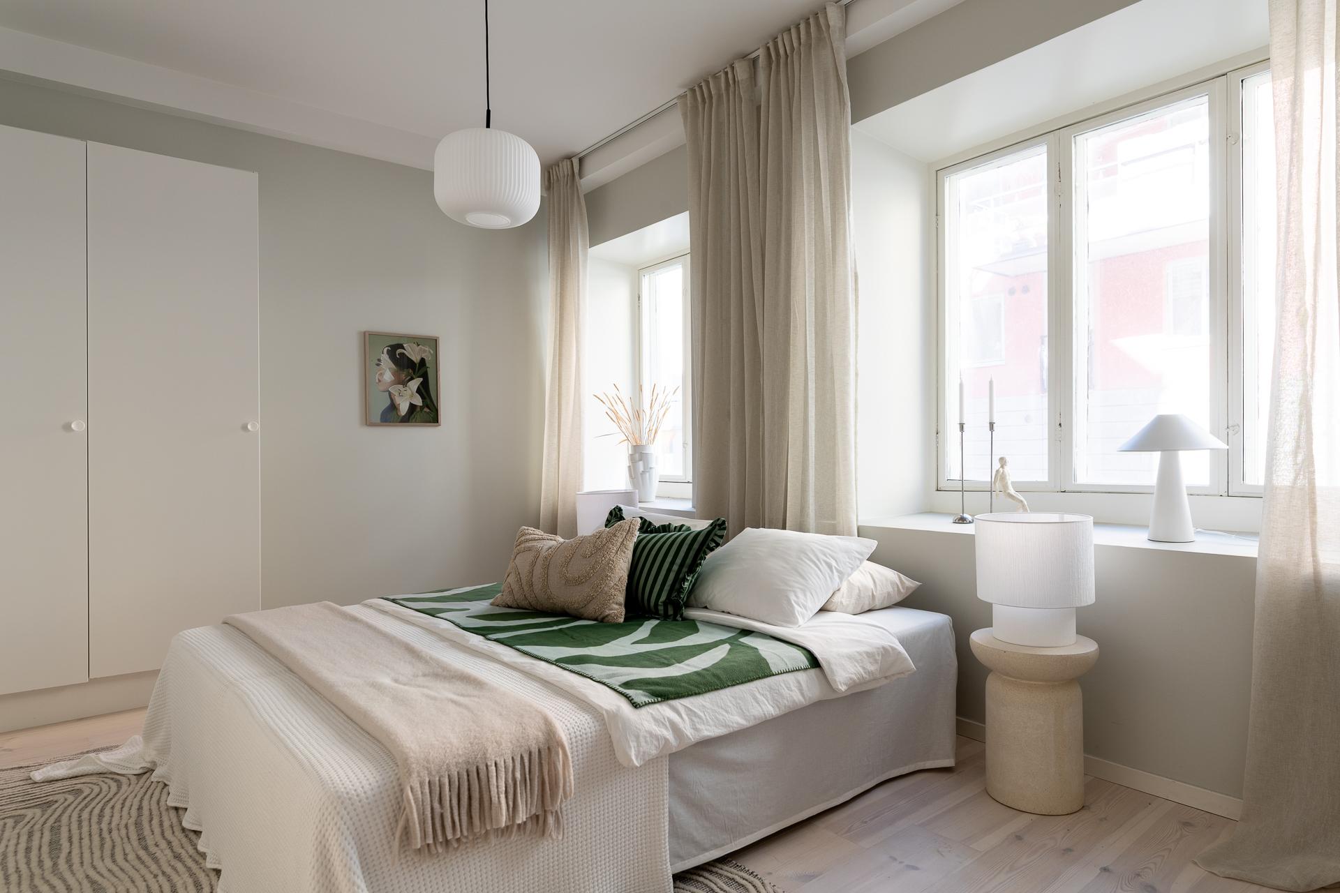 Det större sovrummet är både luftigt och rogivande, med gott om plats för en större säng och tillhörande möbler. De två fönstren ger rummet ett fint ljusinsläpp, och det egna badrummet bidrar till en känsla av avskildhet och bekvämlighet.