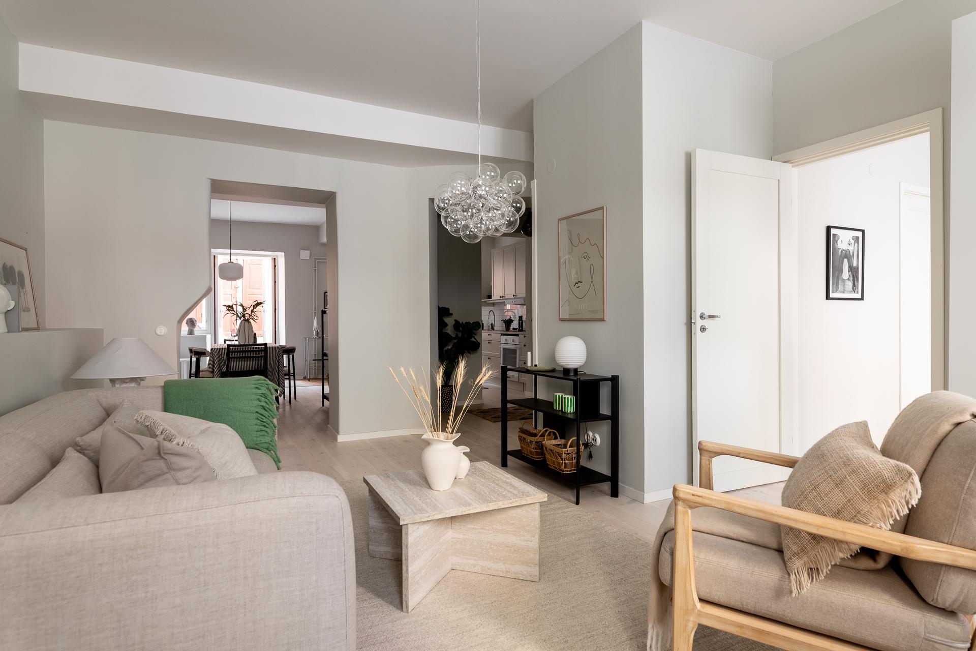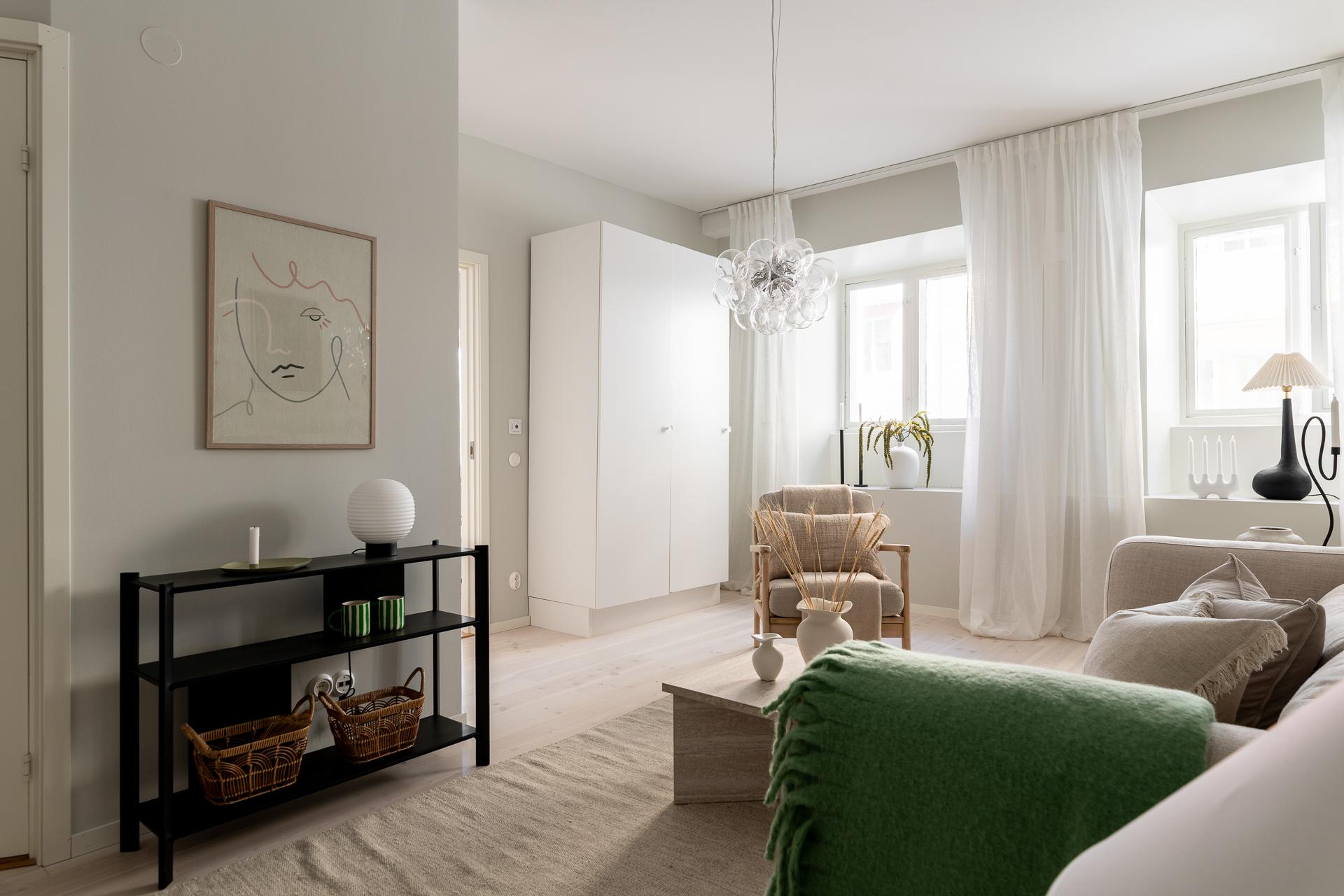 Vardagsrummet är generöst tilltaget och bjuder in till både avkoppling och sociala tillställningar. Här finns gott om plats för en stor soffgrupp och, för den som önskar, även ett matbord. De två fönstren släpper in rikligt med ljus och skapar en ljus och behaglig atmosfär som gör rummet till en självklar samlingspunkt i hemmet.