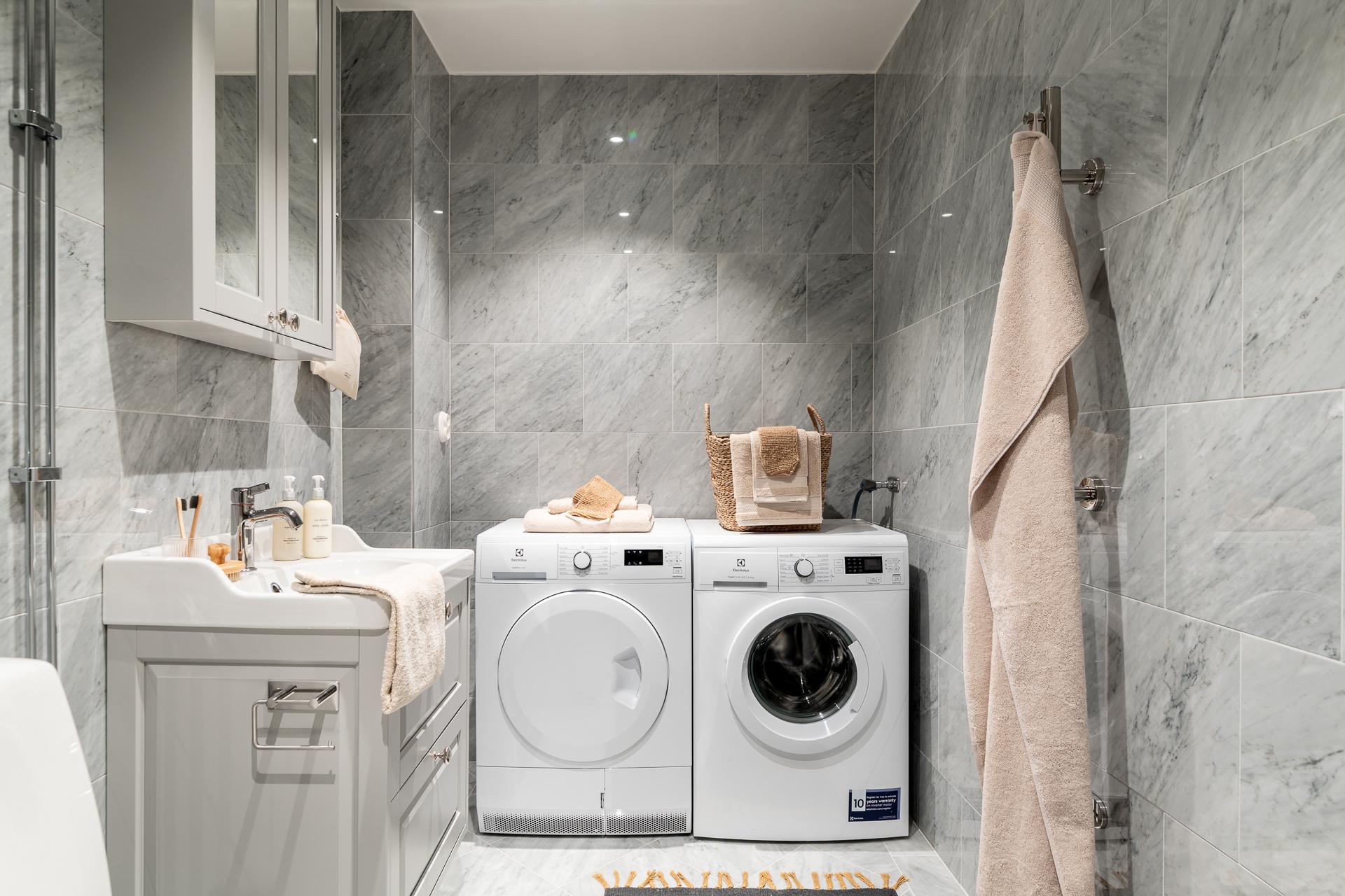 Det andra badrummet är rymligt och välutrustat, med allt som behövs för en smidig vardag. Här finns dusch, wc, handfat samt både tvättmaskin och torktumlare. Golvvärmen ger en extra dimension av komfort och gör rummet lika funktionellt som behagligt att vistas i.