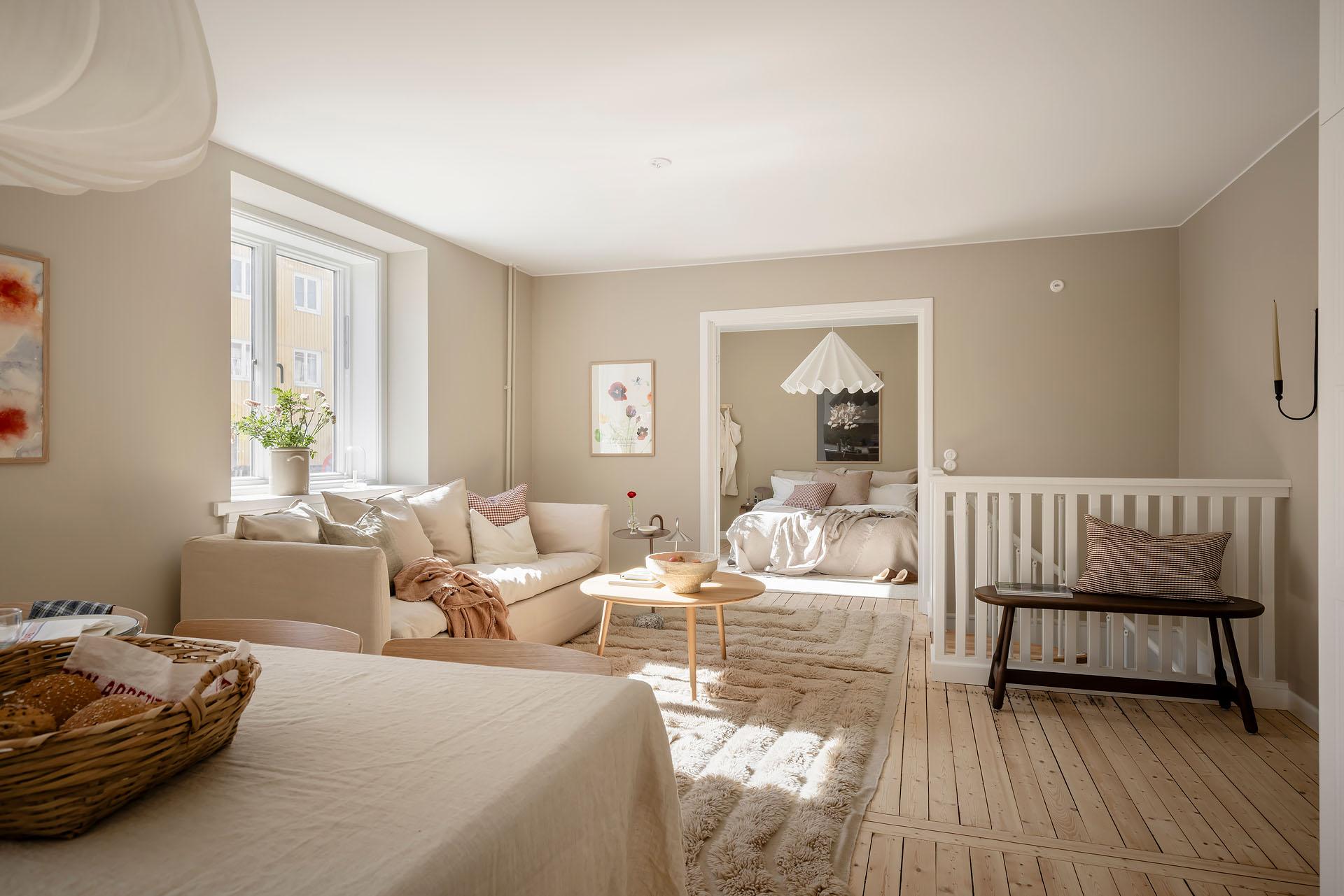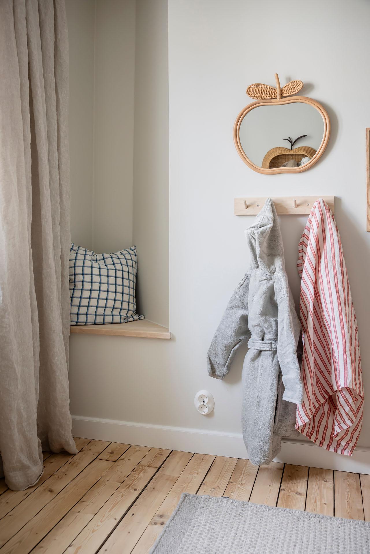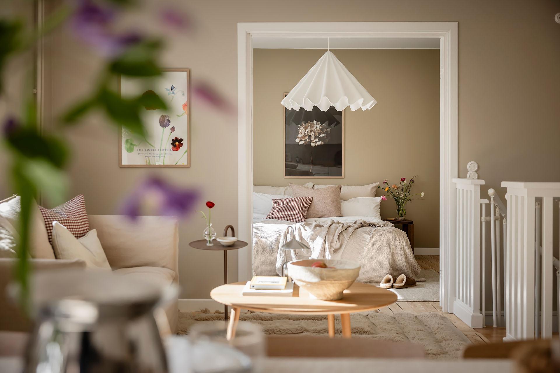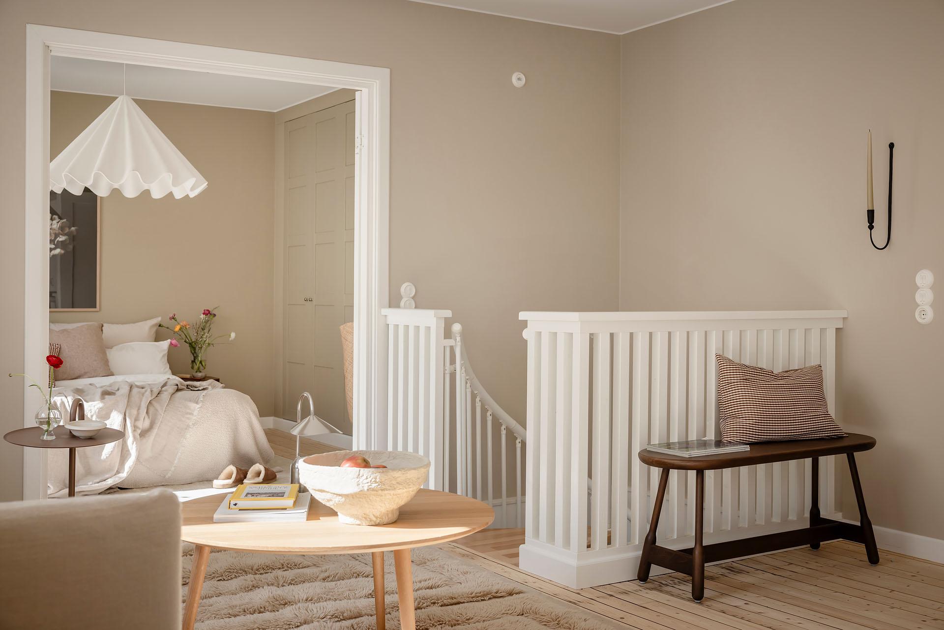 Det är lätt att föreställa sig en långsam helgmorgon här, hur ljuset letar sig in och hur man i lugn och ro vaknar till ljudet av morgonbestyr från köket och doften av nybryggt kaffe som någon mer morgonpigg redan tagit hand om.
