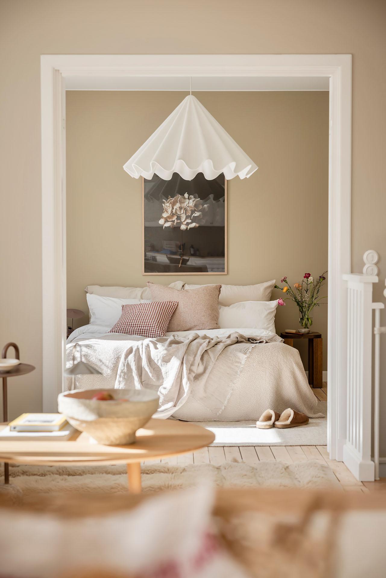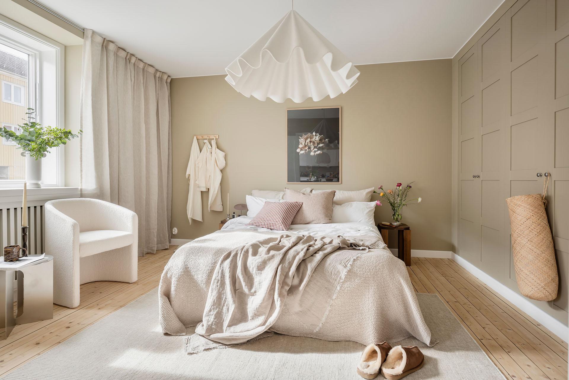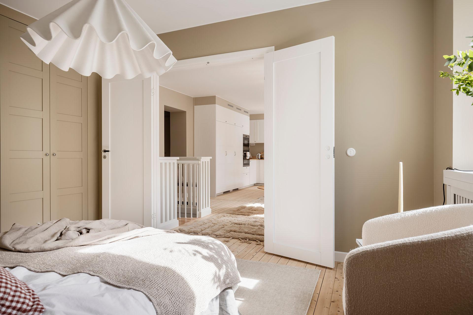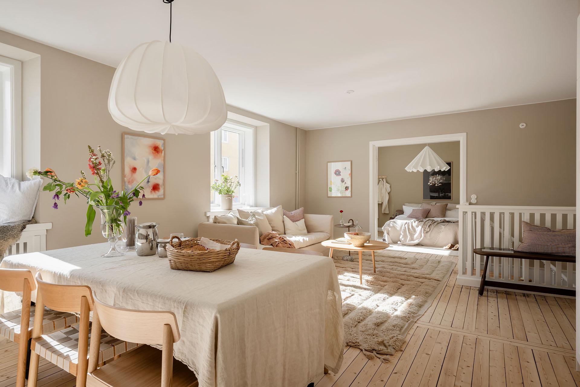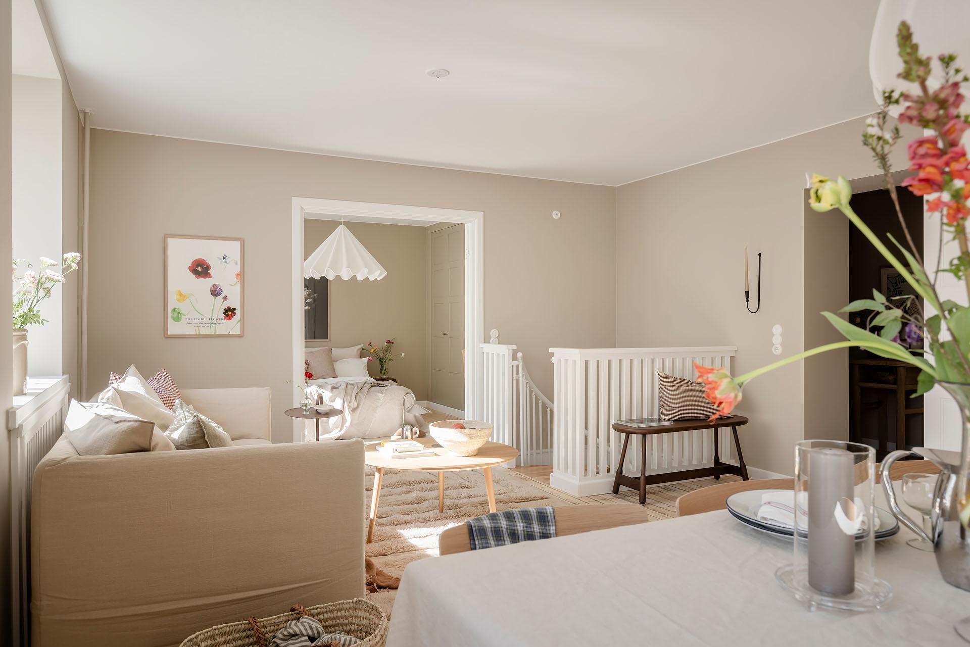 Det är lätt att föreställa sig en långsam helgmorgon här, hur ljuset letar sig in och hur man i lugn och ro vaknar till ljudet av morgonbestyr från köket och doften av nybryggt kaffe som någon mer morgonpigg redan tagit hand om.