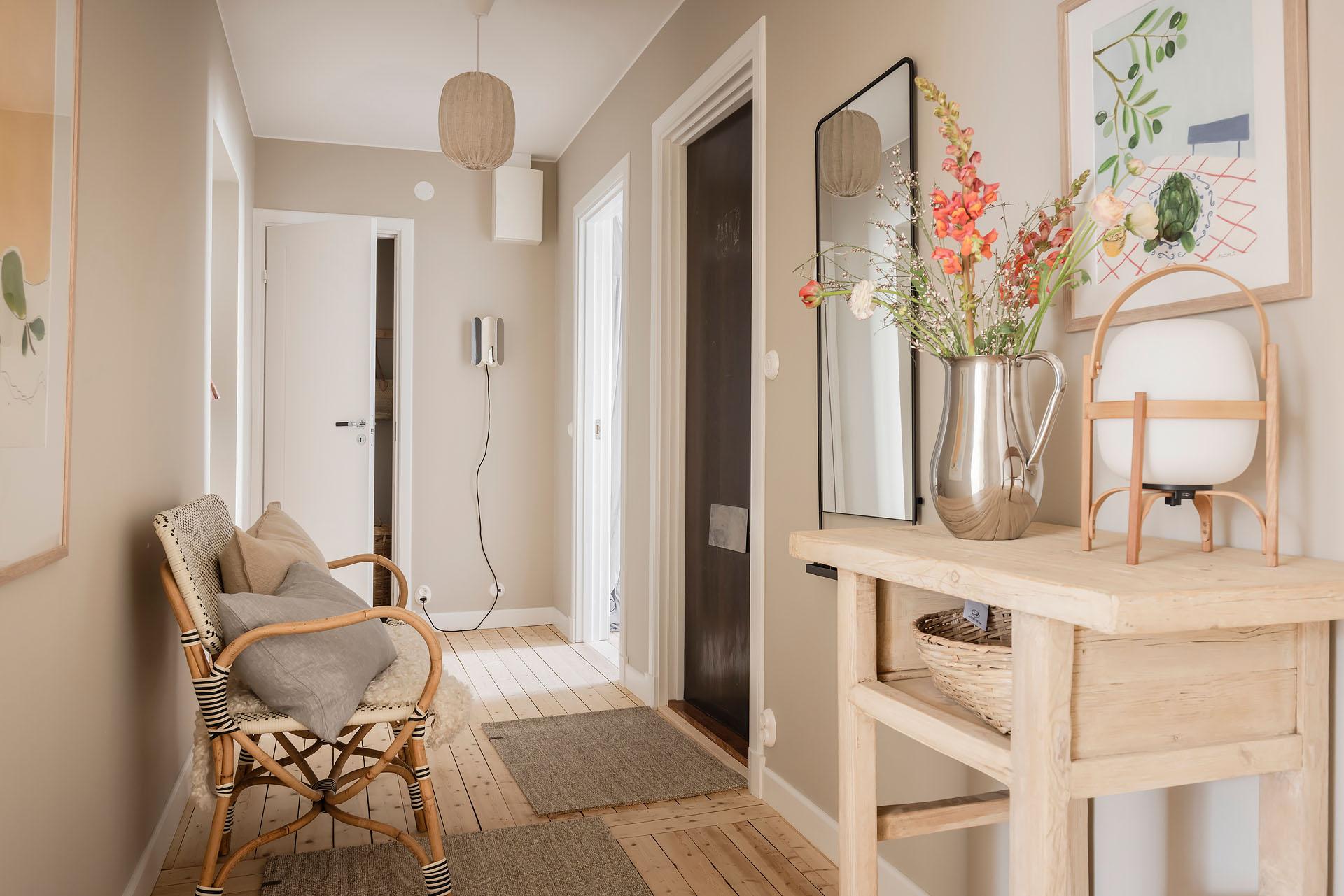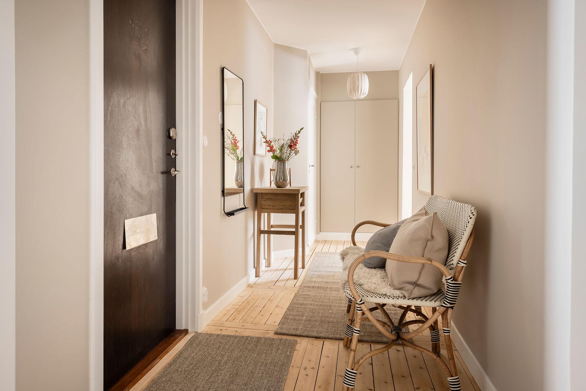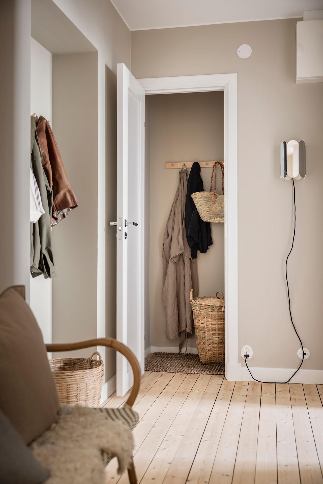 En välkomnande entré med gott om plats att landa. Här finns generösa förvaringsmöjligheter i form av en rymlig klädkammare samt två inbyggda garderober, vilket gör det enkelt att hålla ordning i vardagen. Utöver detta finns utrymme för en avhängningslösning för ytterkläder och skor. De såpskurade brädgolven löper vidare in i bostaden och sätter tonen direkt med sin varma och levande karaktär.