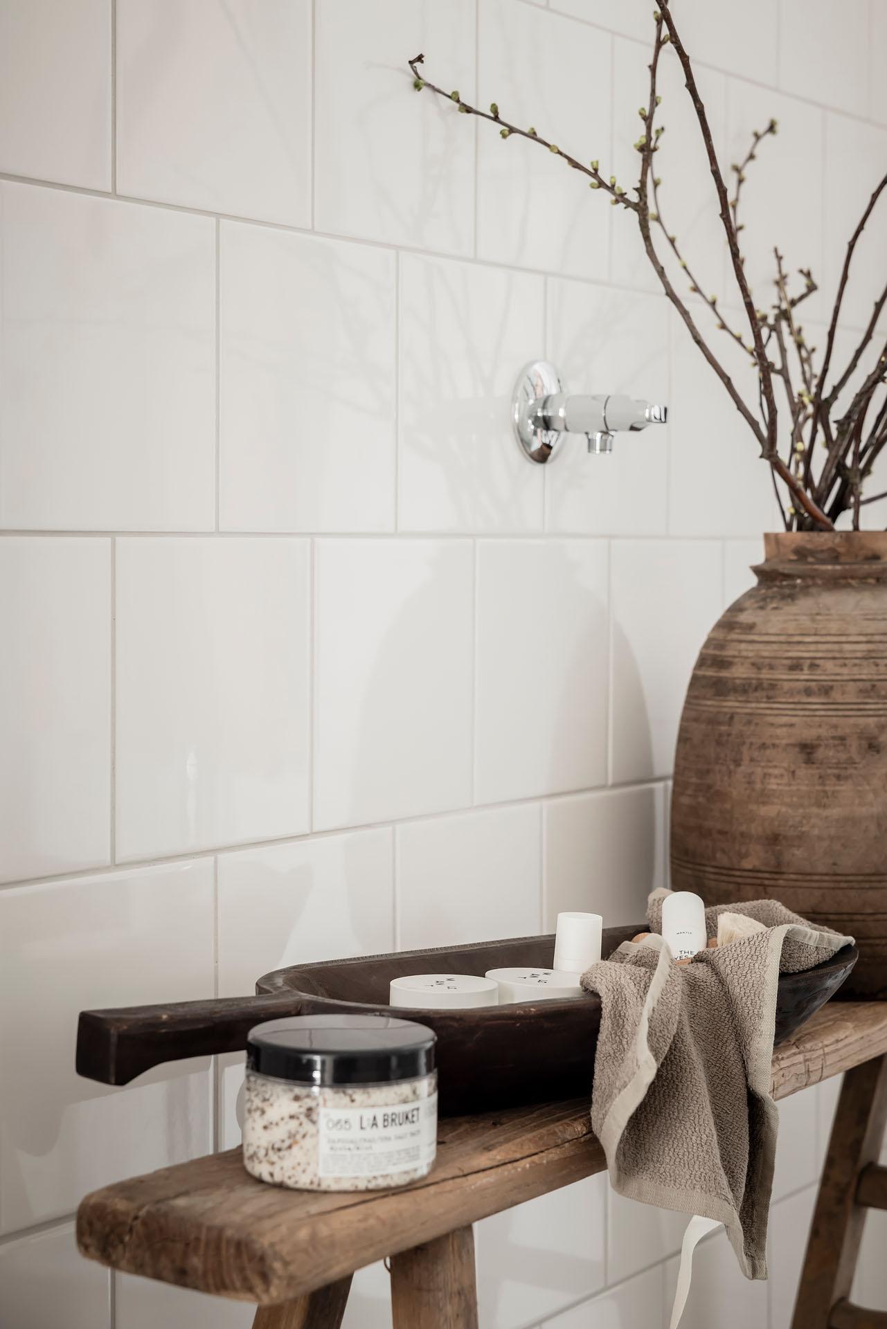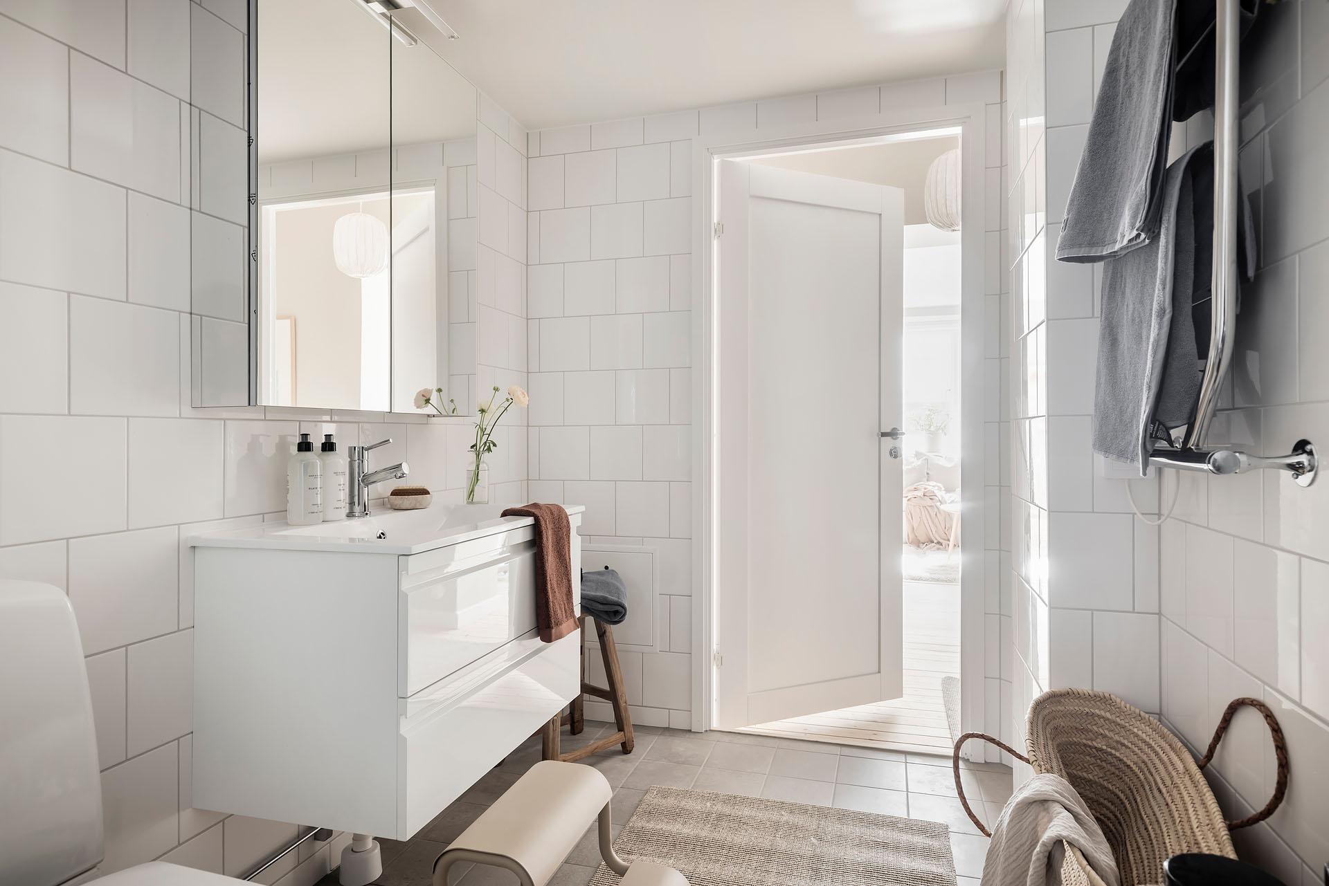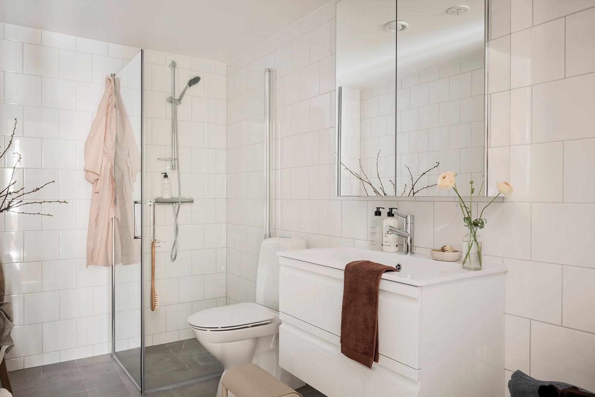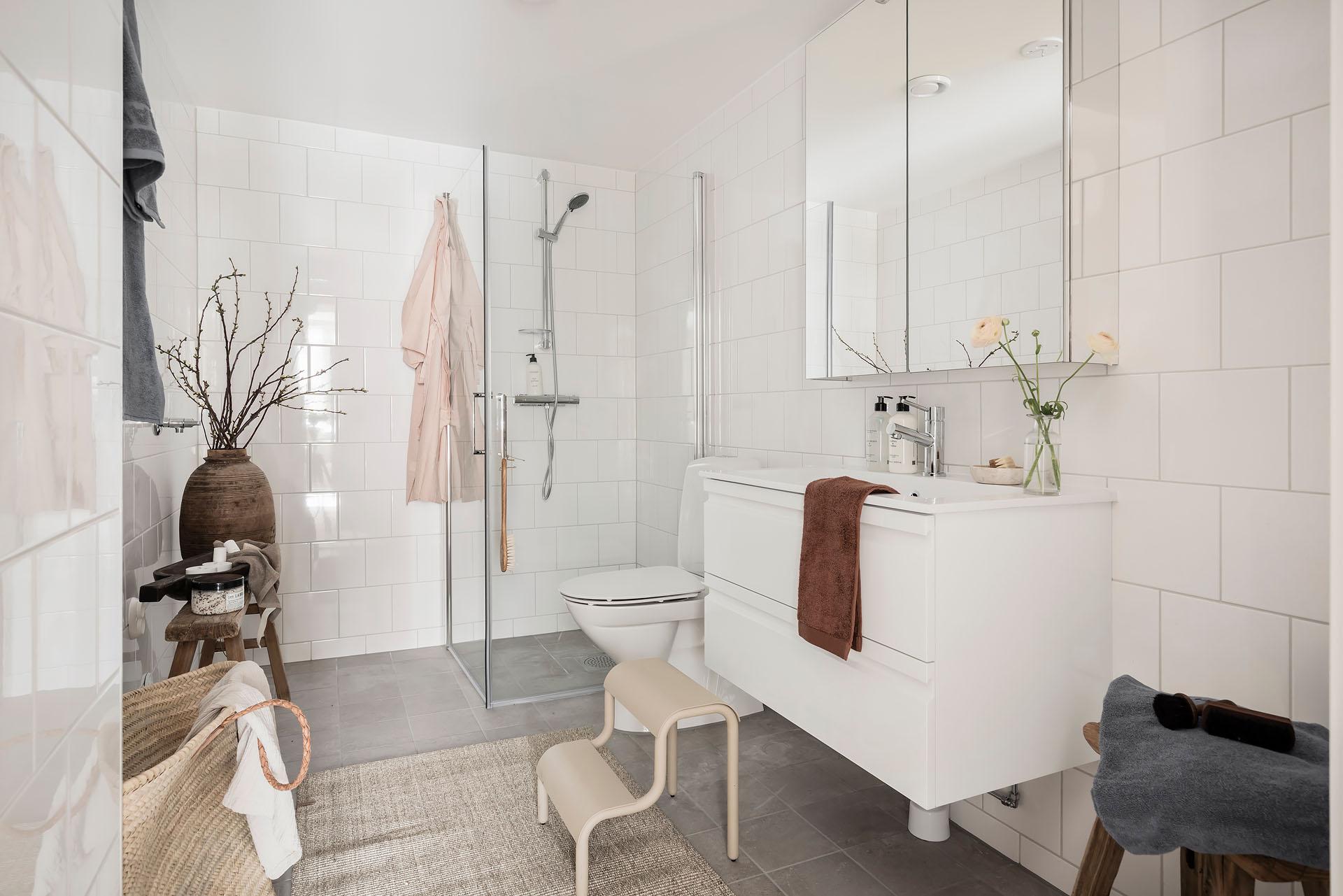 Ett generöst tilltaget badrum. Helkaklade väggar möter uppvärmt klinkergolv i en lugn och tidlös färgsättning, vilket skapar en harmonisk och påkostad känsla. Badrummet är förberett för tvättmaskin, vilket gör det enkelt att komplettera med egen tvättlösning och ytterligare höja bekvämligheten. Kvalitetsdokument finns.